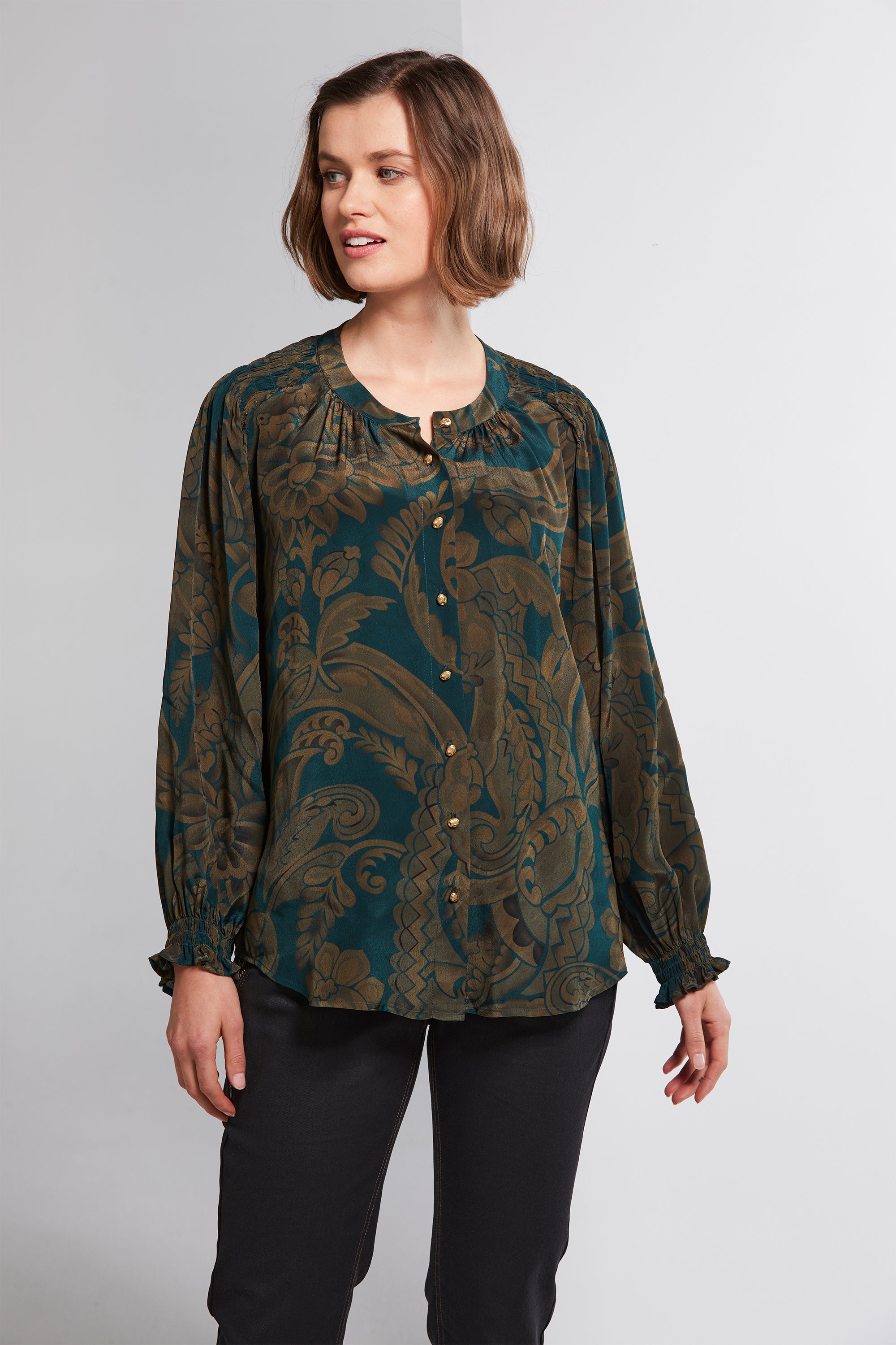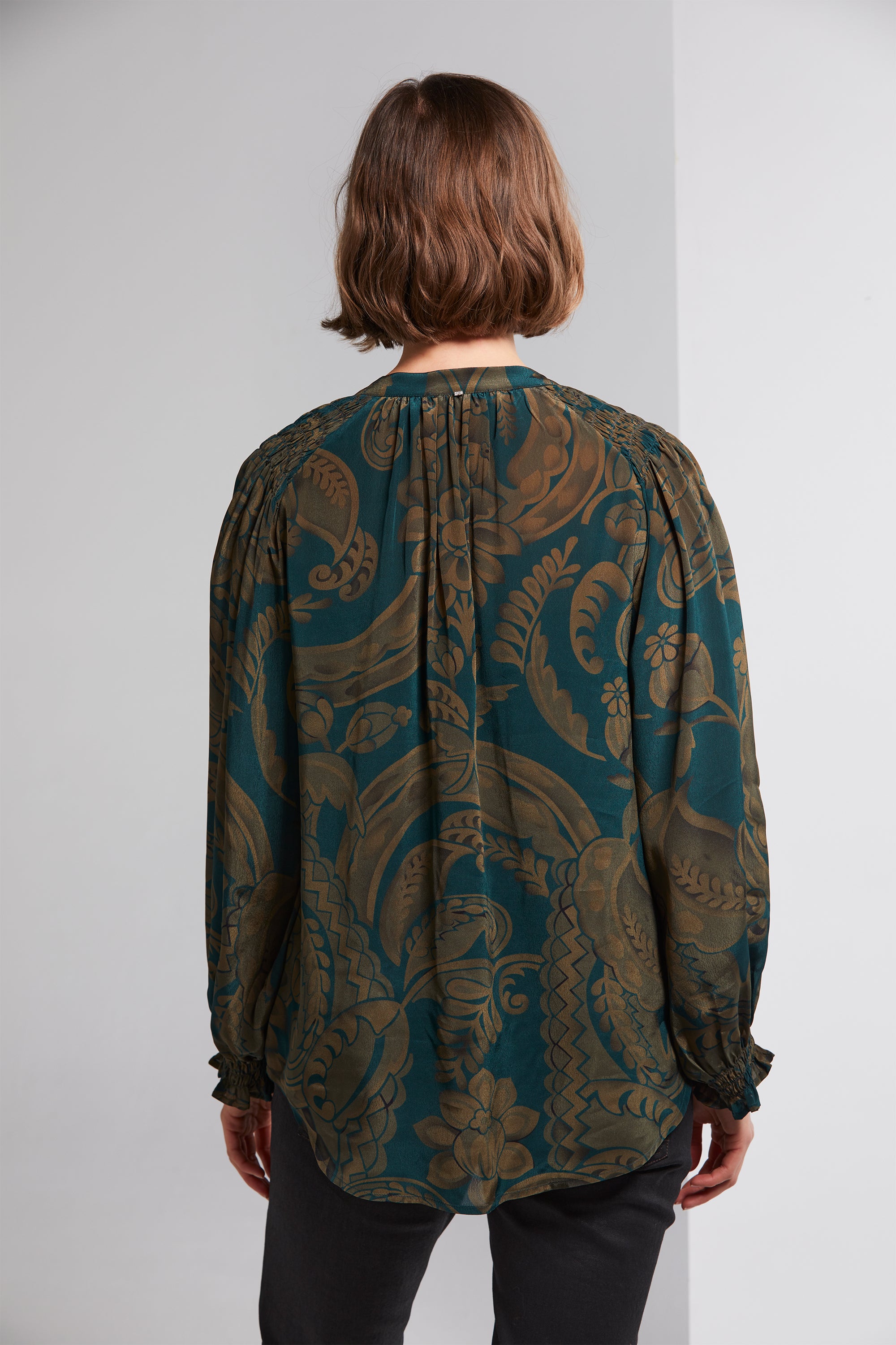 Immerse yourself in the allure of the Desert Shirt, a viscose georgette shirt adorned with a rich sophisticated print. Delicate shirred detailing graces the top sleeves, while a softly gathered neckline adds a touch of elegance.