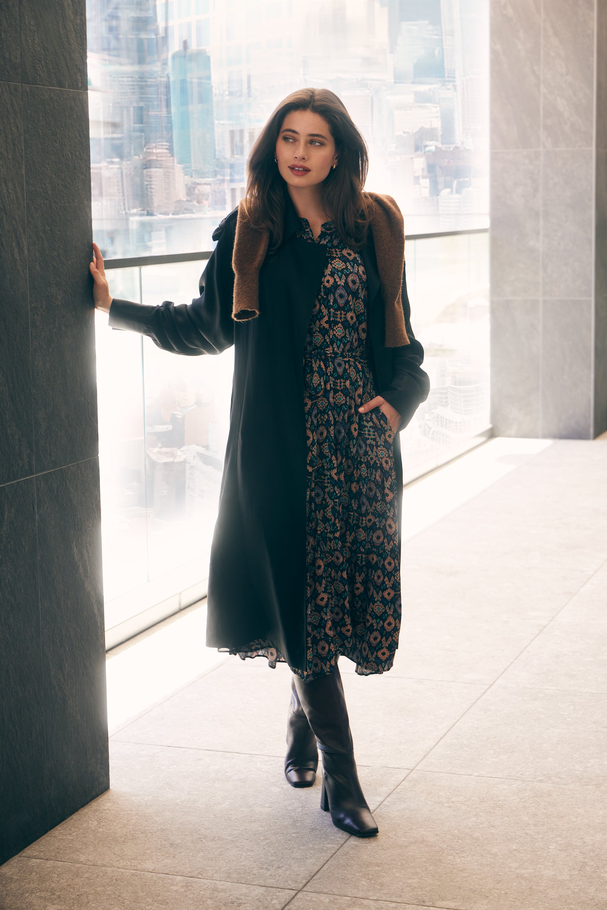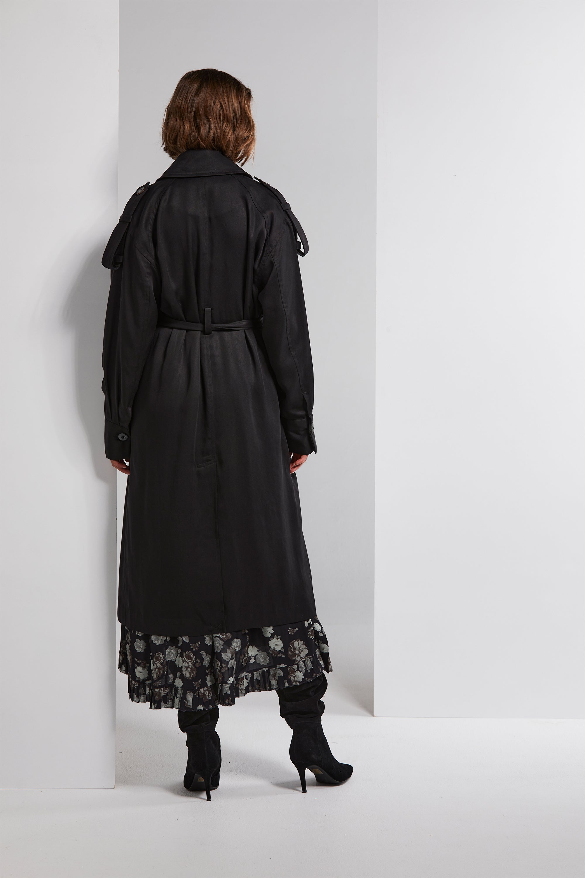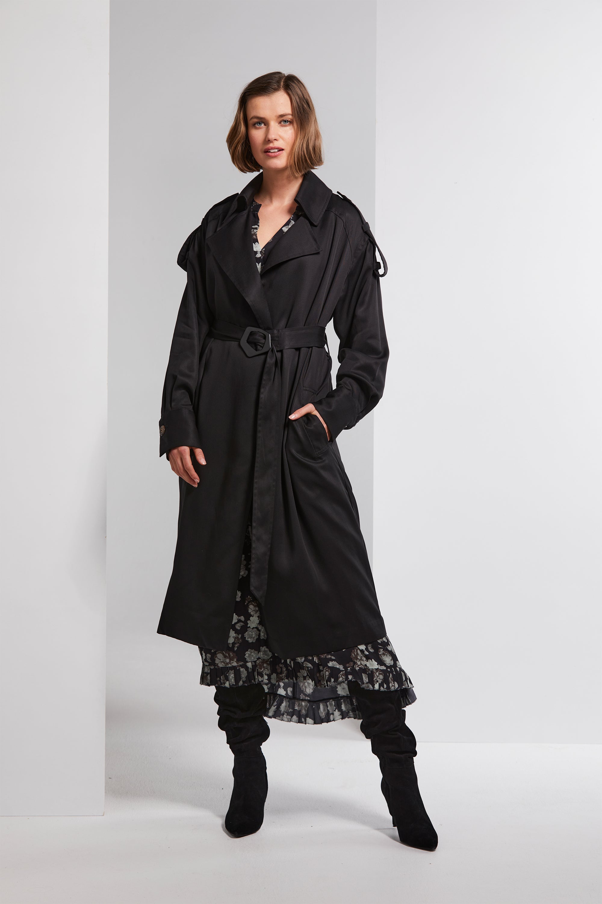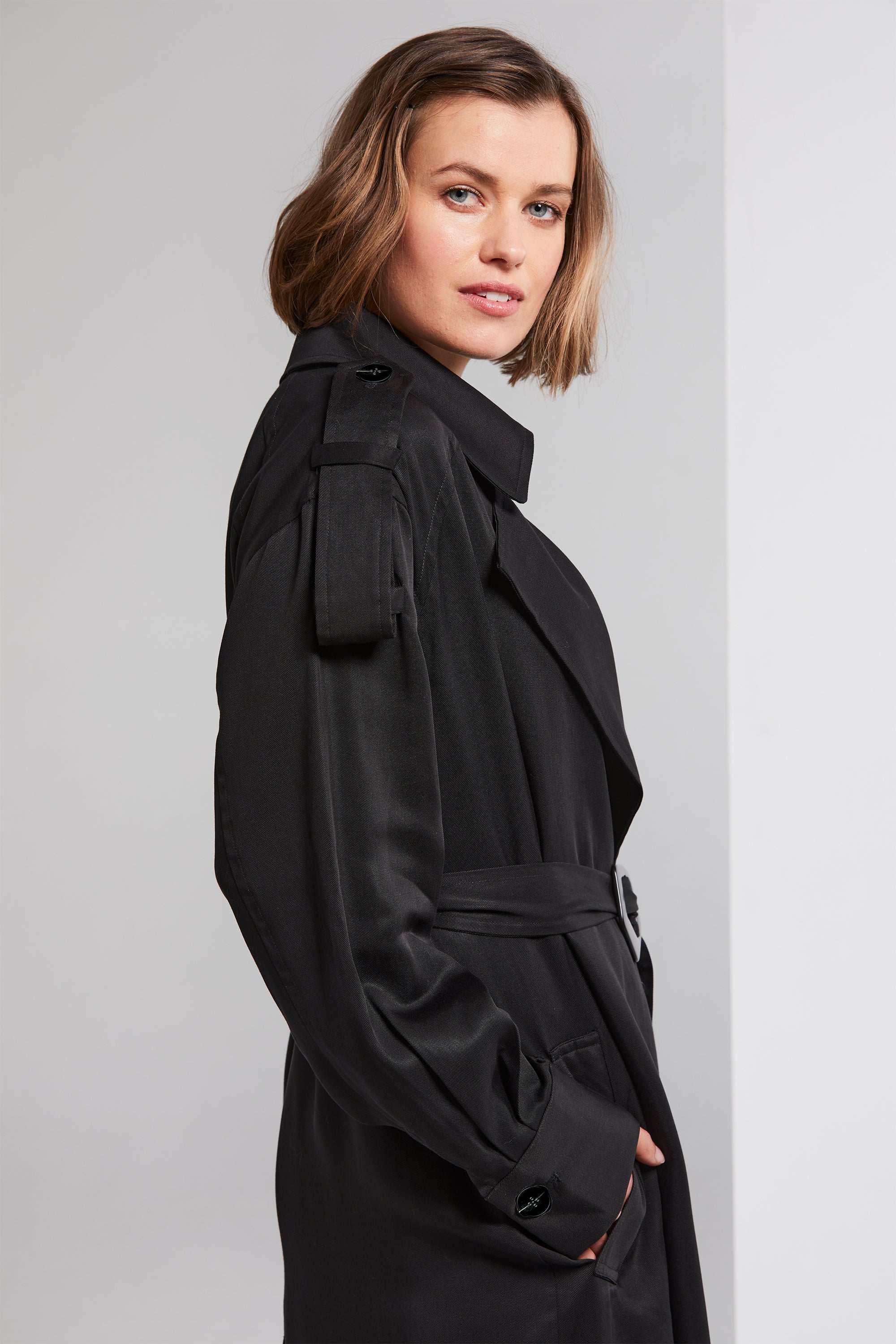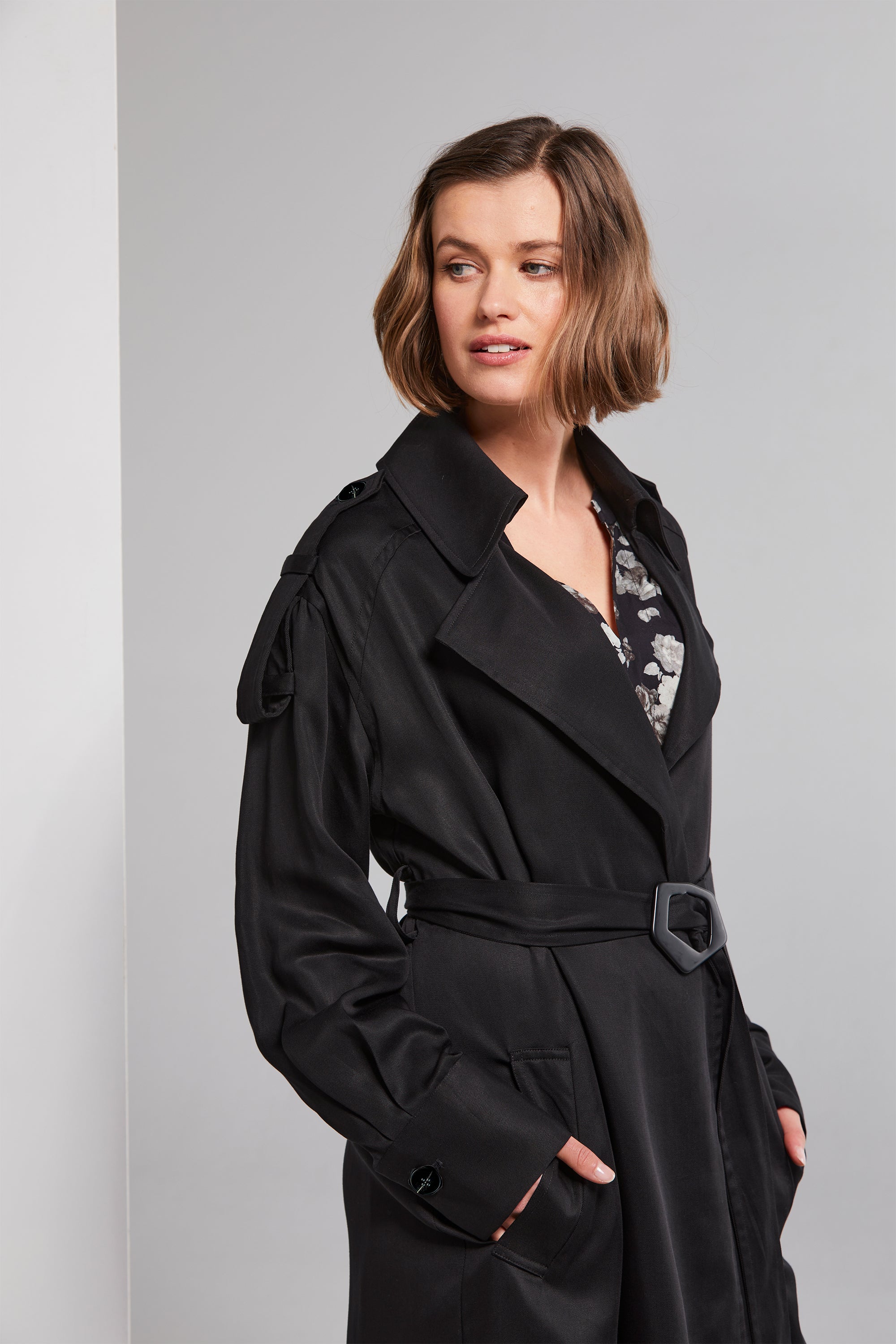 The sophisticated on-trend trench coat your wardrobe has been waiting for. Longline trench in luxe tencel fabric with extended shoulder tab detailing fastened with black tortoiseshell flat buttons. Includes asymmetrical black buckle adjustable belt. Dress it up over a dress out for dinner or wear it over jeans.
