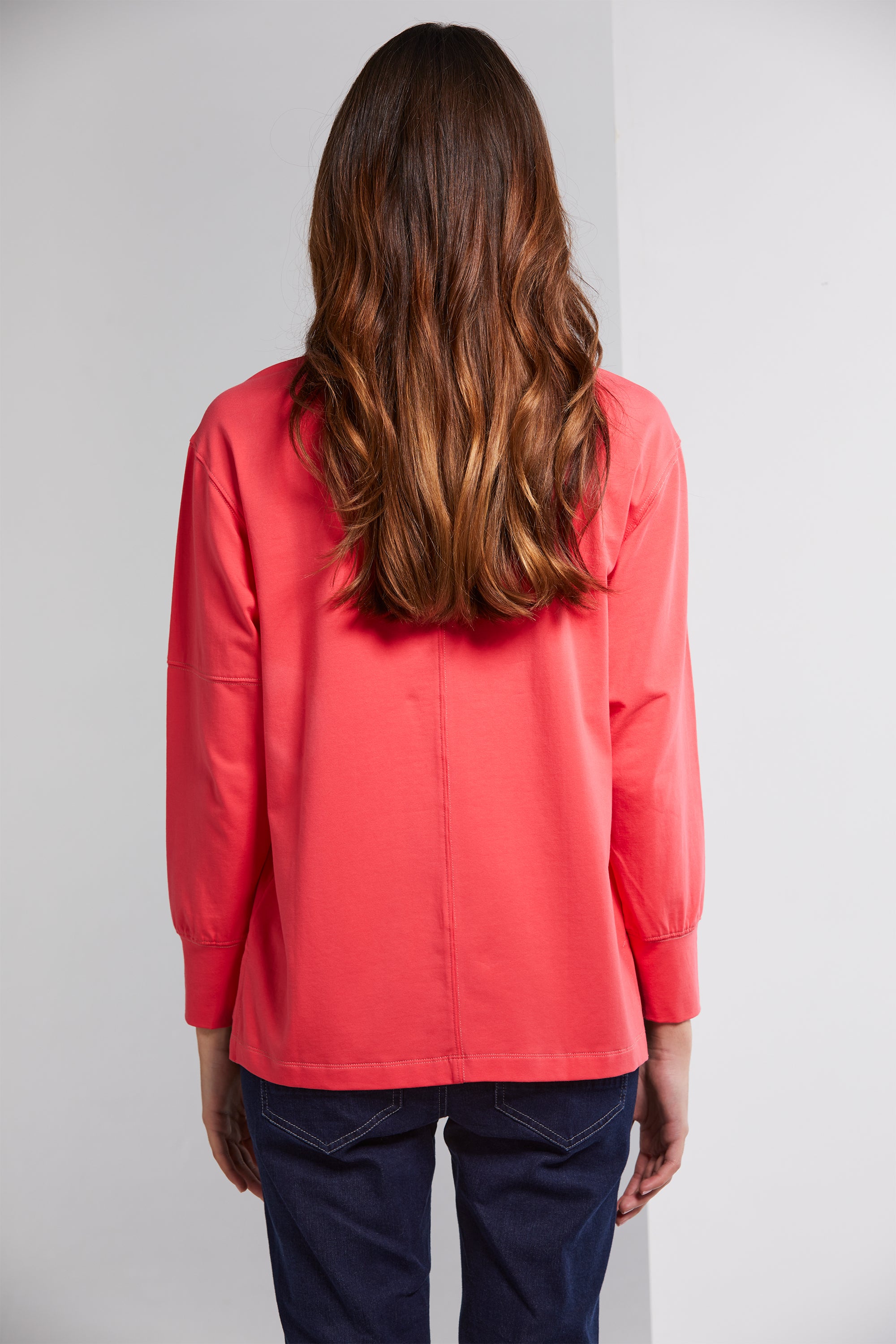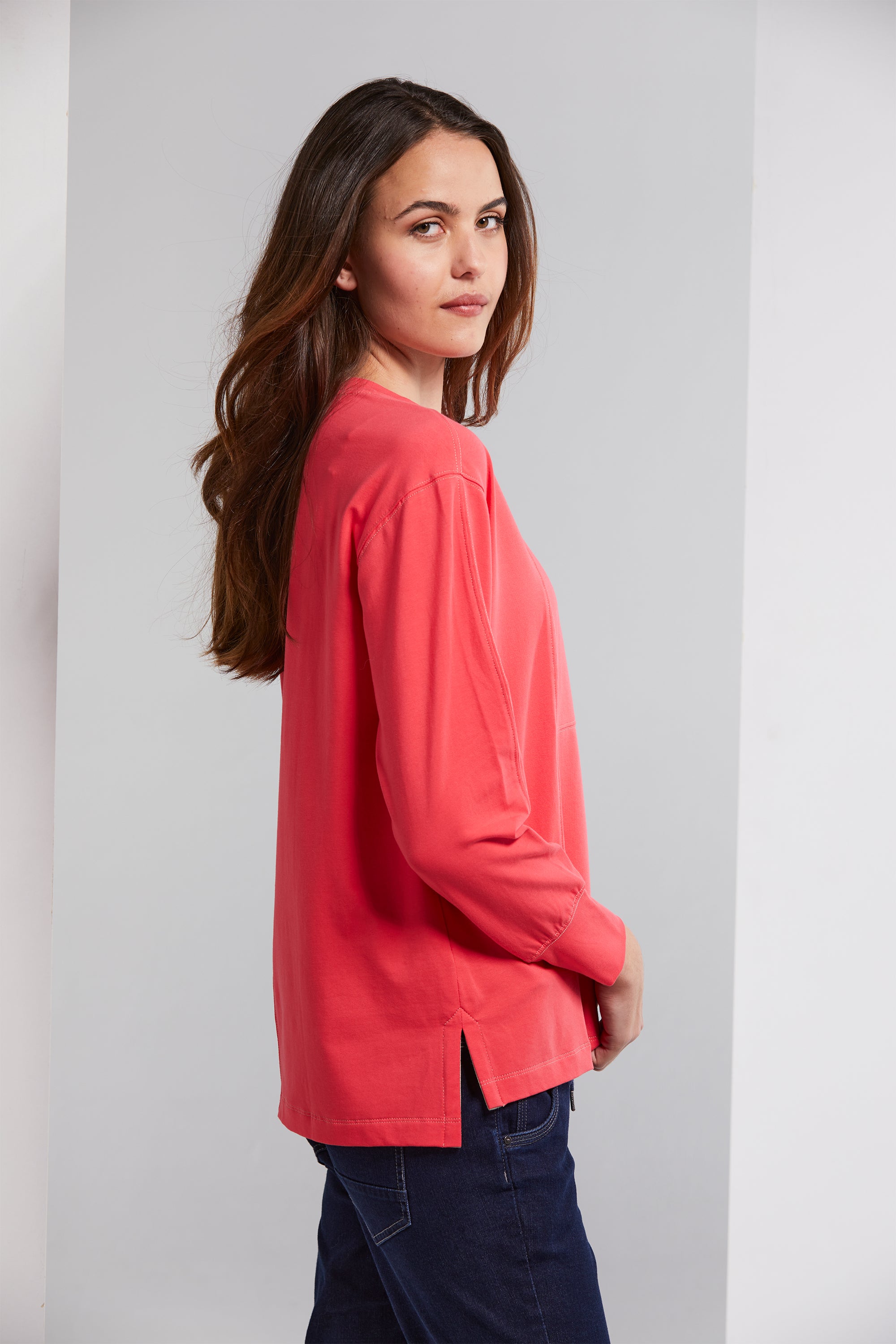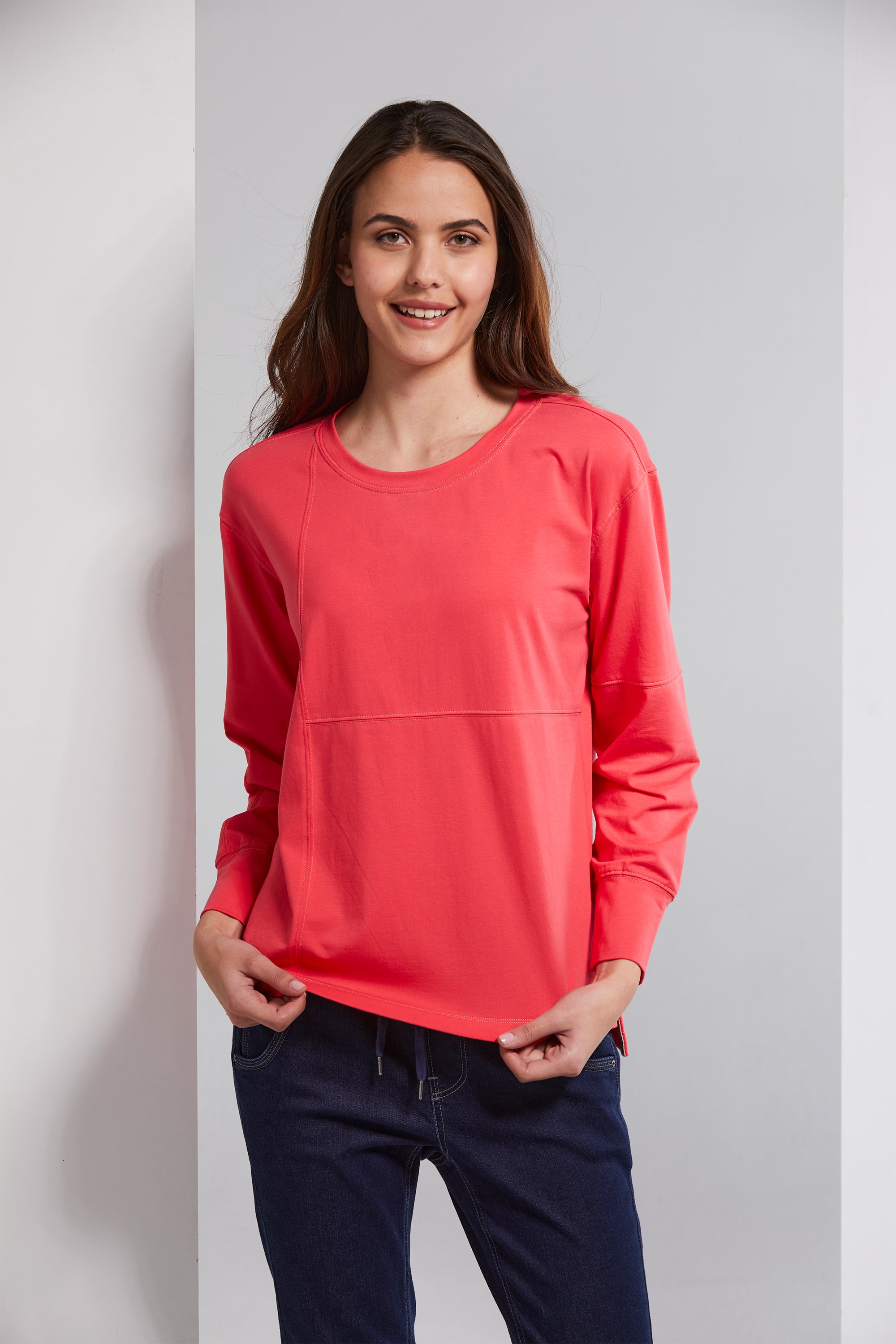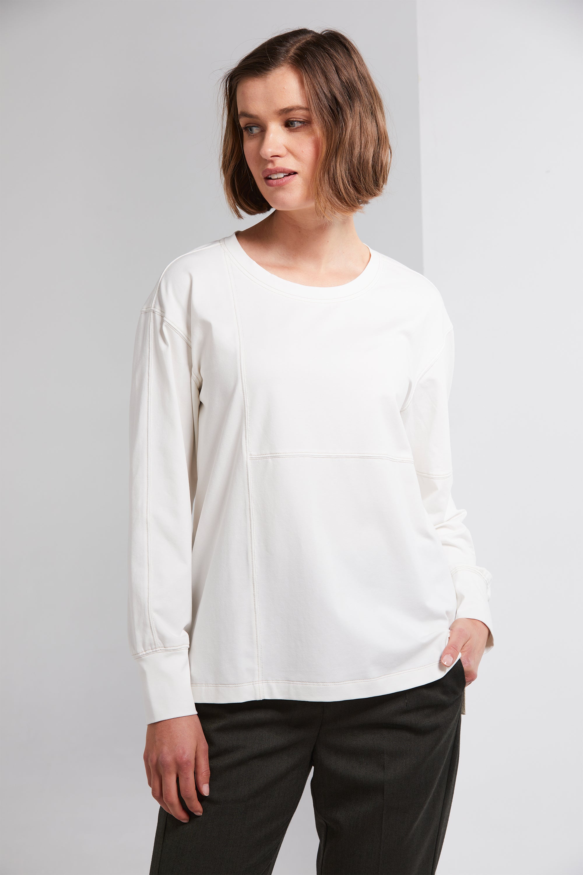 Elevate your casual wardrobe with the Emerson Top. Crafted from a soft cotton knit, it features a classic crew neckline and unique asymmetrical panel lines highlighted by twin contrast topstitching. Complete with stylish side splits at the hem, this top is your go-to for a casual yet chic look.