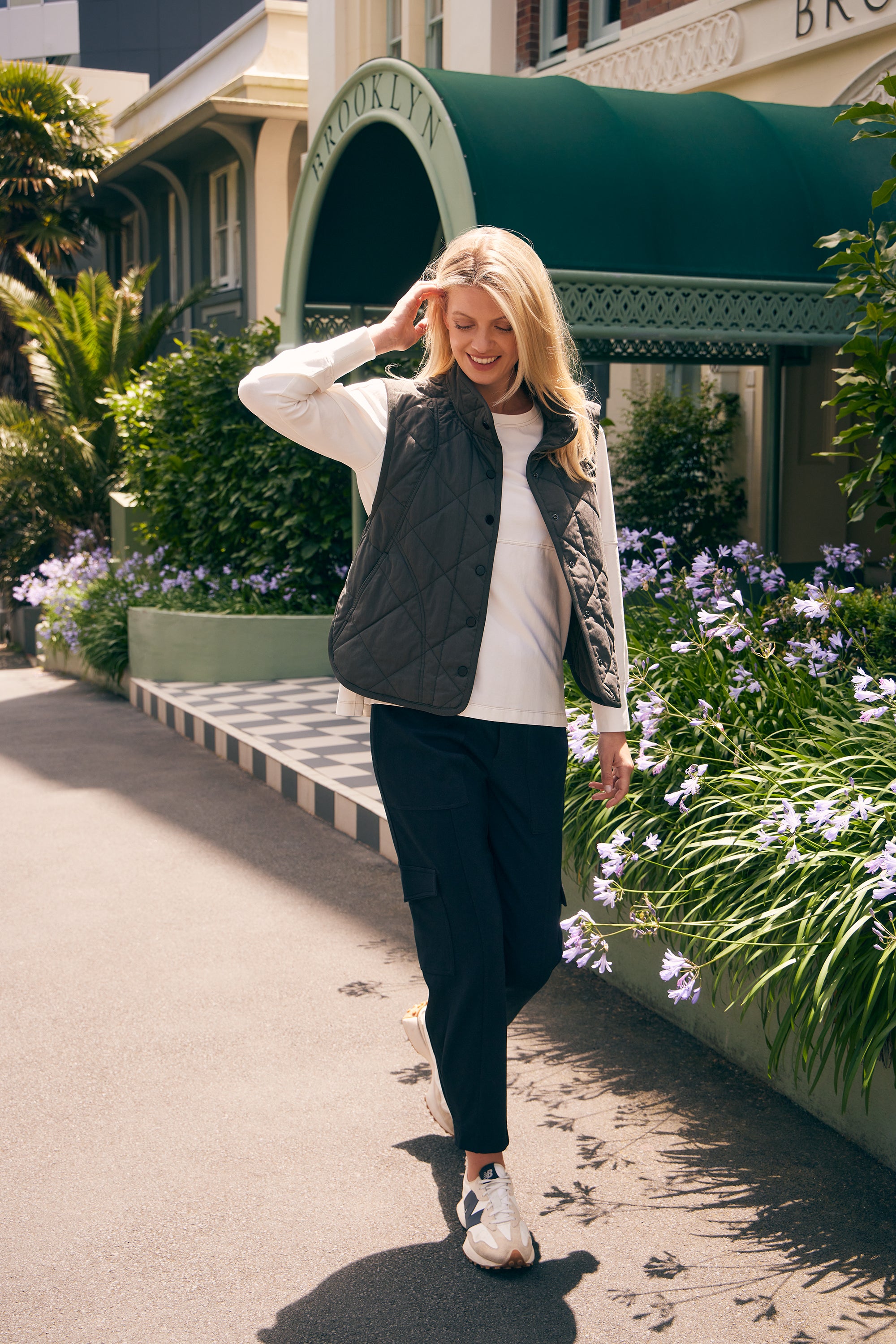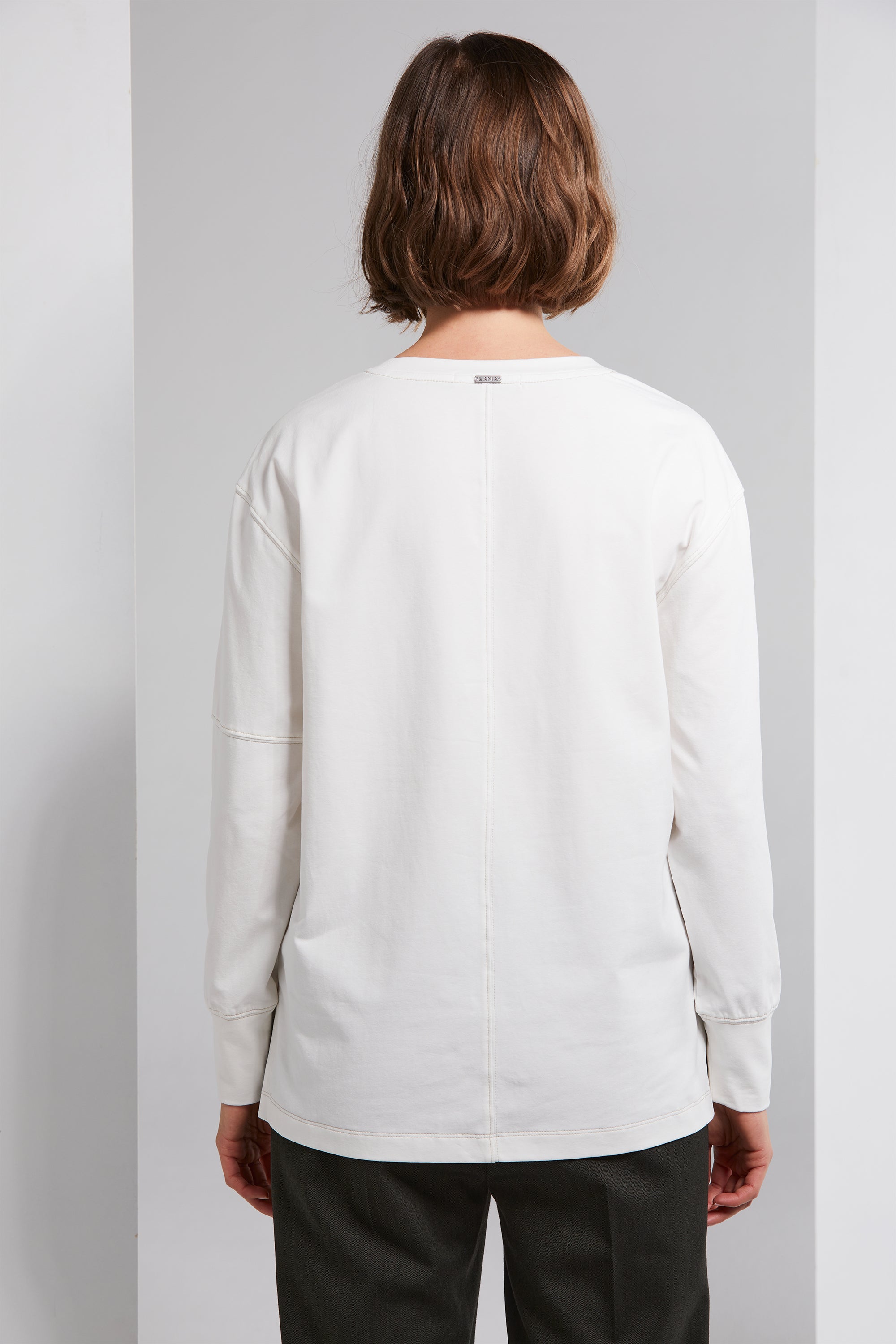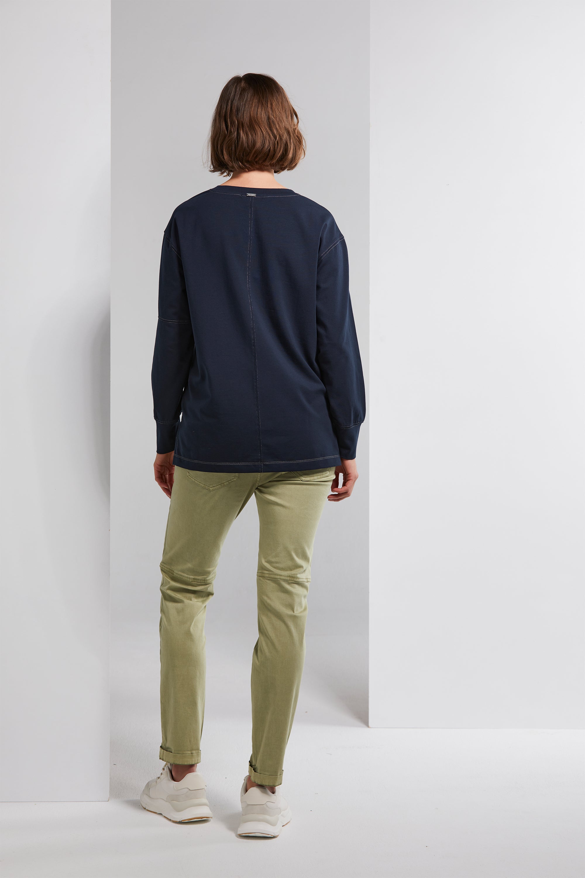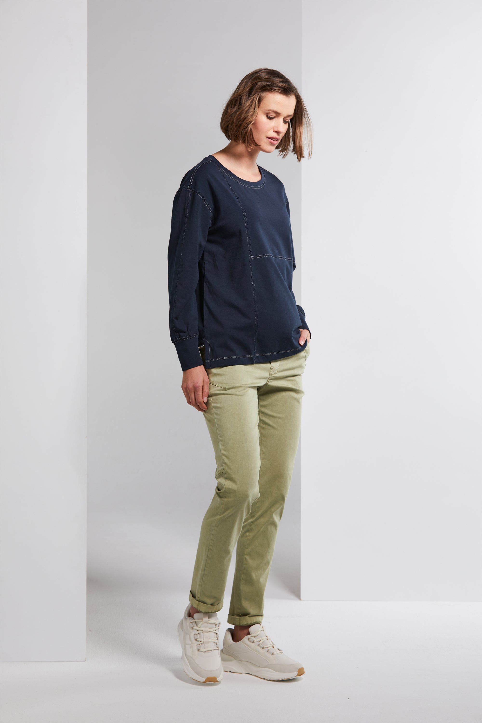 Elevate your casual wardrobe with the Emerson Top. Crafted from a soft cotton knit, it features a classic crew neckline and unique asymmetrical panel lines highlighted by twin contrast topstitching. Complete with stylish side splits at the hem, this top is your go-to for a casual yet chic look.
