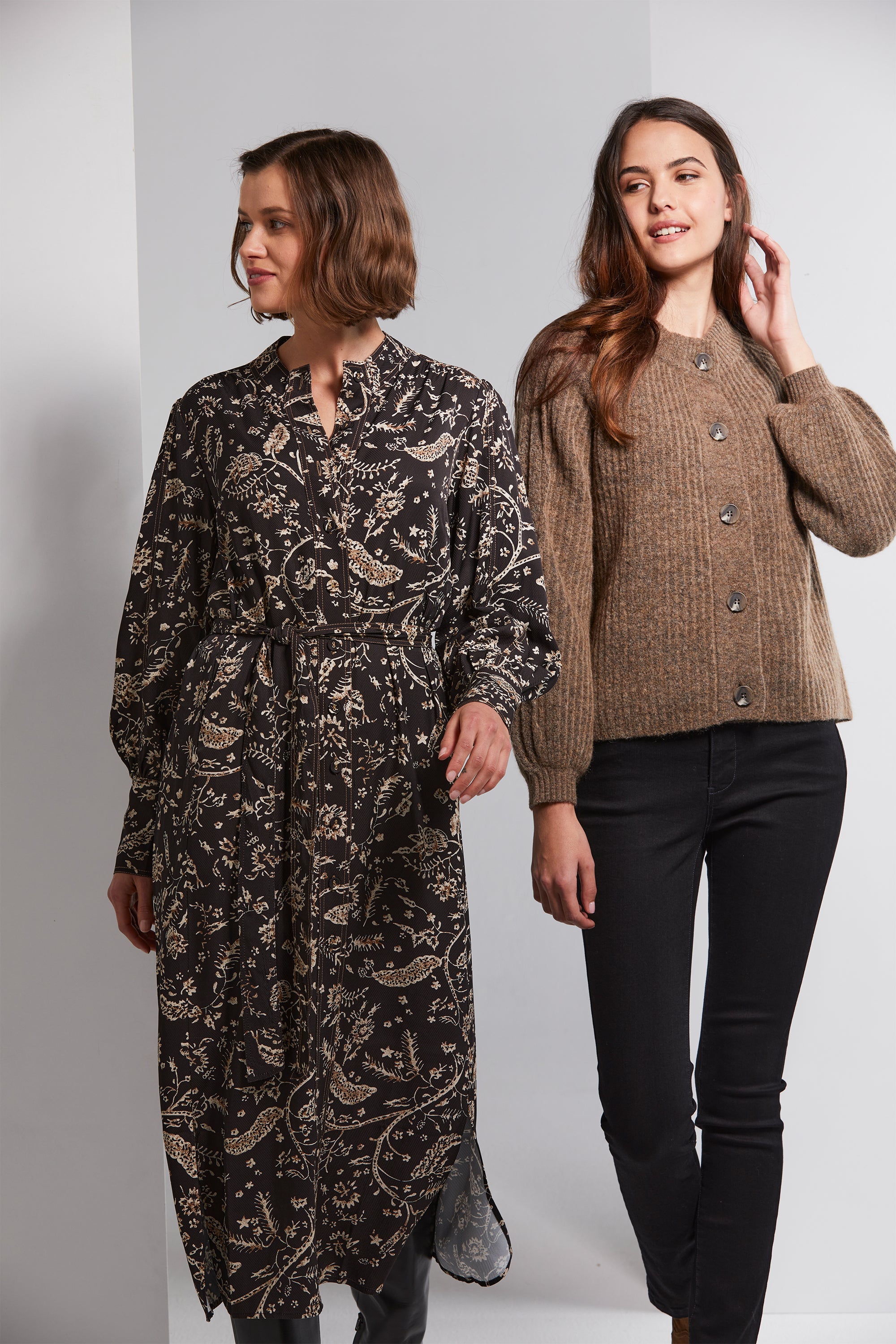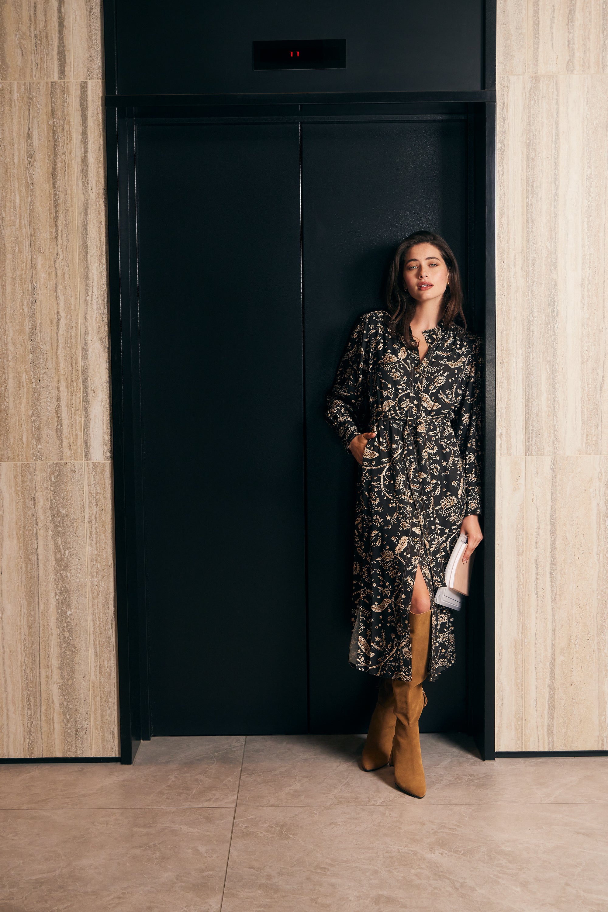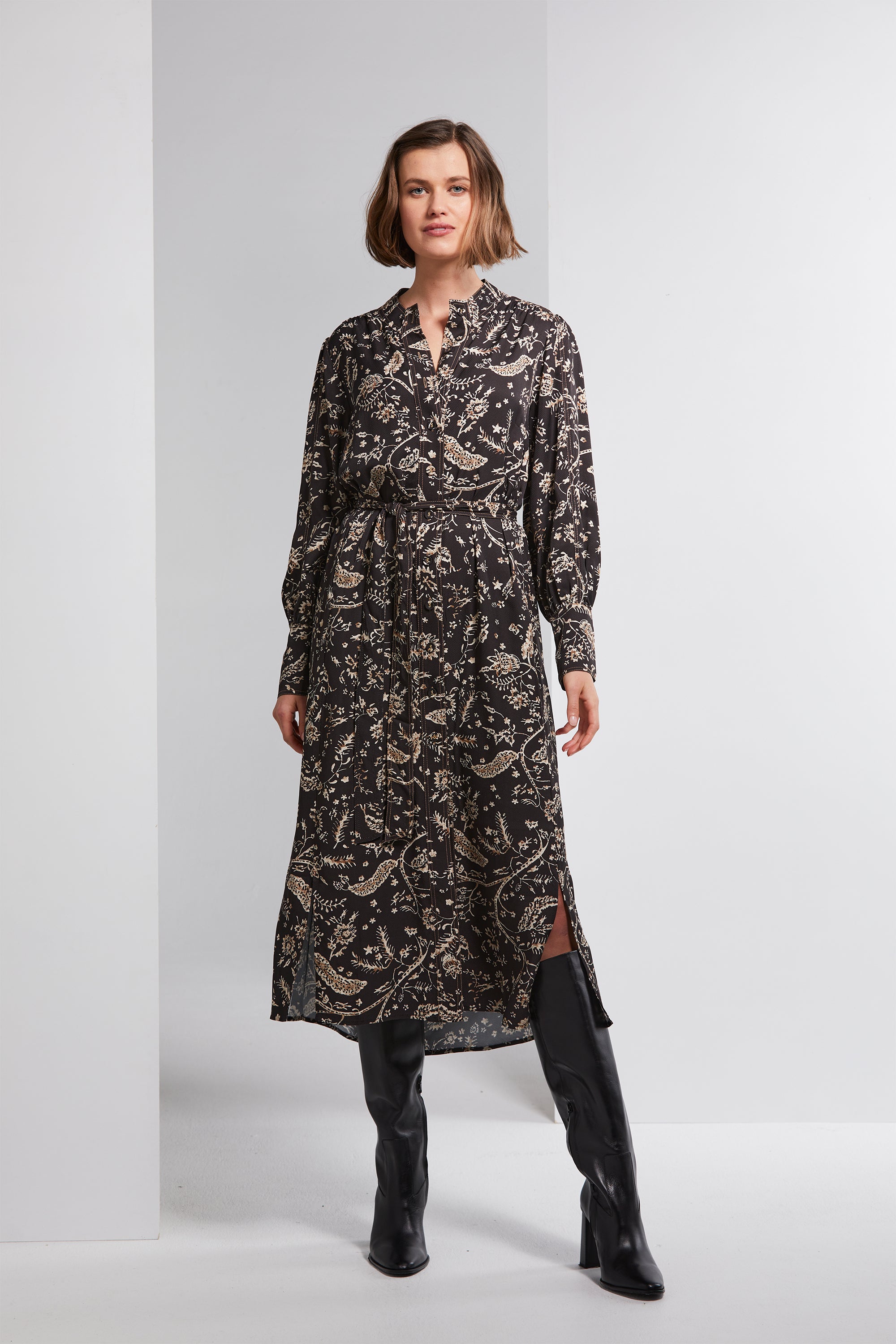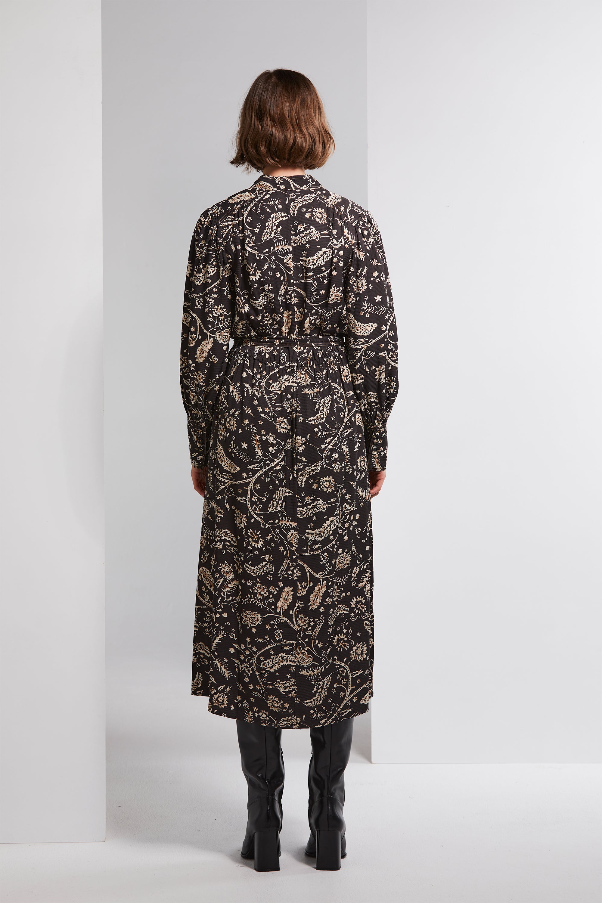 Elevate your style with the Espresso Dress, a printed viscose shirt dress featuring a sophisticated tonal print on a dark base. The collared neckline and full, floaty sleeves exude timeless charm. Twin topstitching in tan gracefully highlights the design lines, while deep side splits and a removable printed fabric belt complete the look. This versatile dress transitions effortlessly from winter chic to a stylish layering piece when worn unbuttoned.