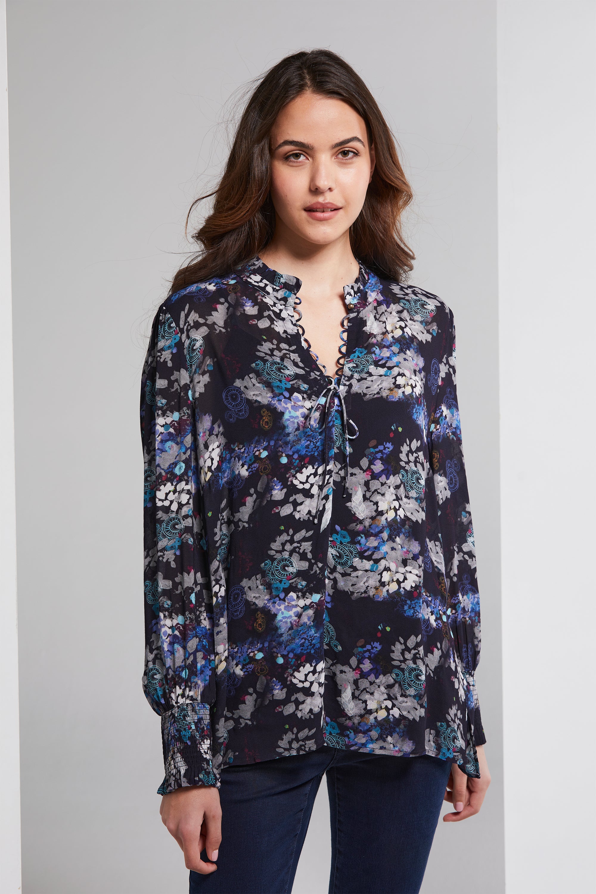 Crafted from floaty viscose rayon, the Freya Top blouse features a graceful ink print that catches the eye picking up tones of the collection. Its feminine rouleau loop neckline offers endless styling possibilities with its self-fabric rouleau tie. Softly gathered sleeves end in shirred cuffs, adding a touch of refinement, and a delicate ruffle adorns the neckline. Embrace effortless elegance with this versatile piece.