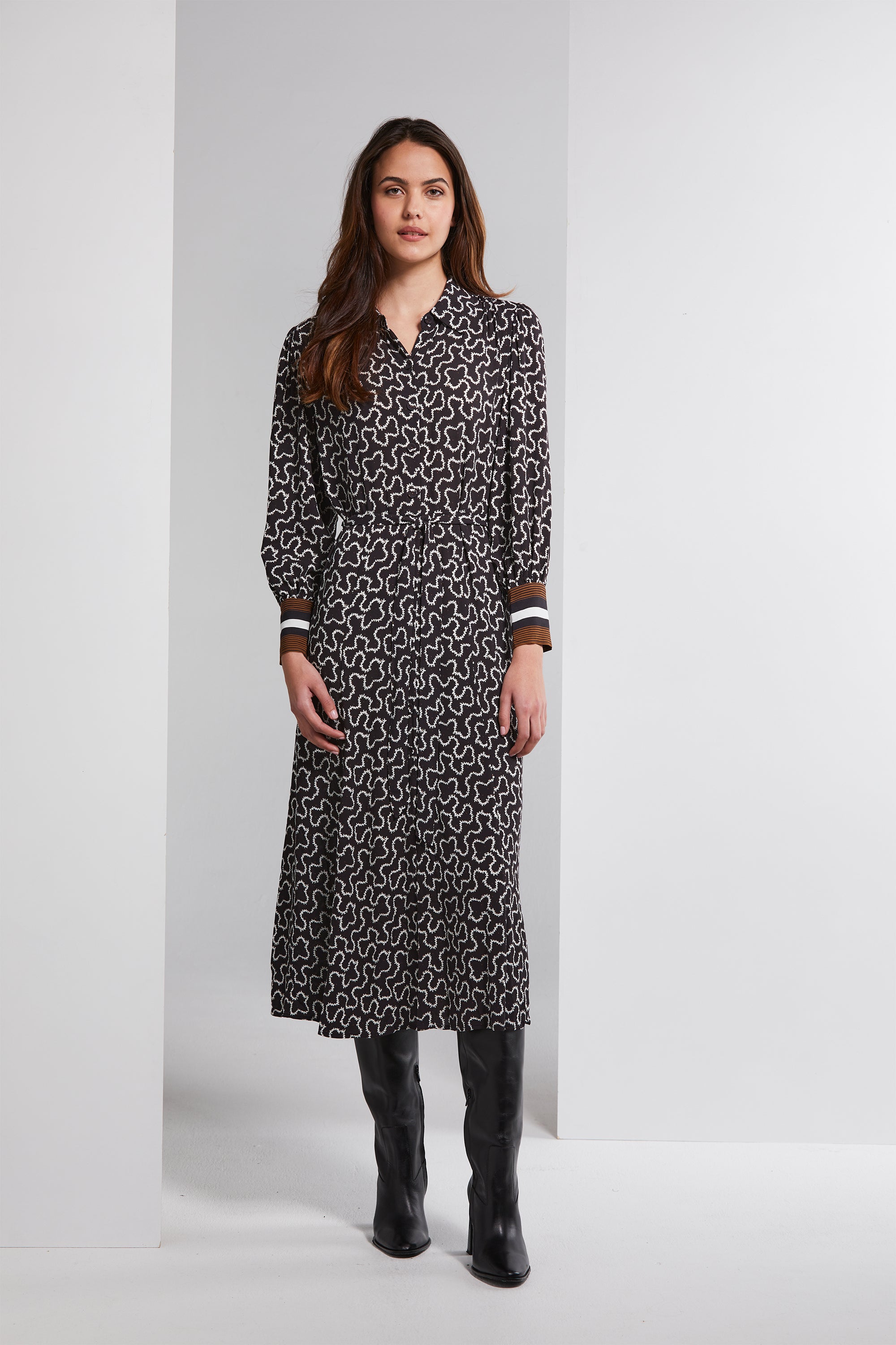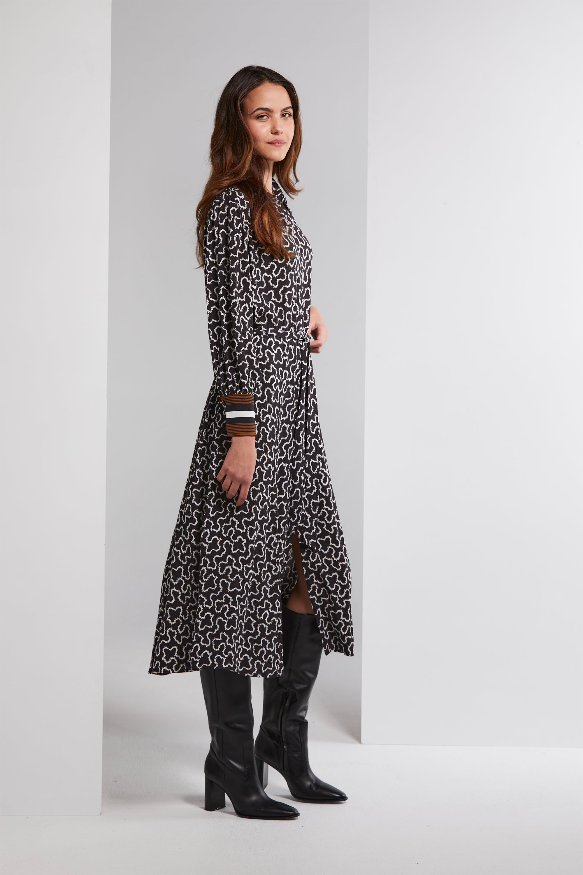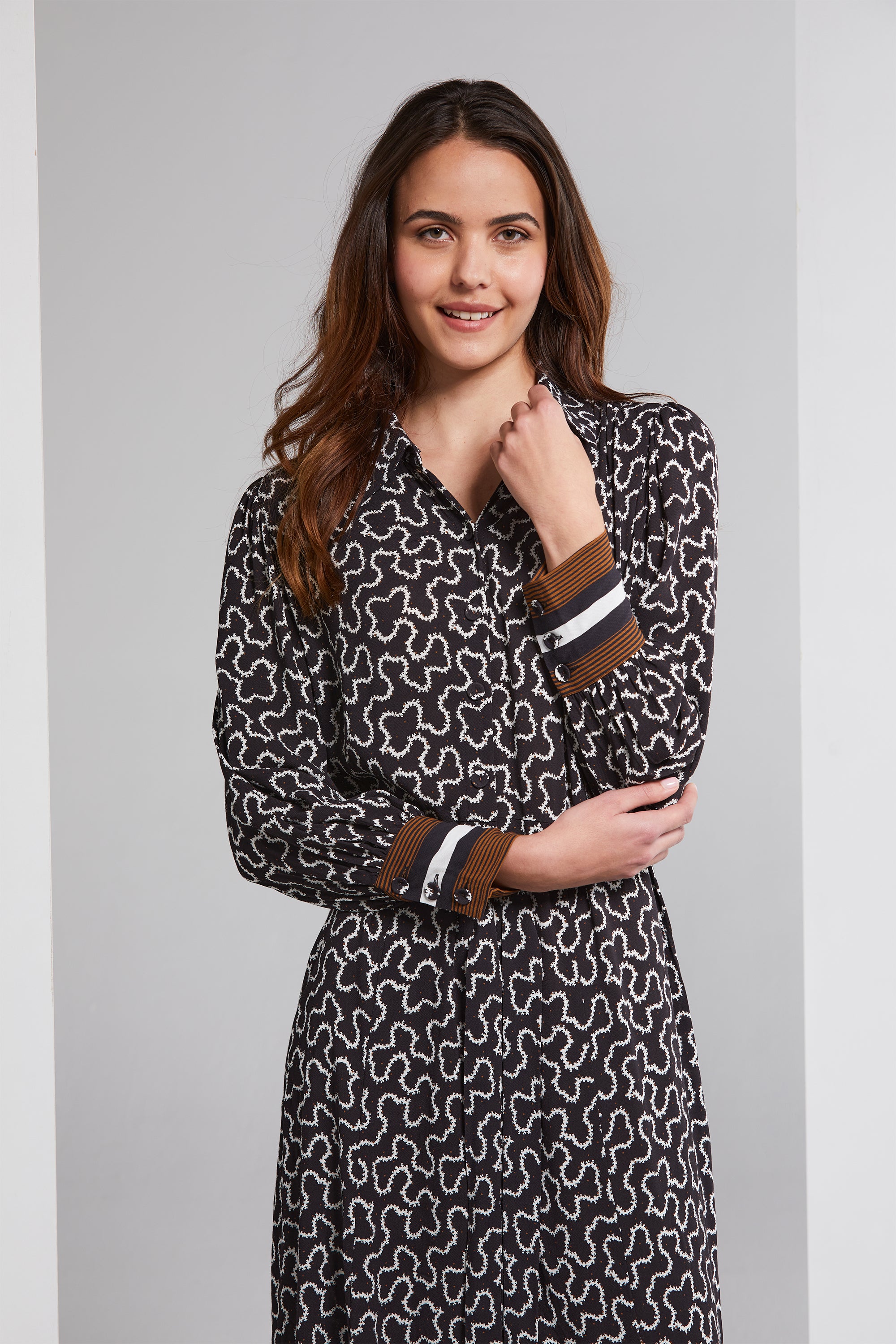 This shirt dress, made from a printed viscose rayon blend, boasts a captivating black and white natural geo print complemented by a tan spot. The dress features full floaty sleeves, a collared neckline, and a playful tan stripe at the cuffs. Adorned with self-covered buttons, it's a go-to piece for your wardrobe.