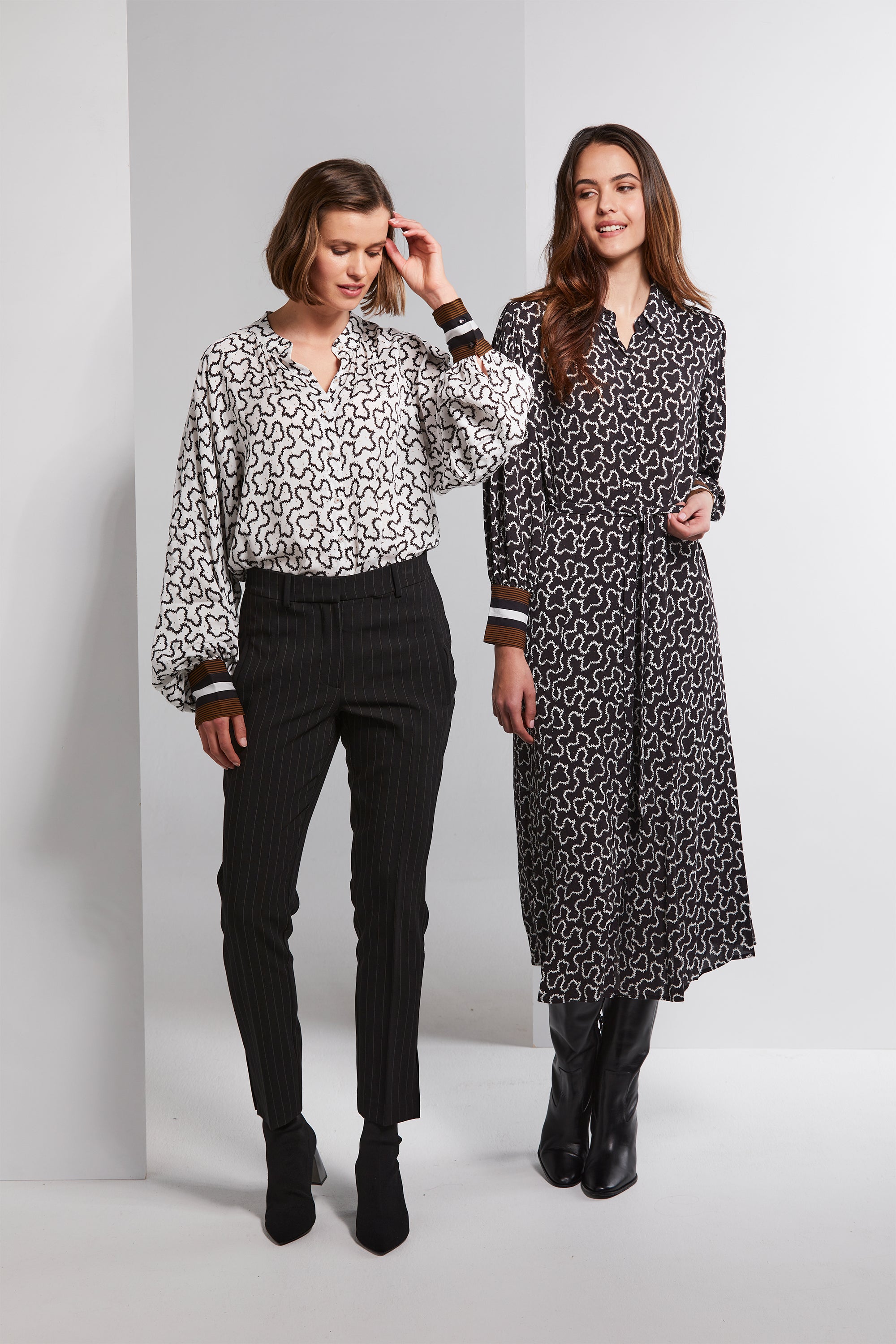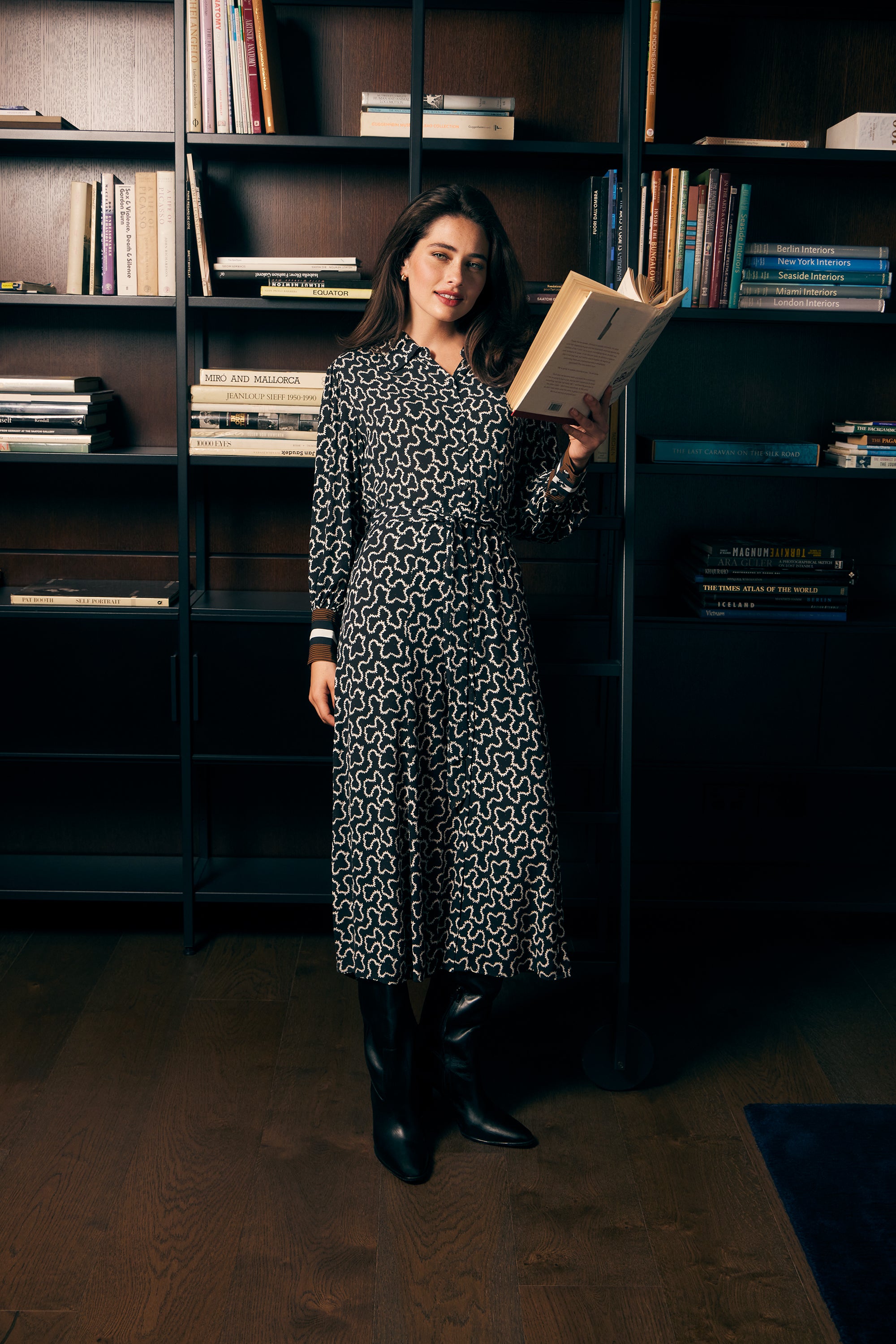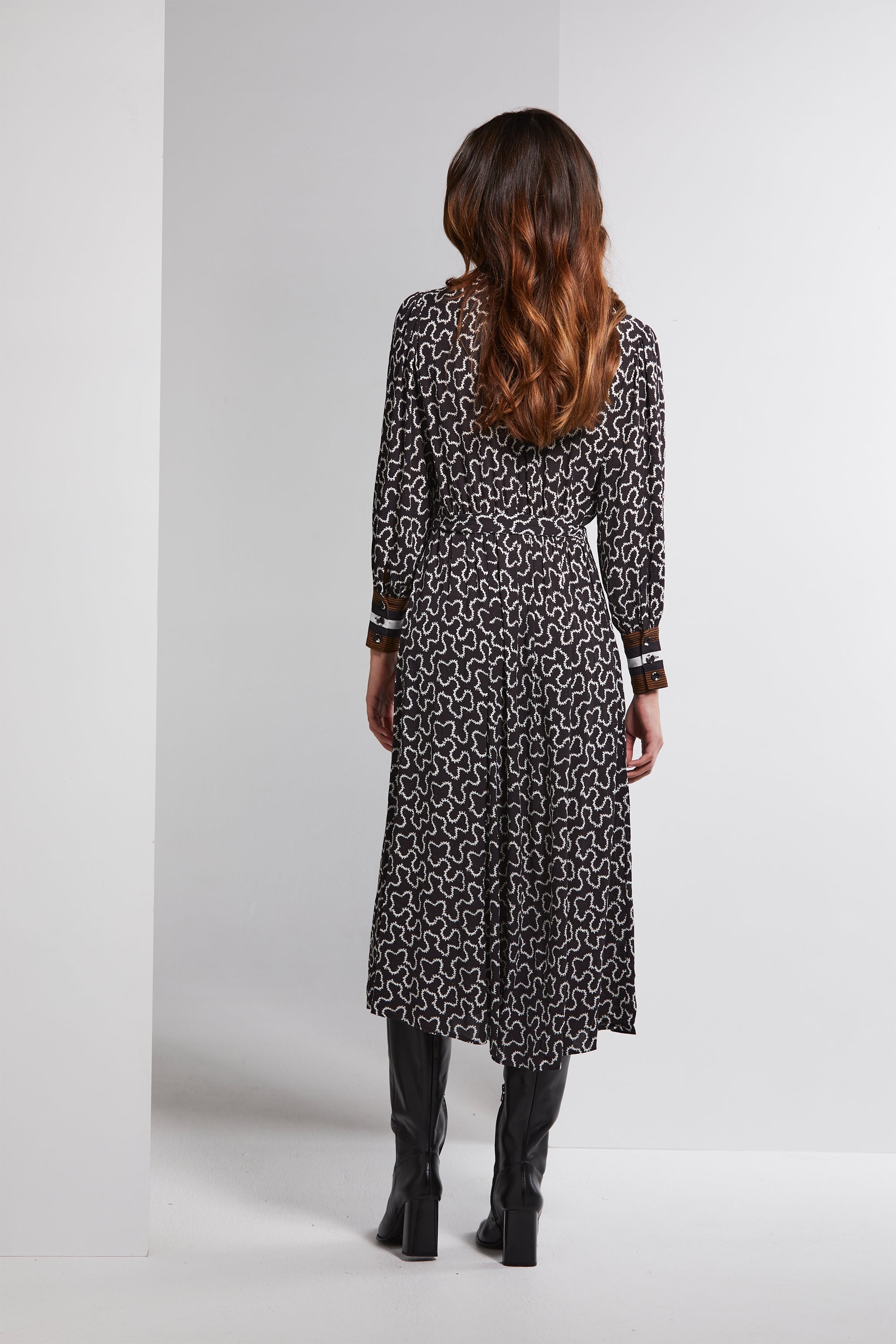 This shirt dress, made from a printed viscose rayon blend, boasts a captivating black and white natural geo print complemented by a tan spot. The dress features full floaty sleeves, a collared neckline, and a playful tan stripe at the cuffs. Adorned with self-covered buttons, it's a go-to piece for your wardrobe.