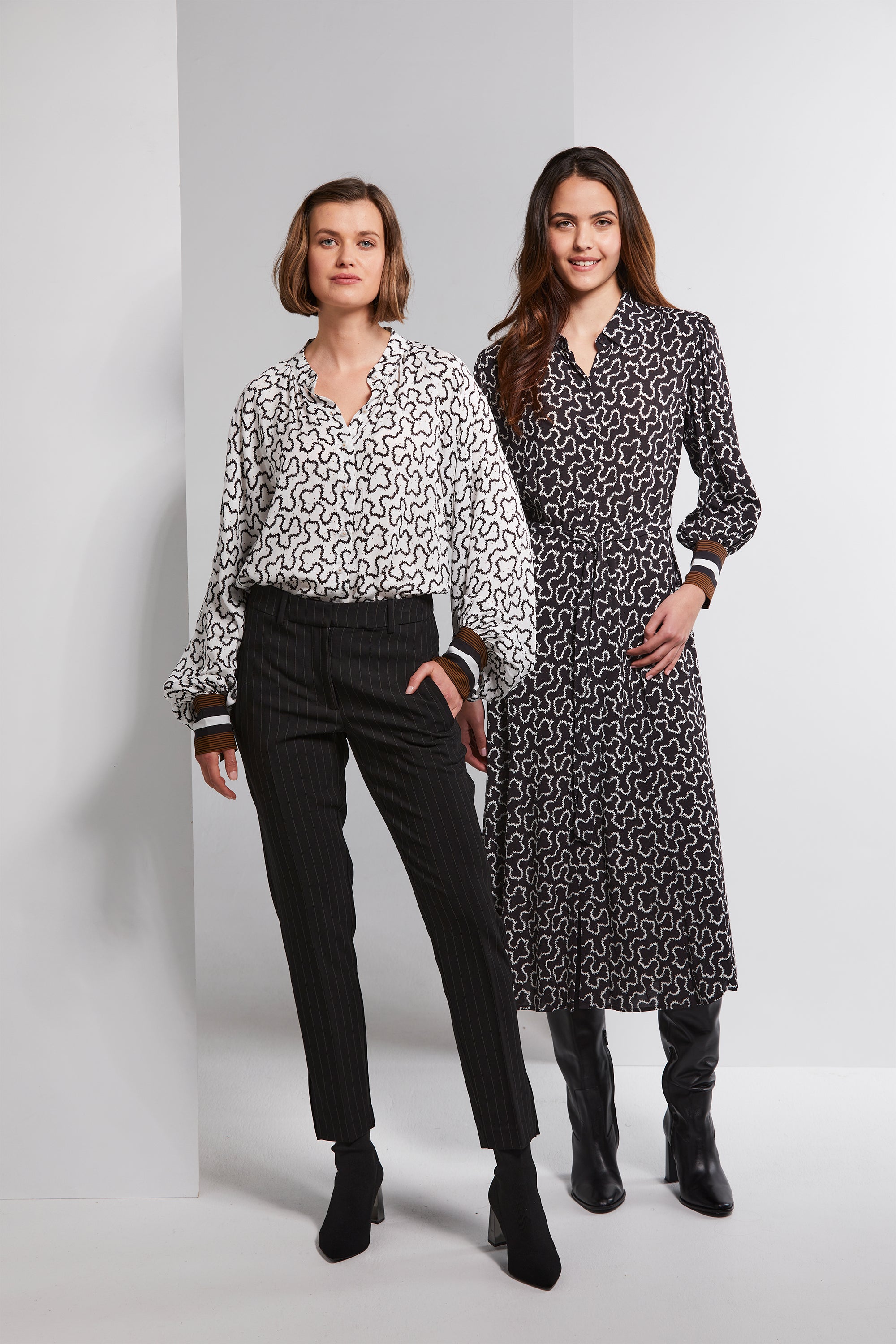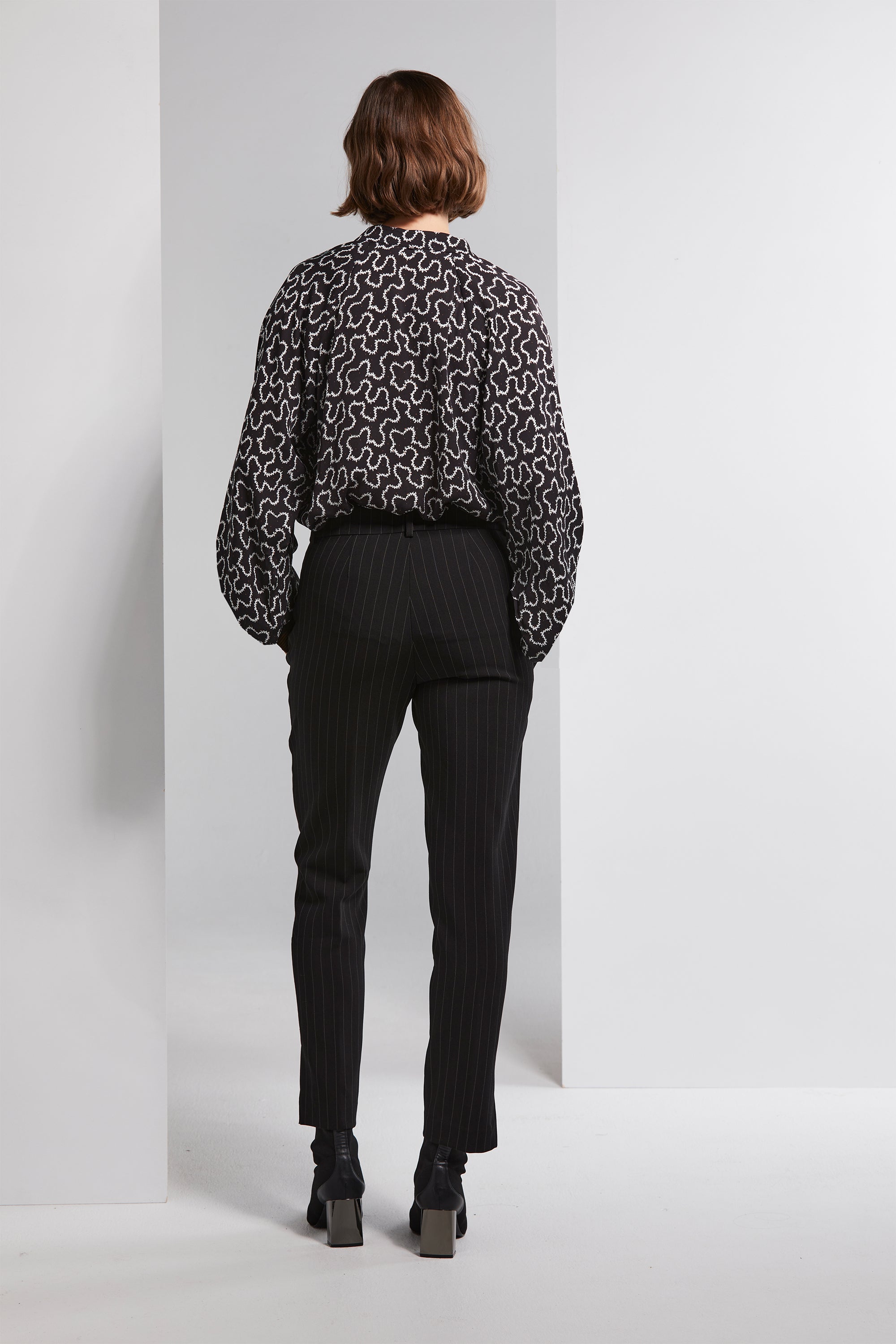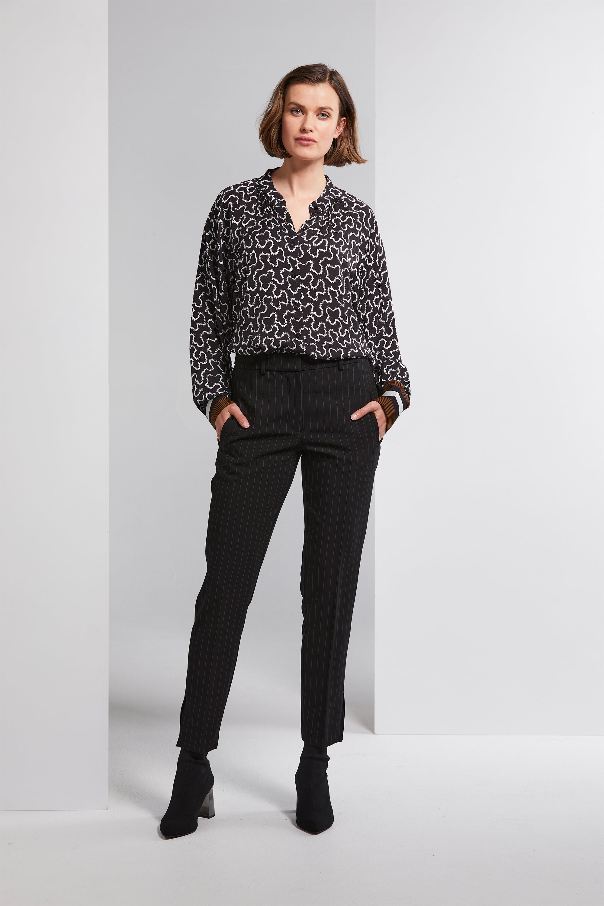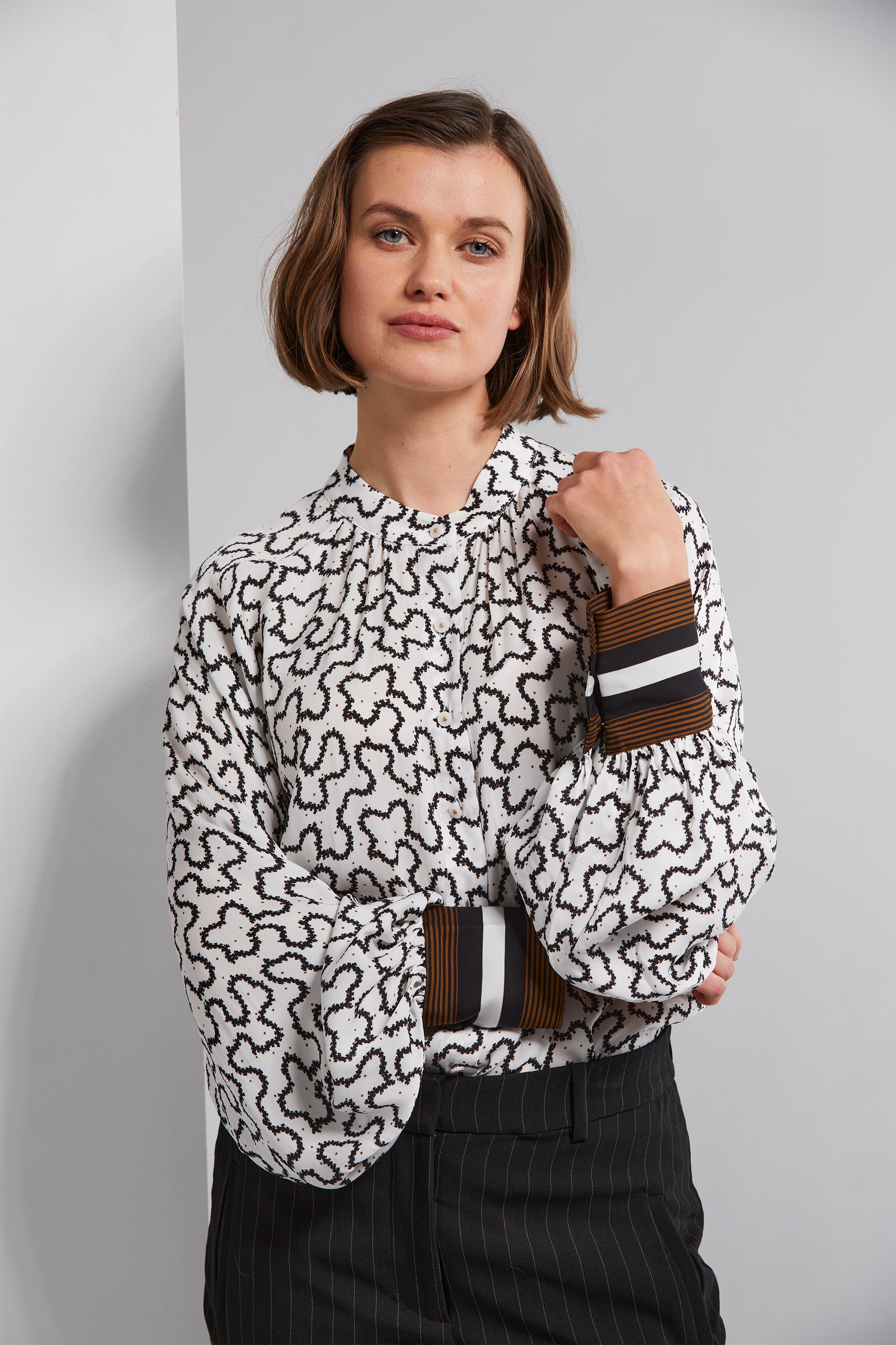 Embrace the timeless charm of the Gatsby Shirt. Adorned with a striking black and white natural geo print paired with a playful tan spot, this shirt is a tribute to Art Deco. The cuffs feature a contrasting stripe in tan that adds a touch of sophistication. Softly gathered at the neckline, with full floaty sleeves, this shirt offers a blend of elegance and comfort. Complete with gold studded buttons, it's a true statement piece for your wardrobe.