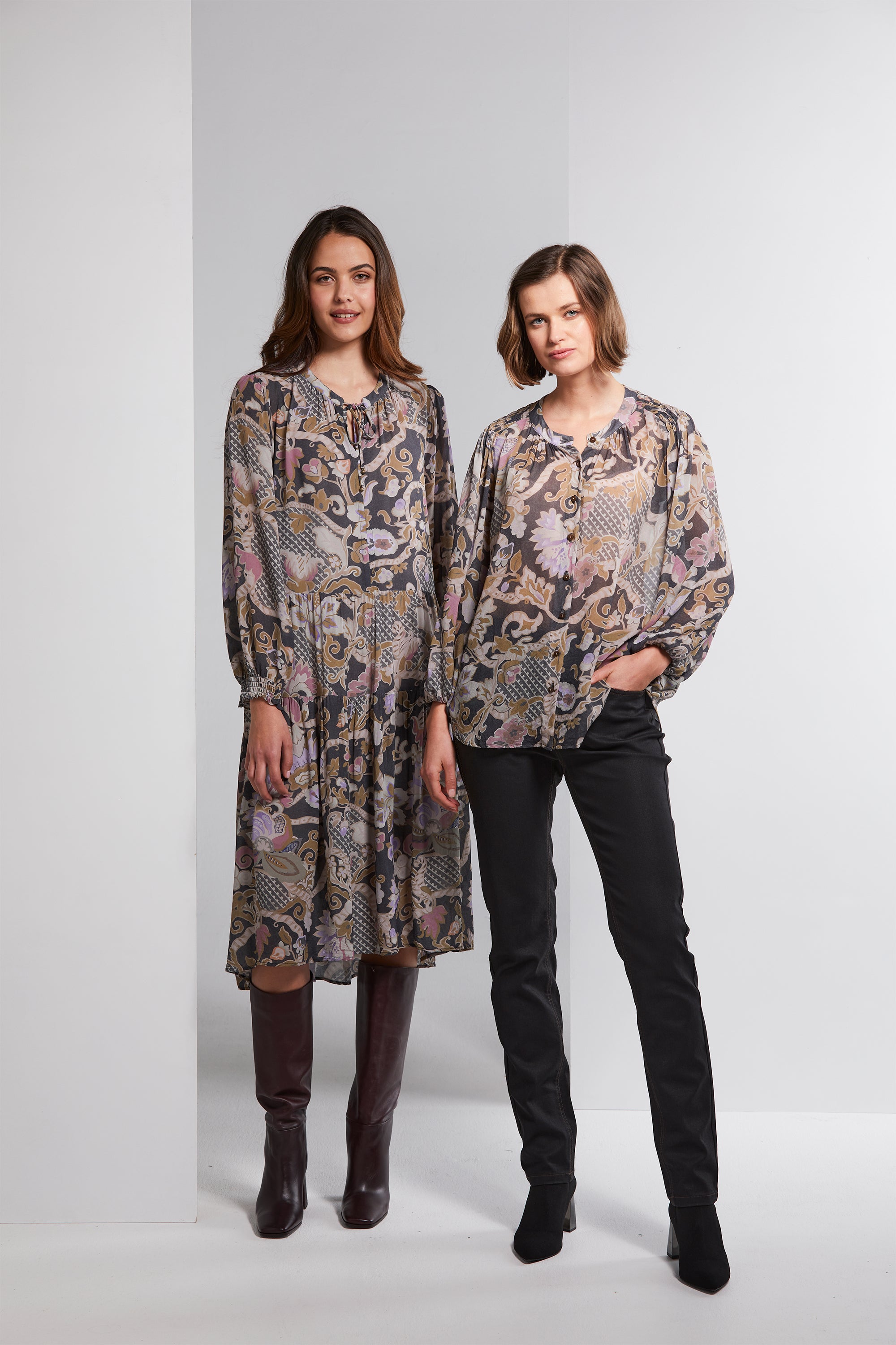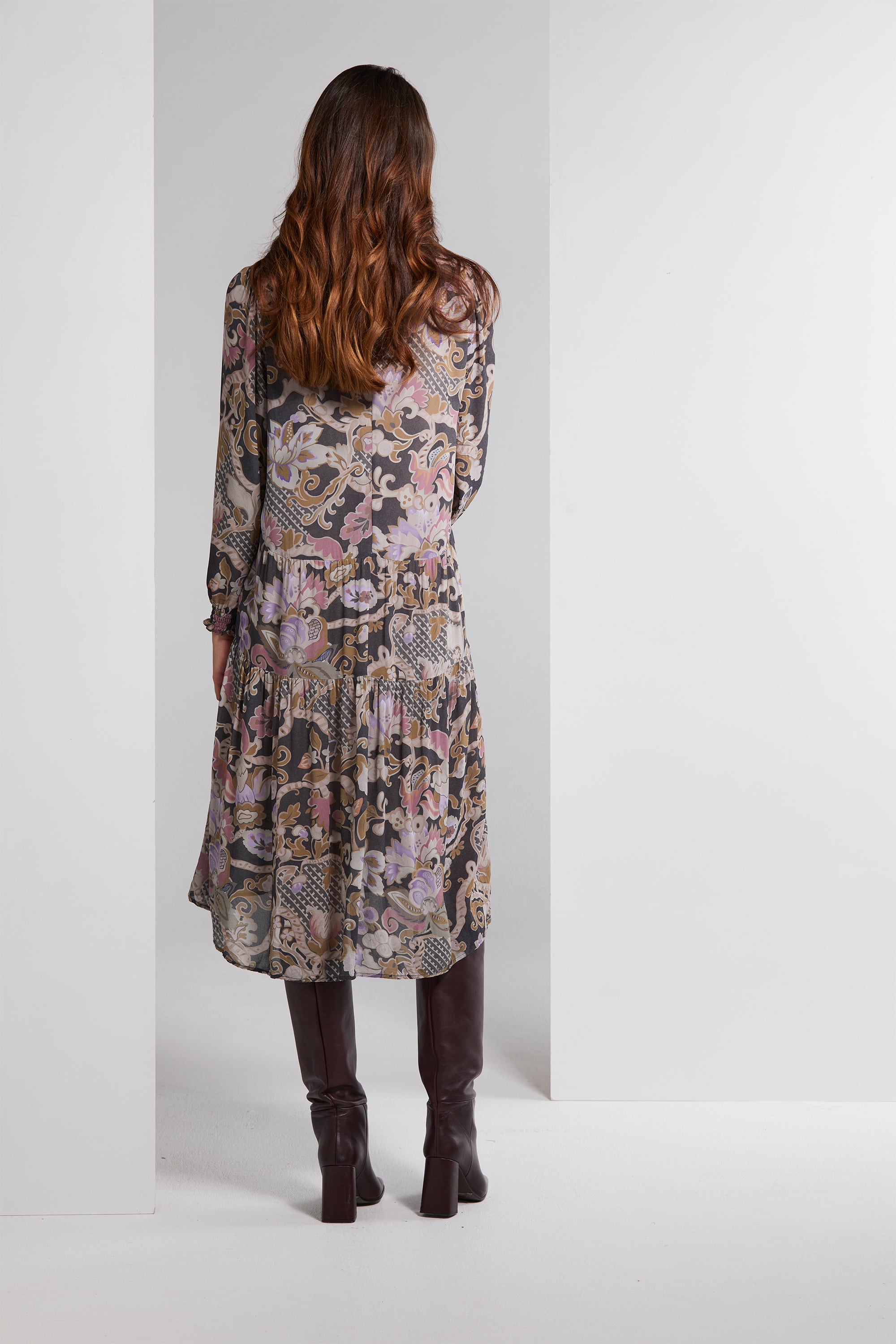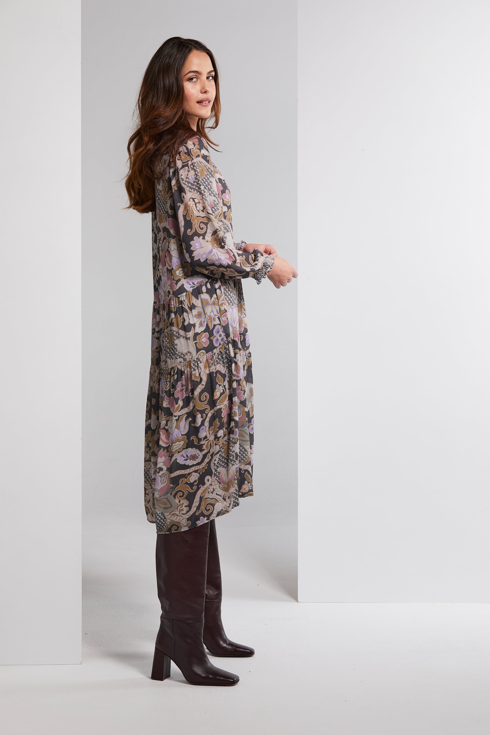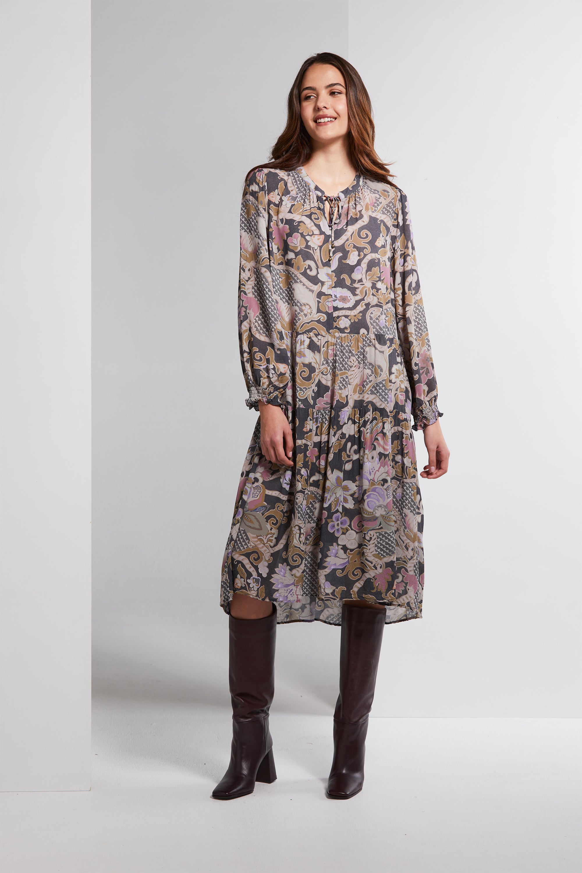 Experience effortless versatility in the Knight Dress. Crafted from viscose georgette, this midi dress showcases a tie neckline and two gathered tiers from a dropped waist seam. Softly gathered sleeves with elasticated ruffle cuffs add a playful touch. This floaty and easy-wearing dress is your go-to choice for transitioning seamlessly from day to night.