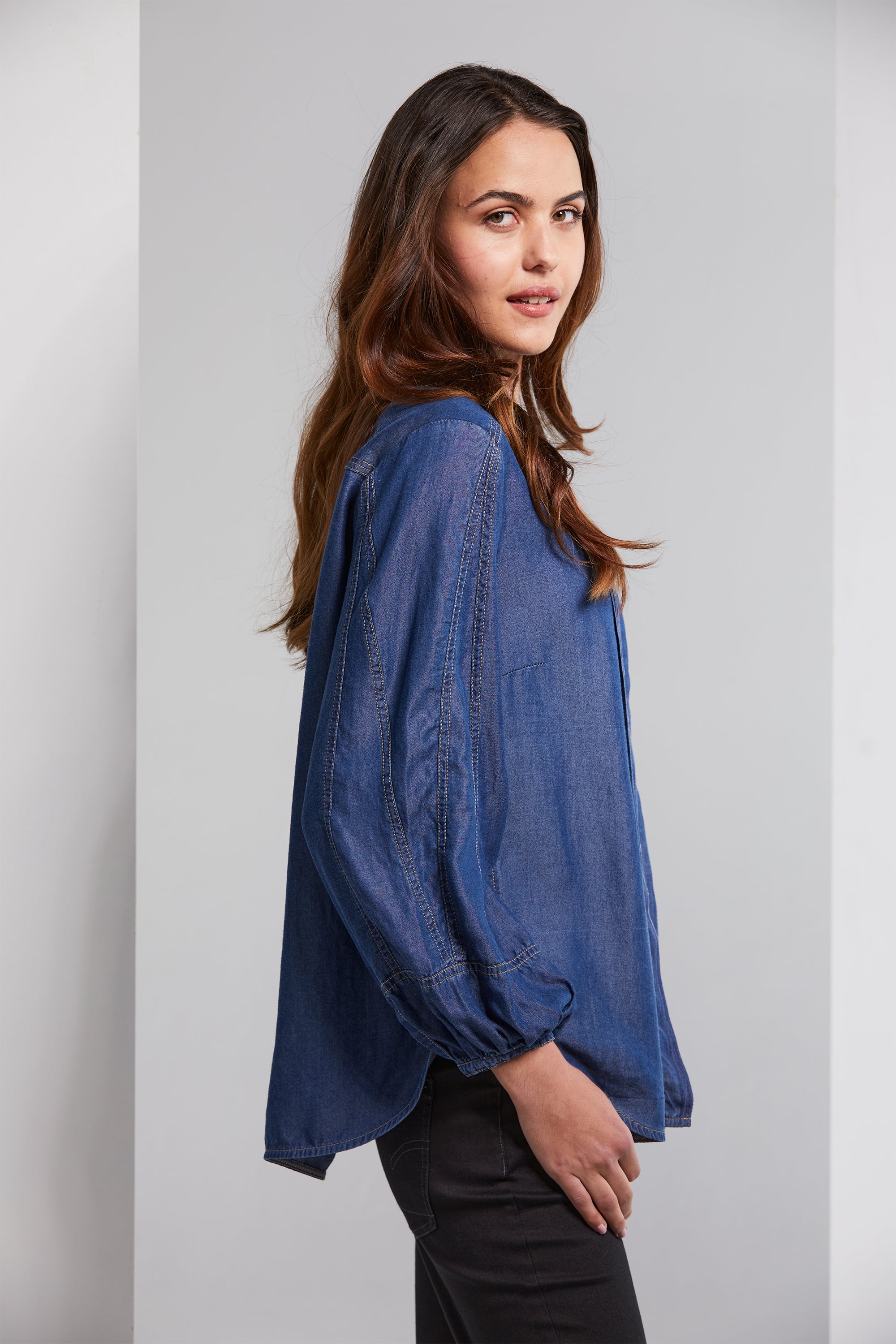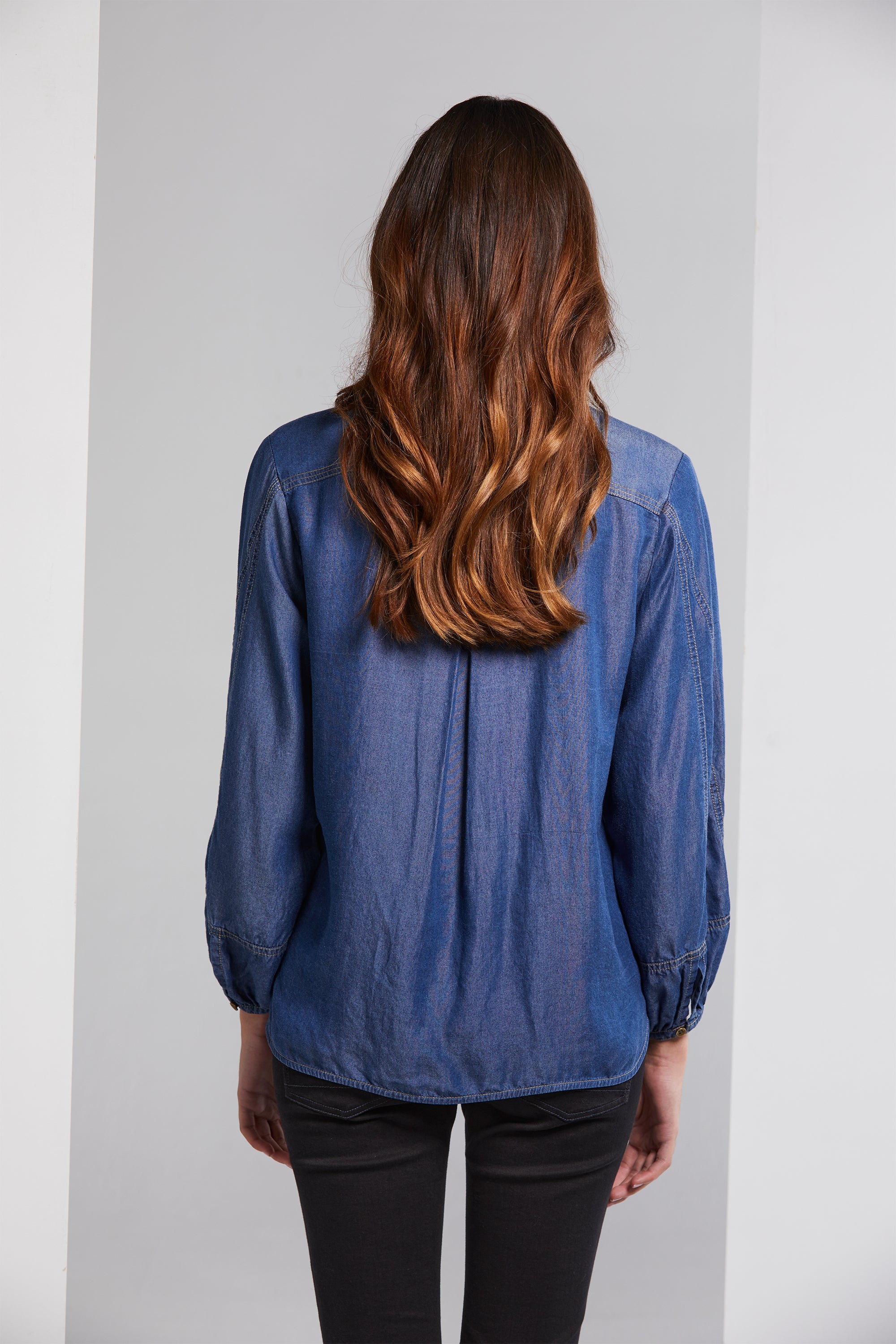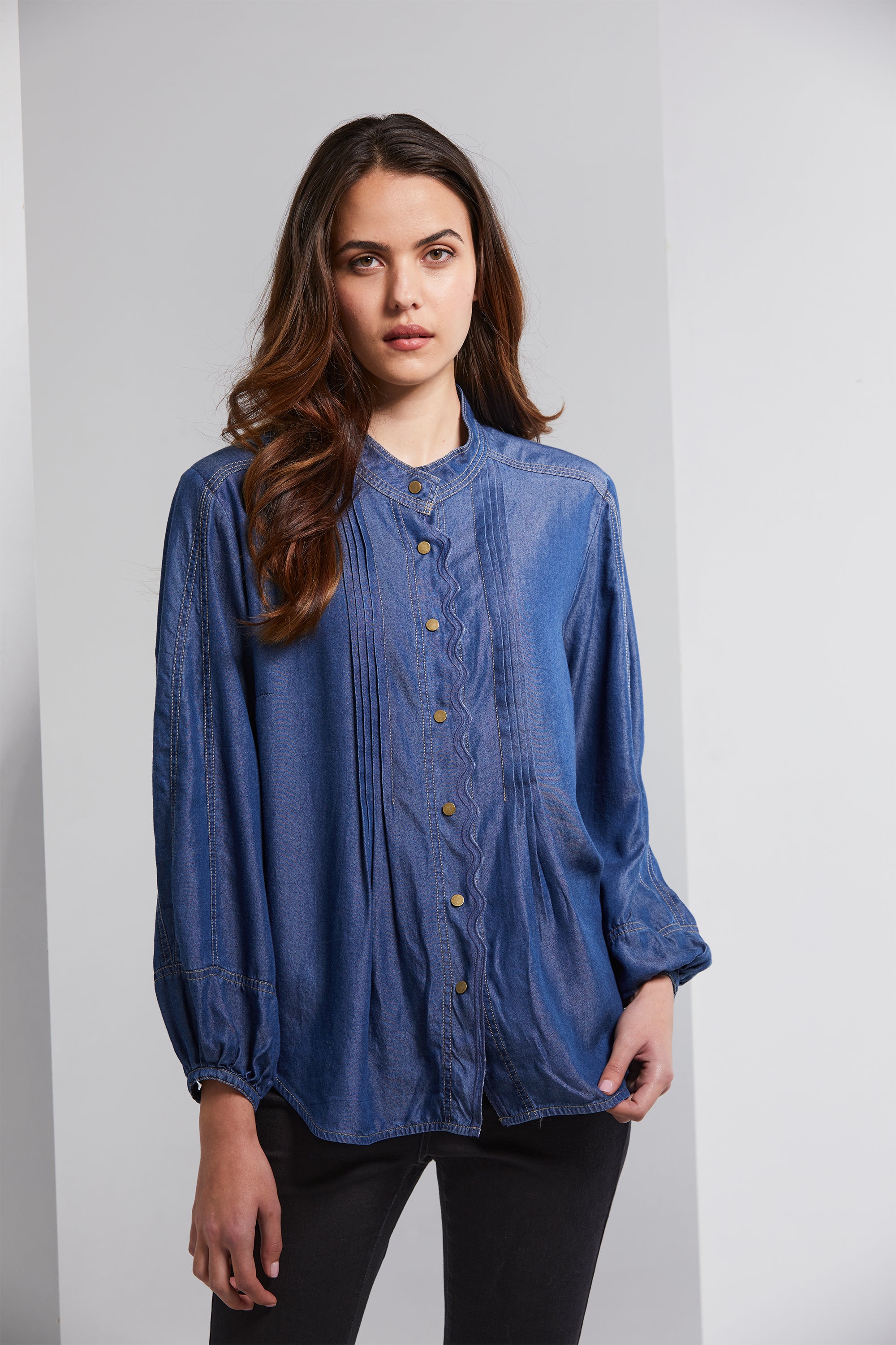 The Presley Shirt, a chambray denim-look shirt crafted from soft lyocell fabric. It features wavy embroidery down the front placket, pin tucking detail and tan twin topstitching highlight panel design lines across the back yoke and down the sleeves. Whether you're dressing up or going for a relaxed vibe, the Presley Shirt is a versatile addition to your wardrobe.