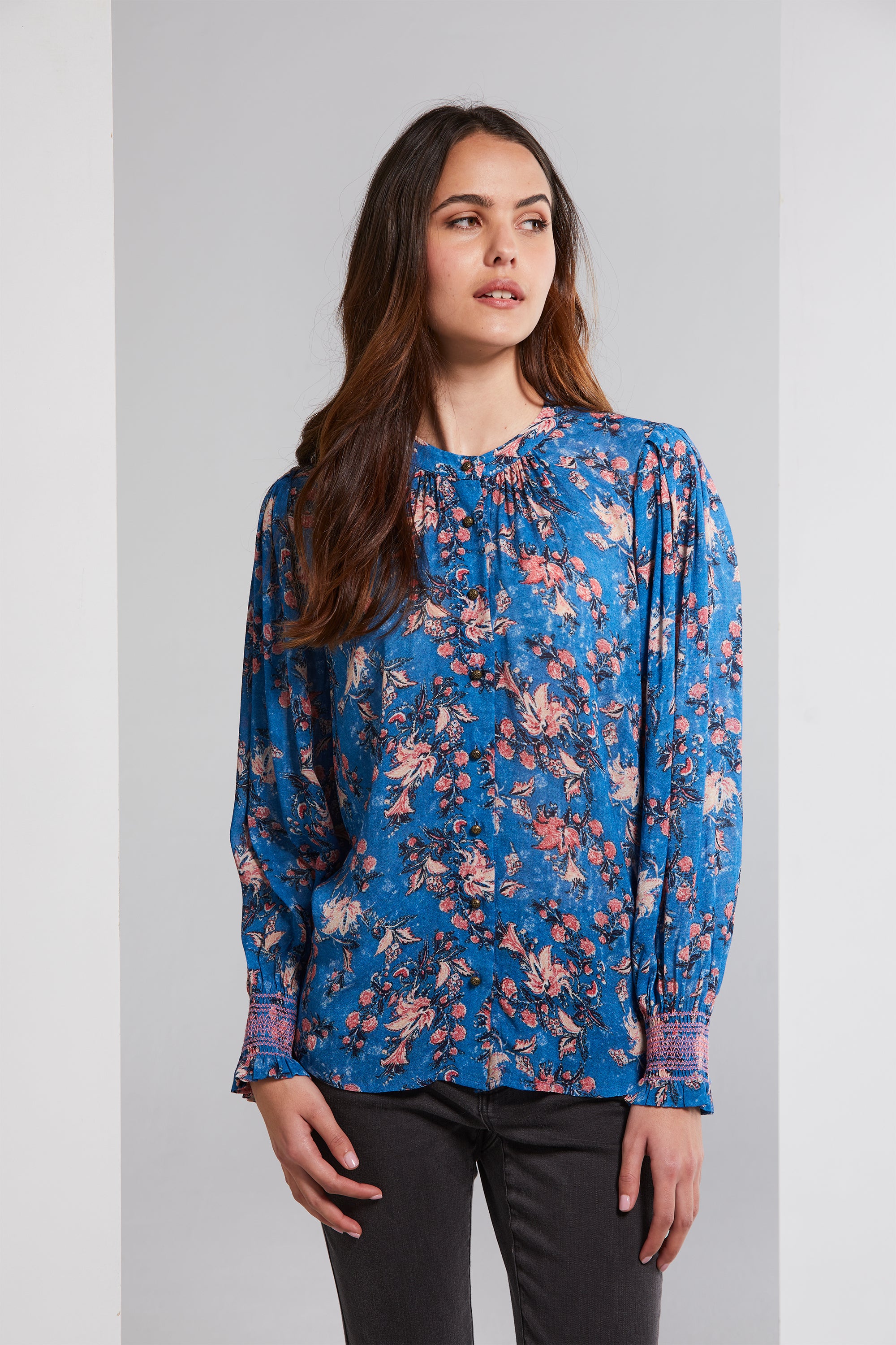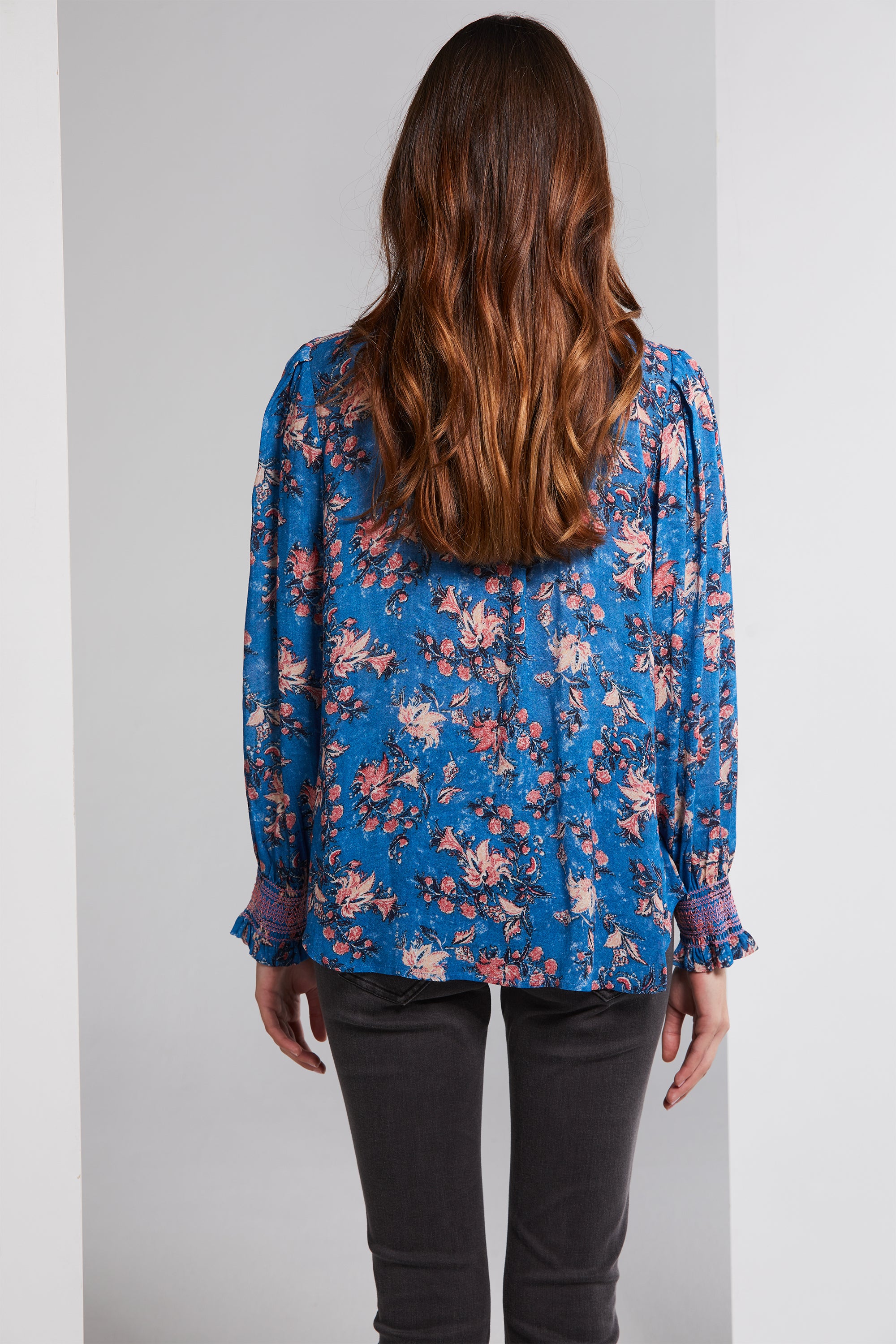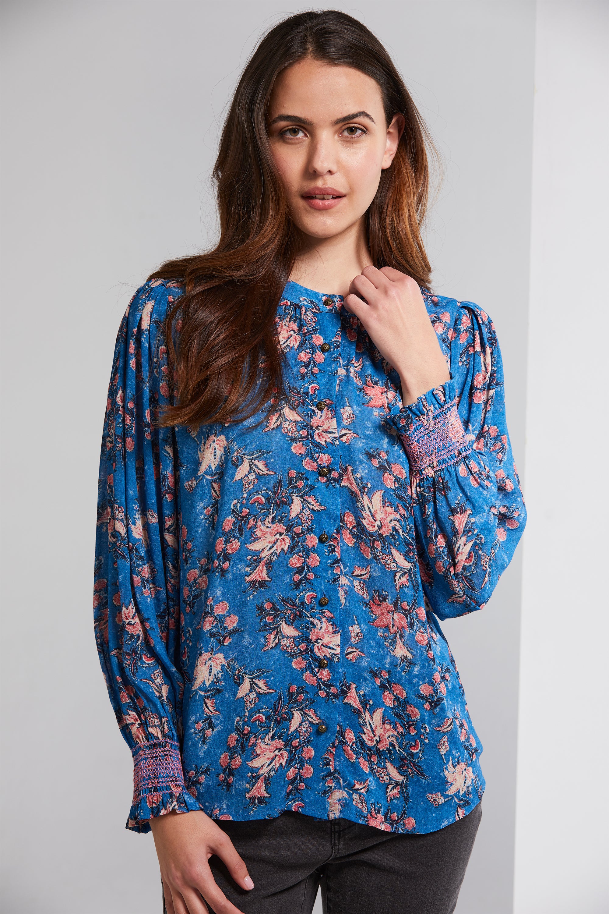 Discover the Rosalie Shirt, a button-through delight in a whimsical floral print with antique brass buttons. It features a round neckband with a soft gather and full sleeves, complete with shirred cuffs and pink smocking detail. Crafted from a blend of 63% viscose and 37% rayon, it offers both style and comfort. Elevate your look with Rosalie's floral charm.