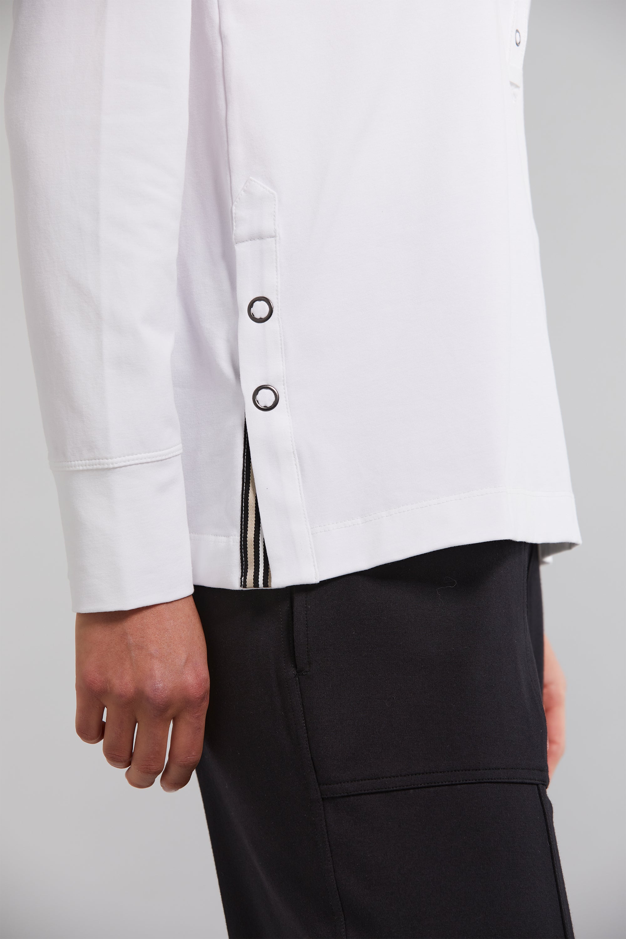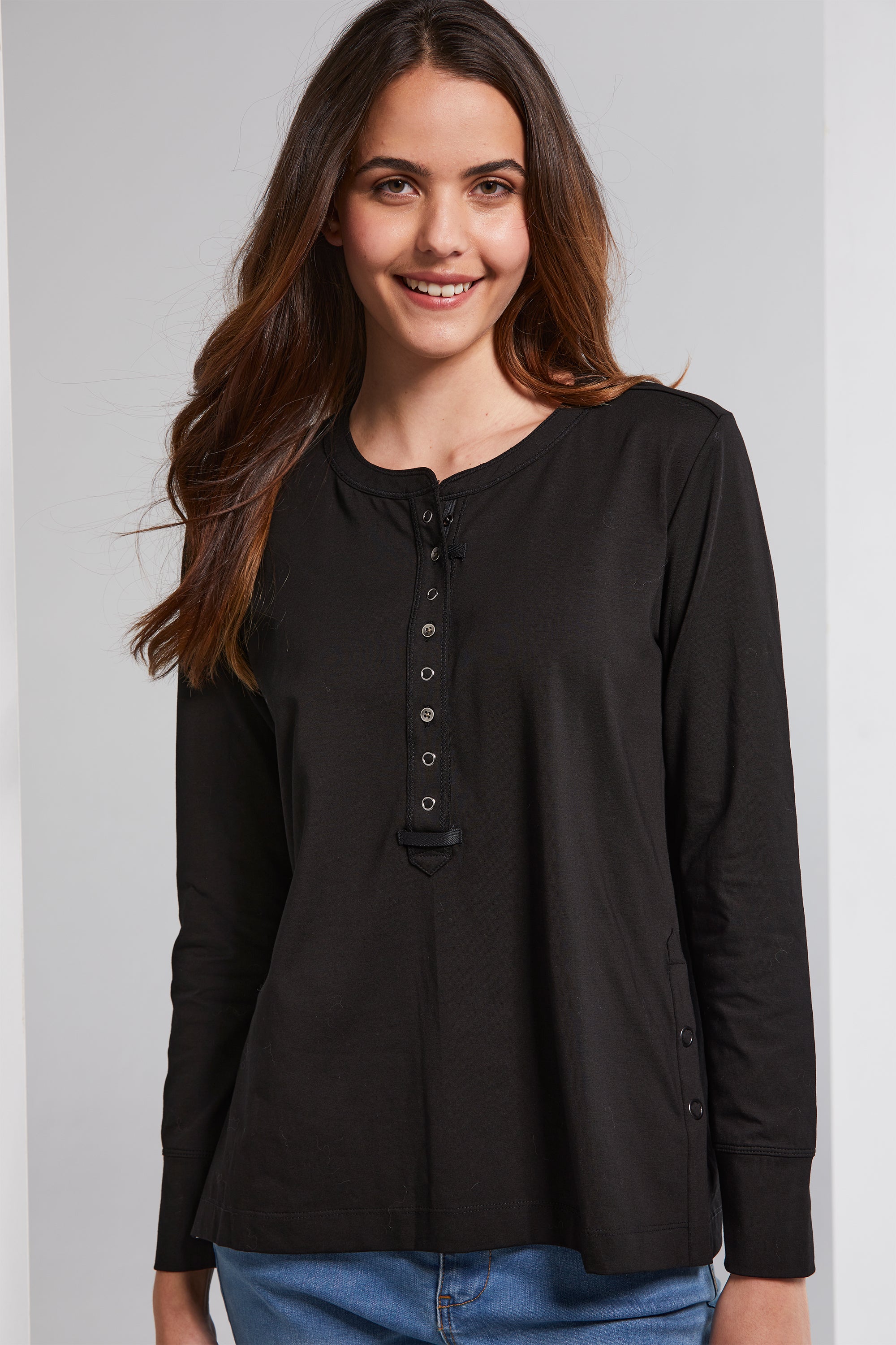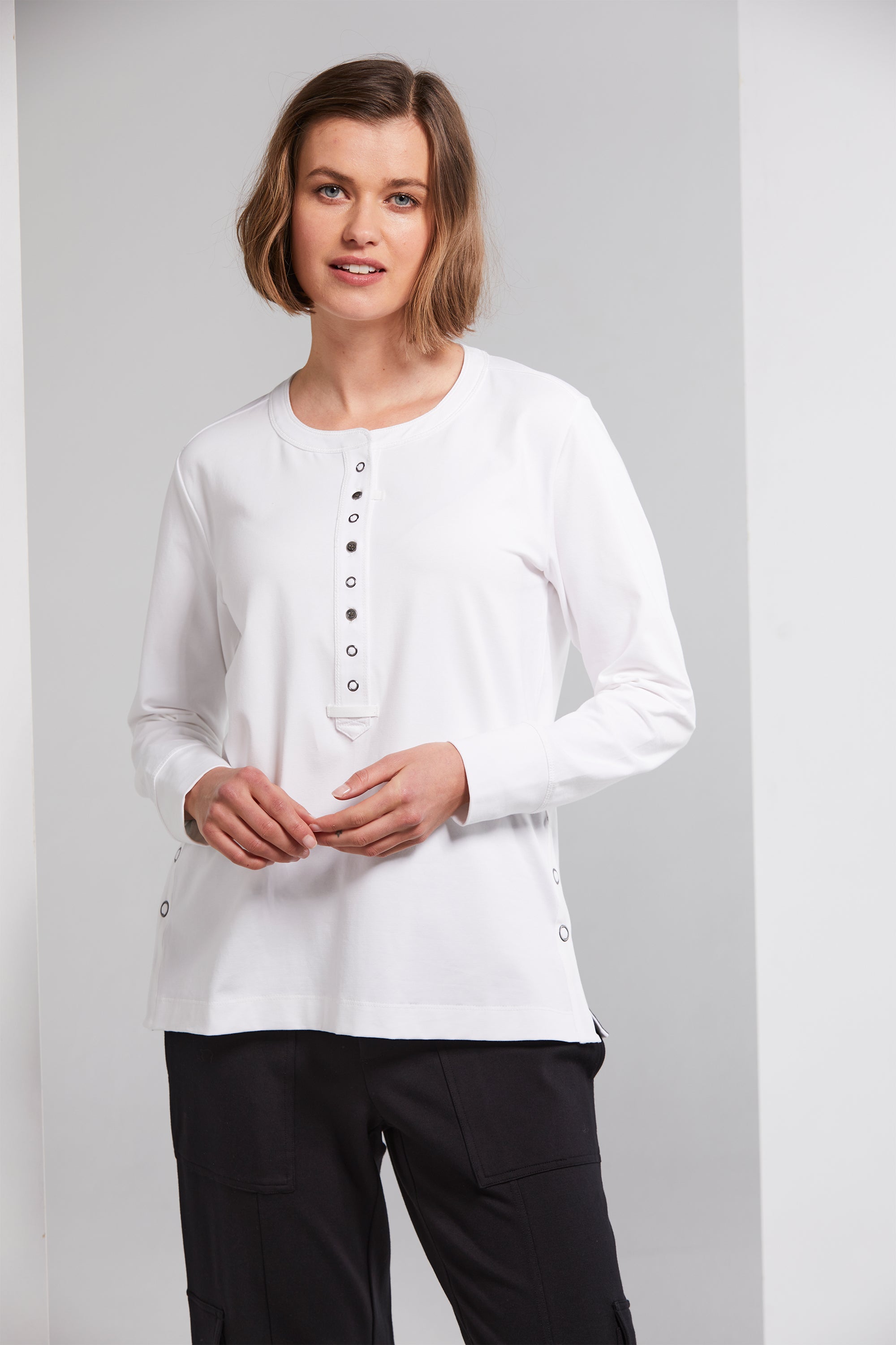 Elevate your modern comfort with our Snap Top. Made from stretch cotton, it boasts a deep placket neckline adorned with snap domes and metallic buttons for a contemporary twist. The dyed-to-match tape detail on the under-placket and placket loops adds a touch of sophistication. The dome-fastened side split features striped tape trim on the underside. It’s the details that make this top both stylish and comfortable.