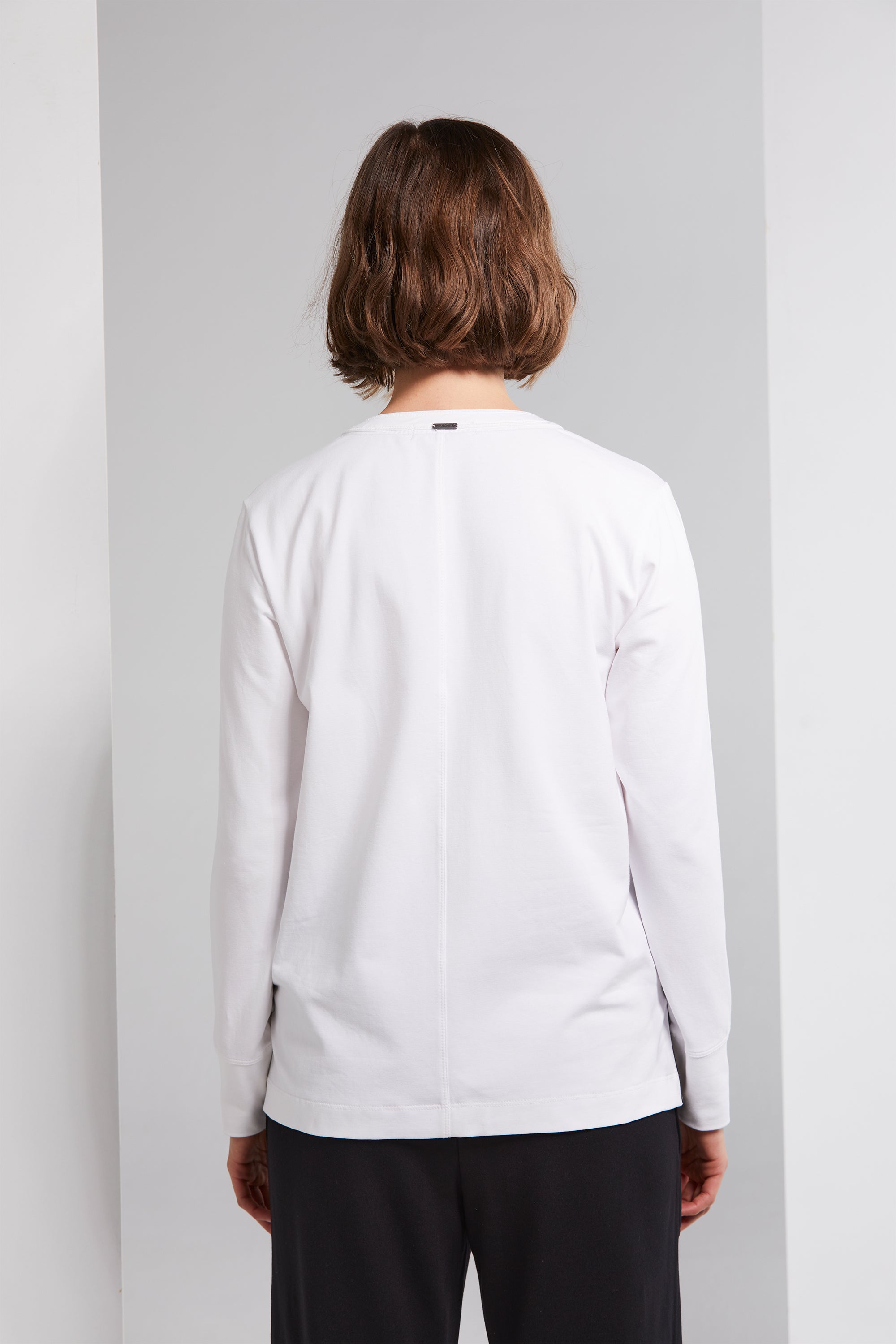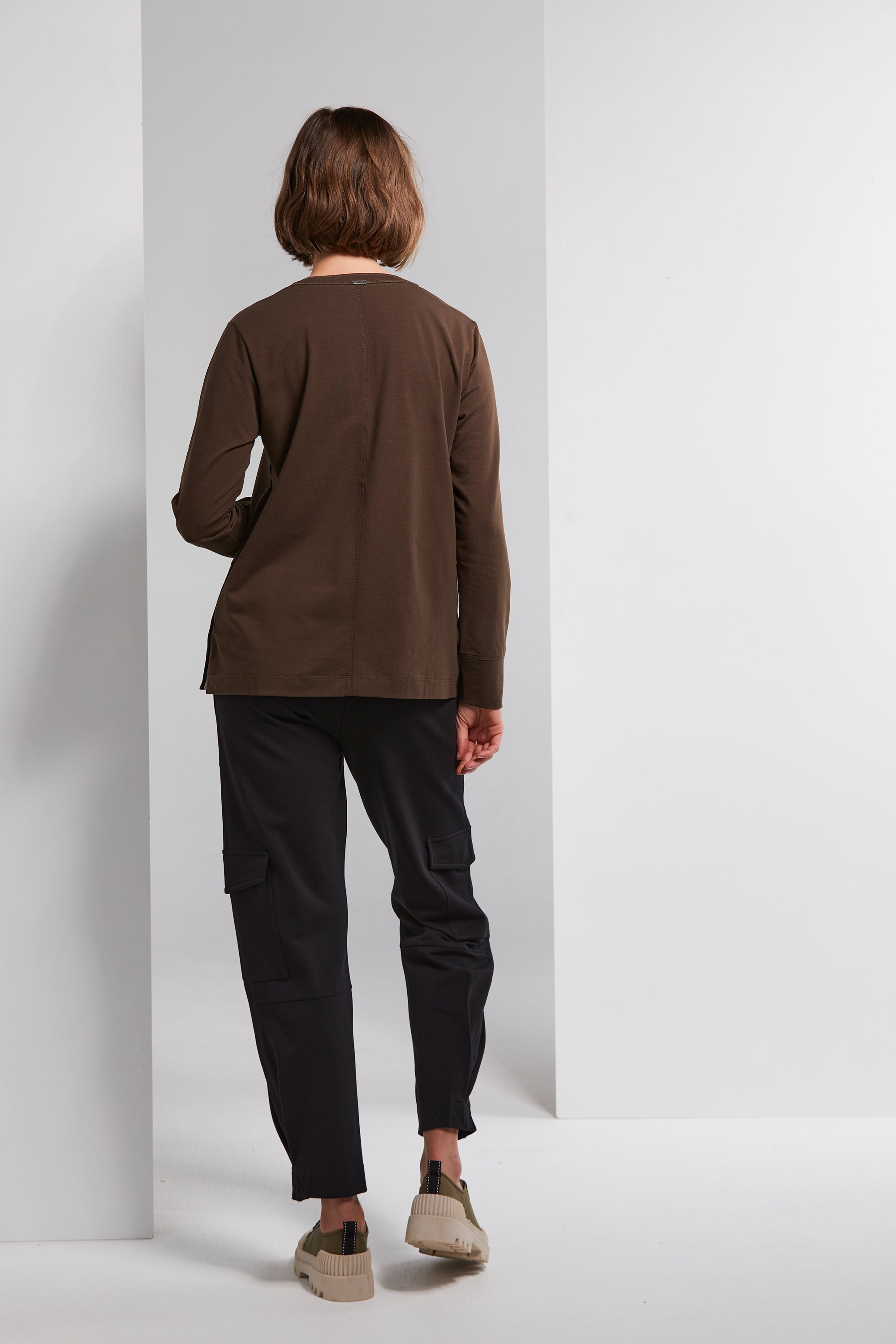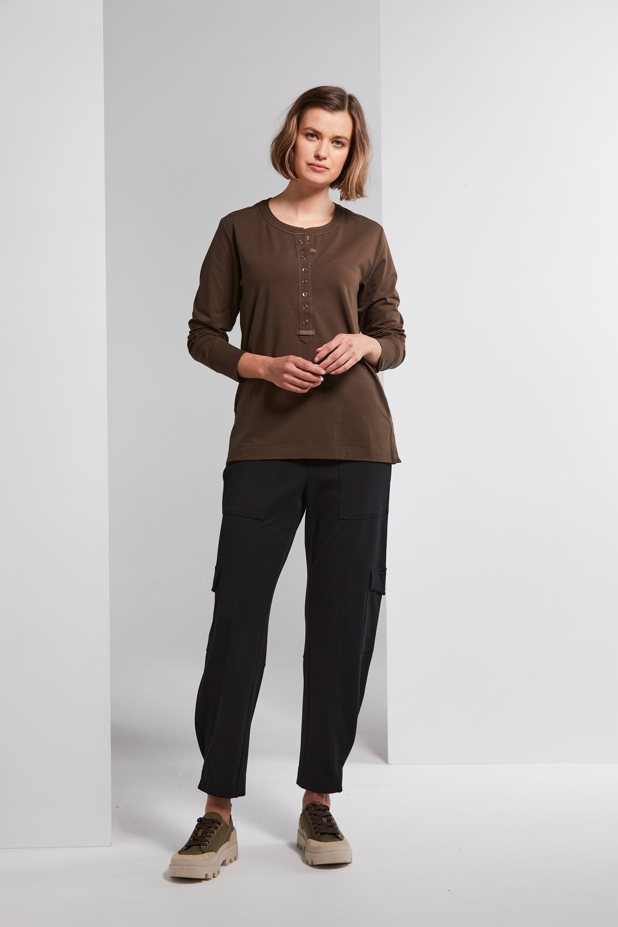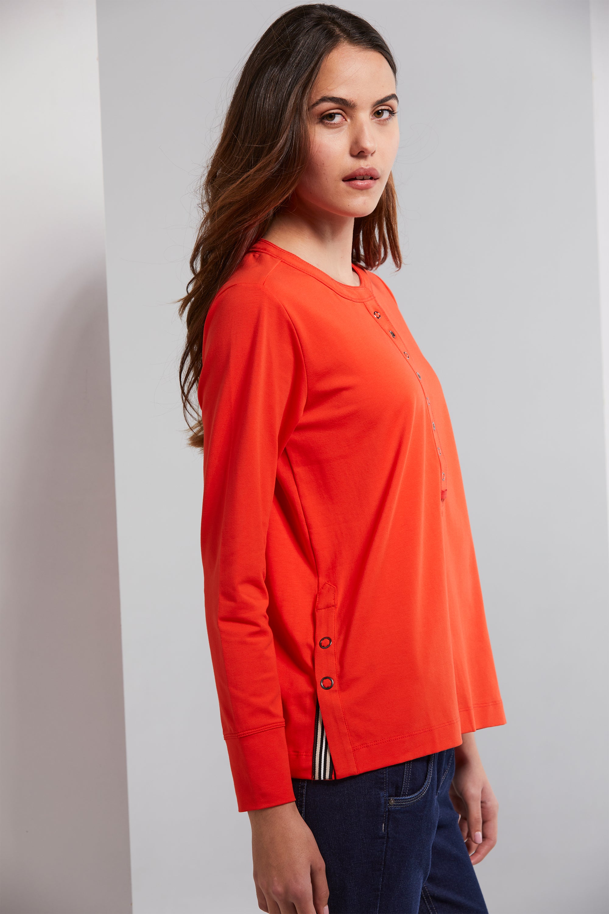 Elevate your modern comfort with our Snap Top. Made from stretch cotton, it boasts a deep placket neckline adorned with snap domes and metallic buttons for a contemporary twist. The dyed-to-match tape detail on the under-placket and placket loops adds a touch of sophistication. The dome-fastened side split features striped tape trim on the underside. It’s the details that make this top both stylish and comfortable.