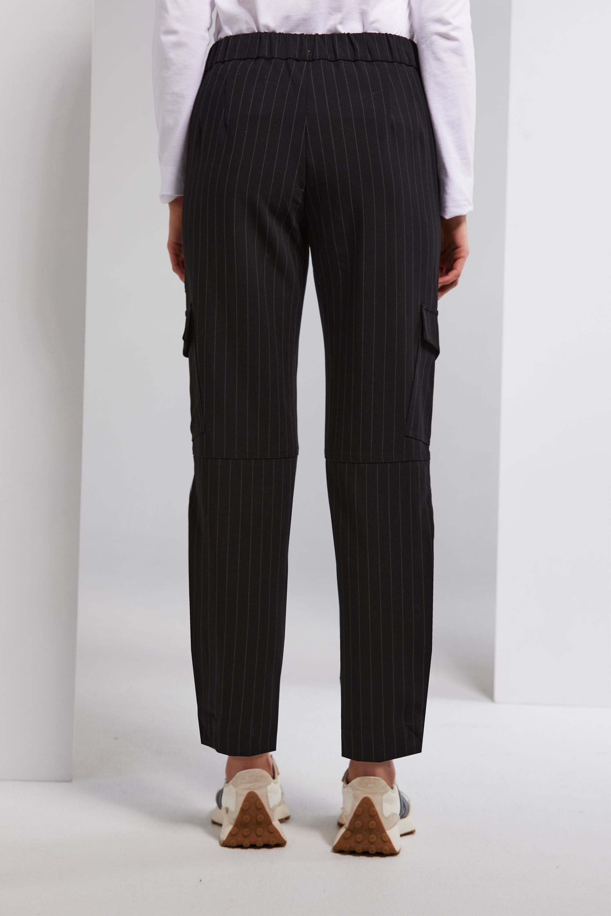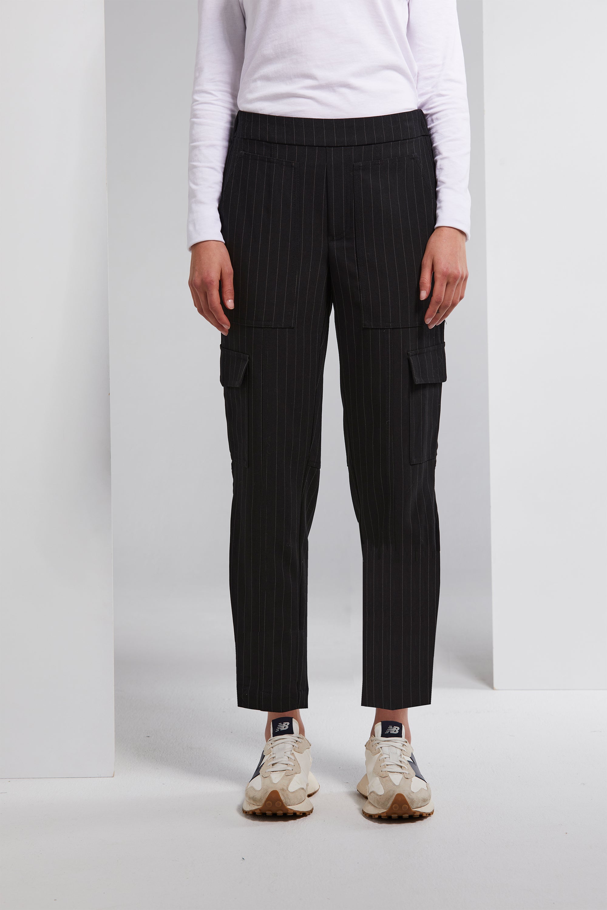 The State Pant is your key to a versatile chic style. Crafted in a stretch striped suiting, its tapered design and elasticated waistband provide both comfort and a flattering fit. Cargo patch pocket detailing adds a touch of trendiness, while the box topstitched tuck at the outside leg hem sets it apart from ordinary pants. Designed with a faux front fly and a shaped back yoke, it's a go-to choice.
