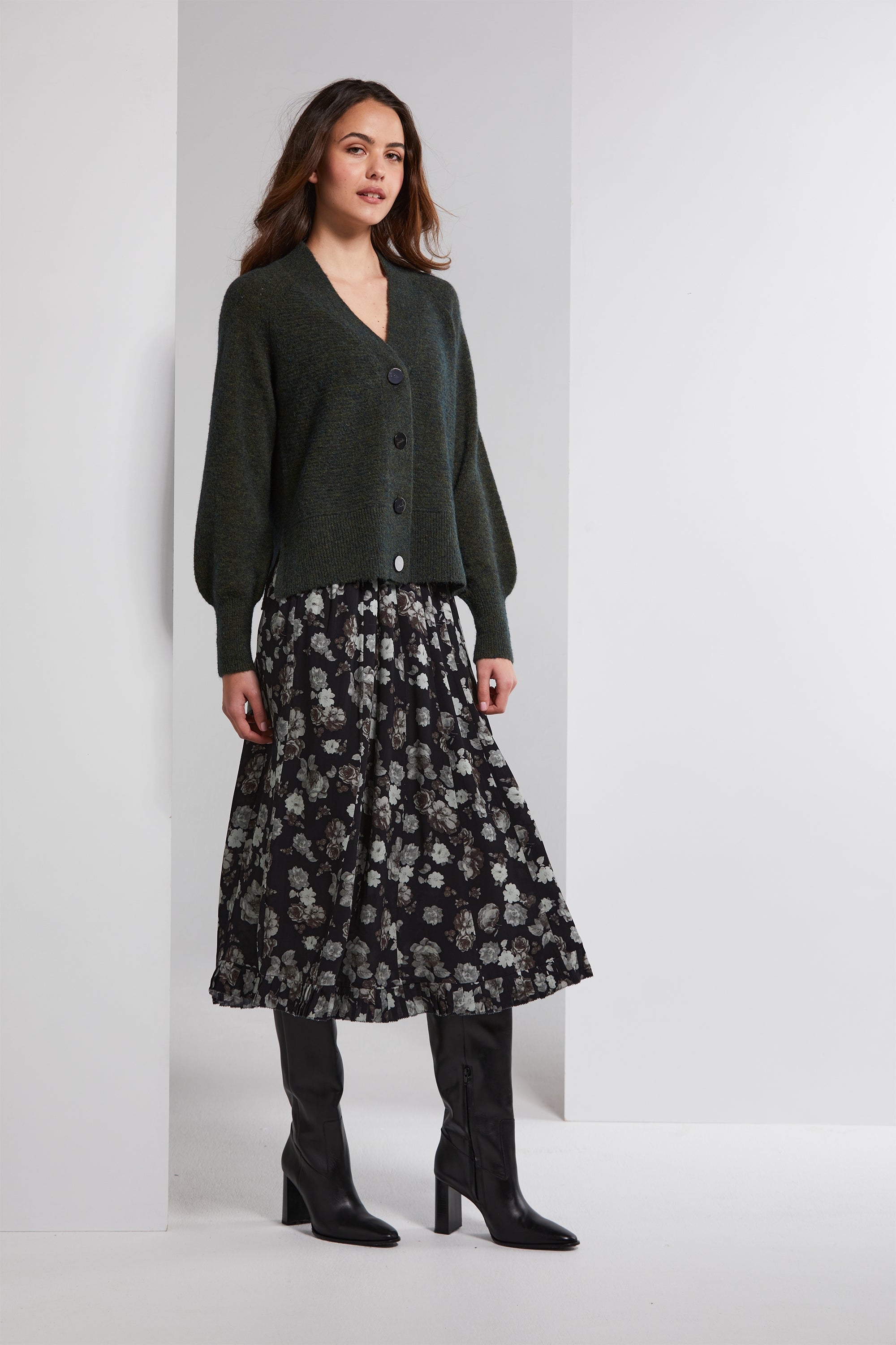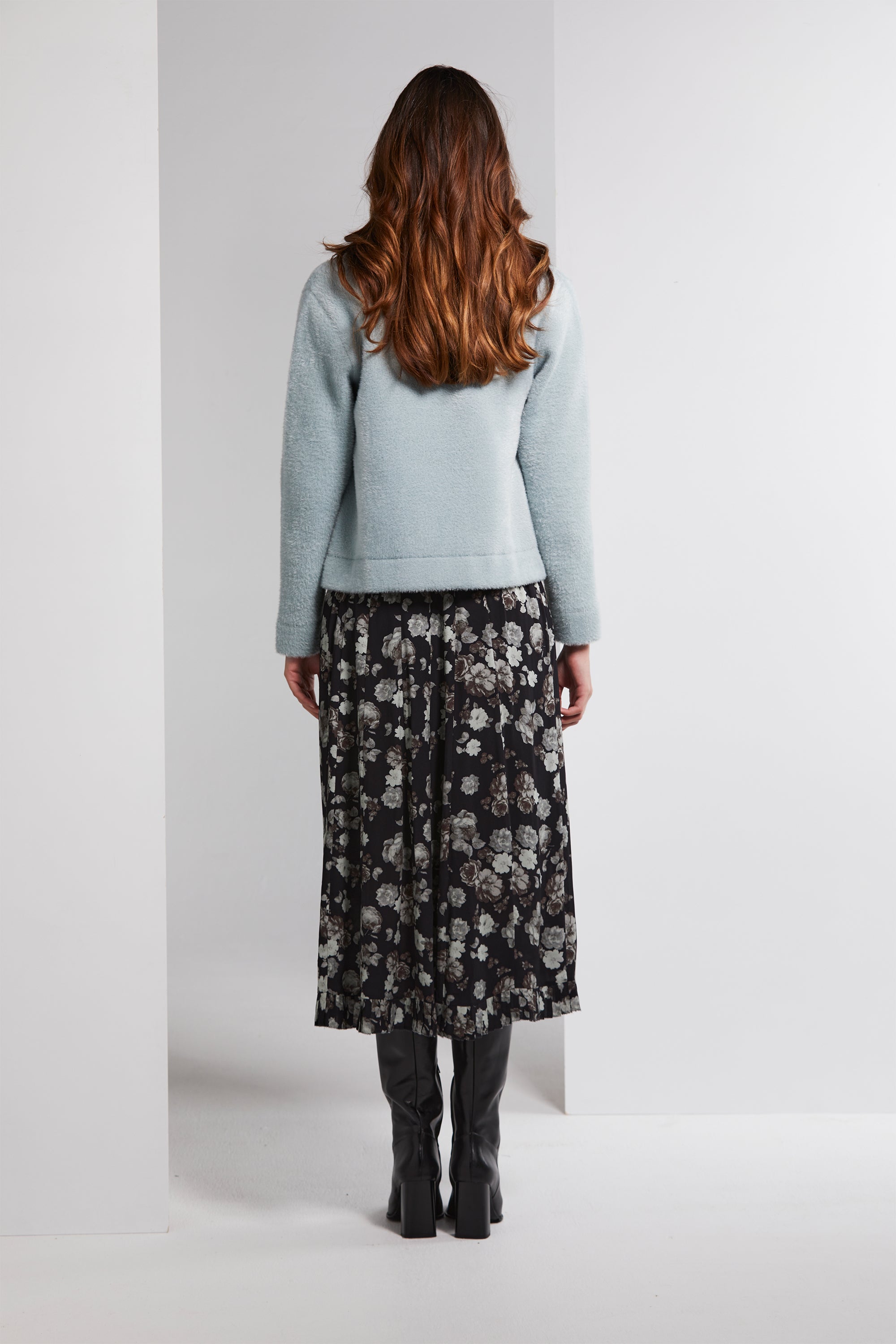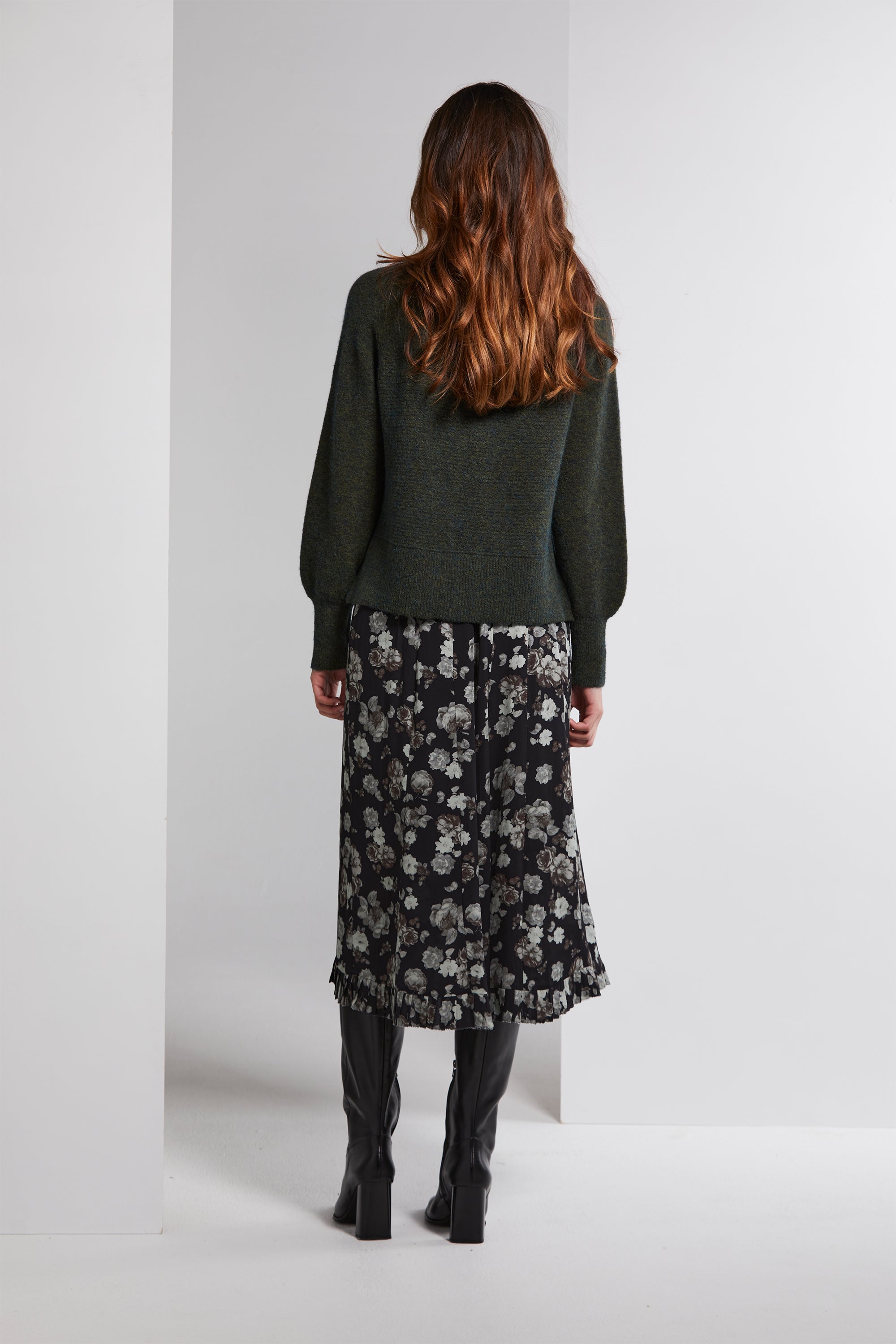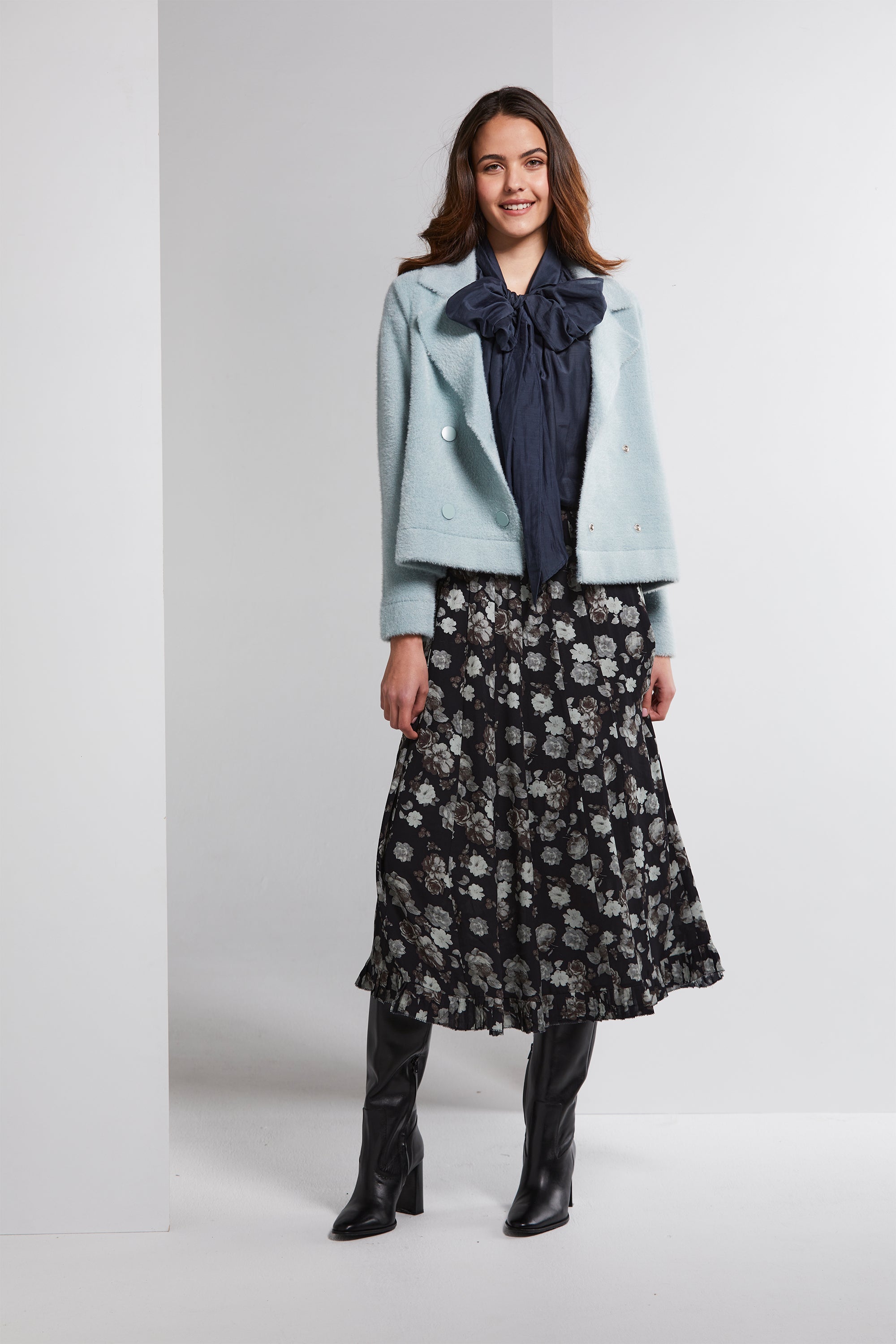 Step into sophistication with the Stirling Skirt, a beautifully crafted floaty panelled skirt. Dressed in a sophisticated silver floral print, it's a true testament to timeless style. The skirt boasts an elasticated waistband, providing both comfort and style. But what truly sets it apart is the pleated hem ruffle, which adds a graceful flourish to your look, making it perfect for any elegant occasion.