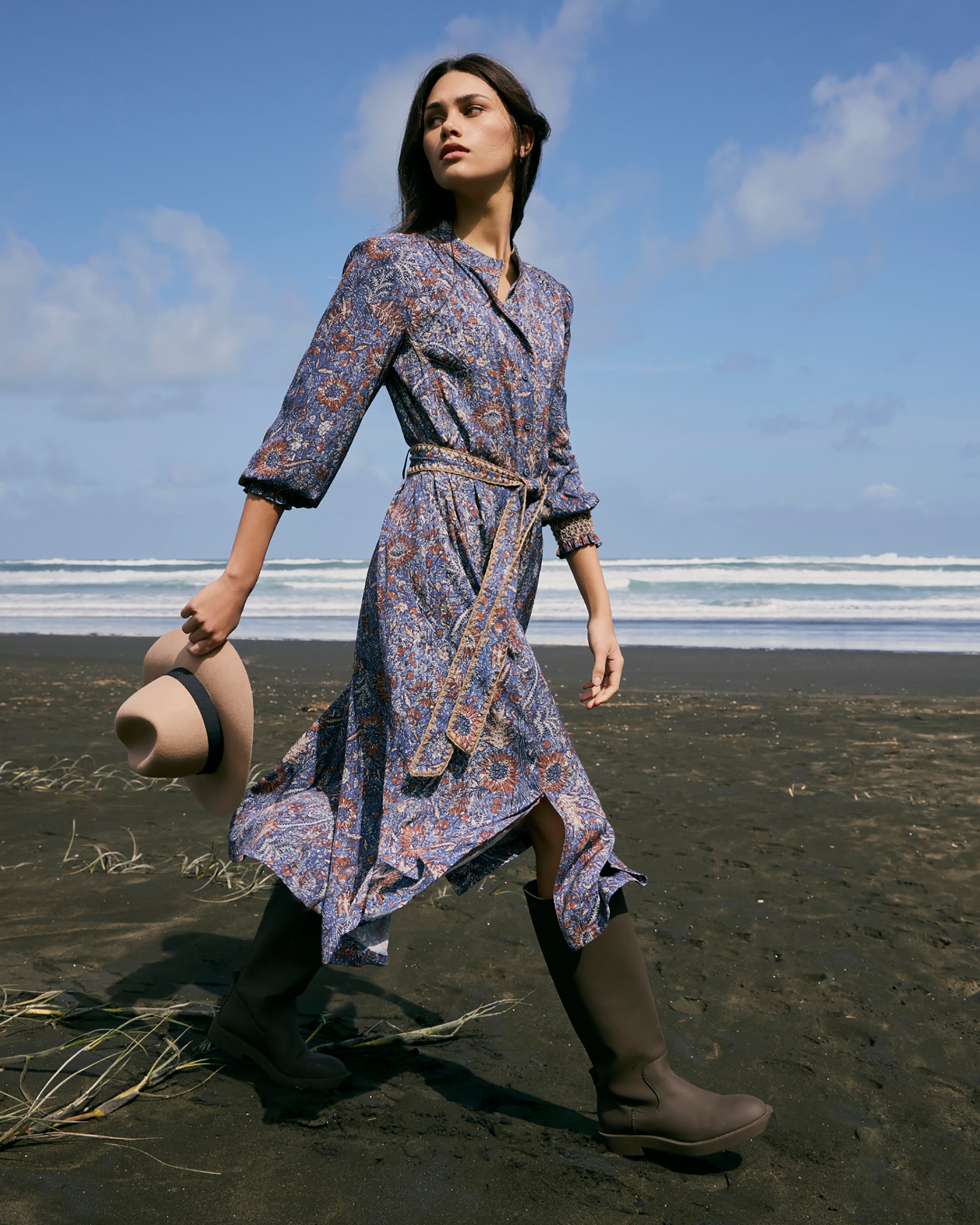 Crafted in the wood-cut style Arizona print this button-through dress features cross-stitch embroidery on the front placket, smocked cuffs, and soft gathers at the sleeves and yoke. Side splits and functional pockets create a relaxed feel, finished with a removable belt edged in embroidery.
