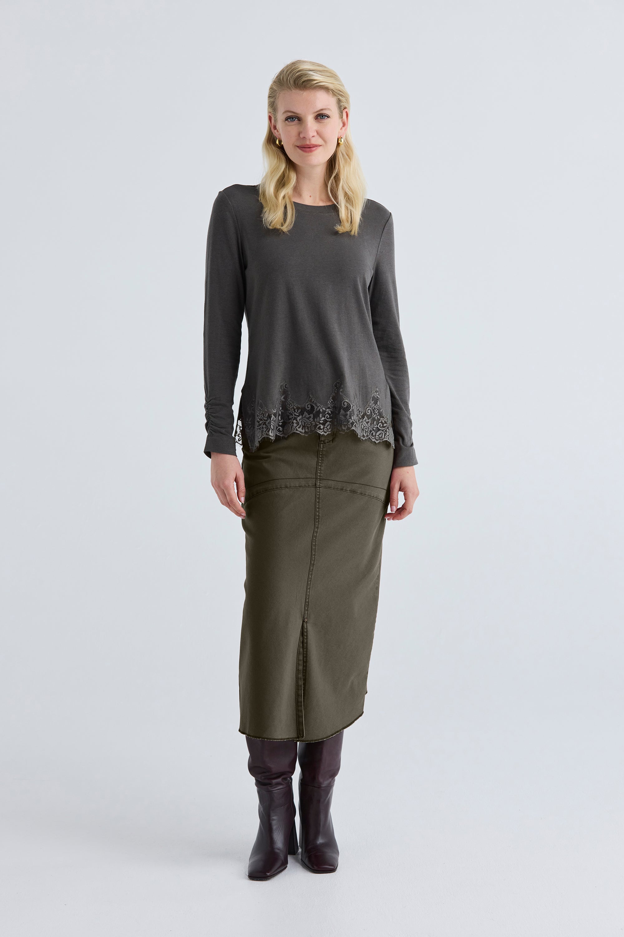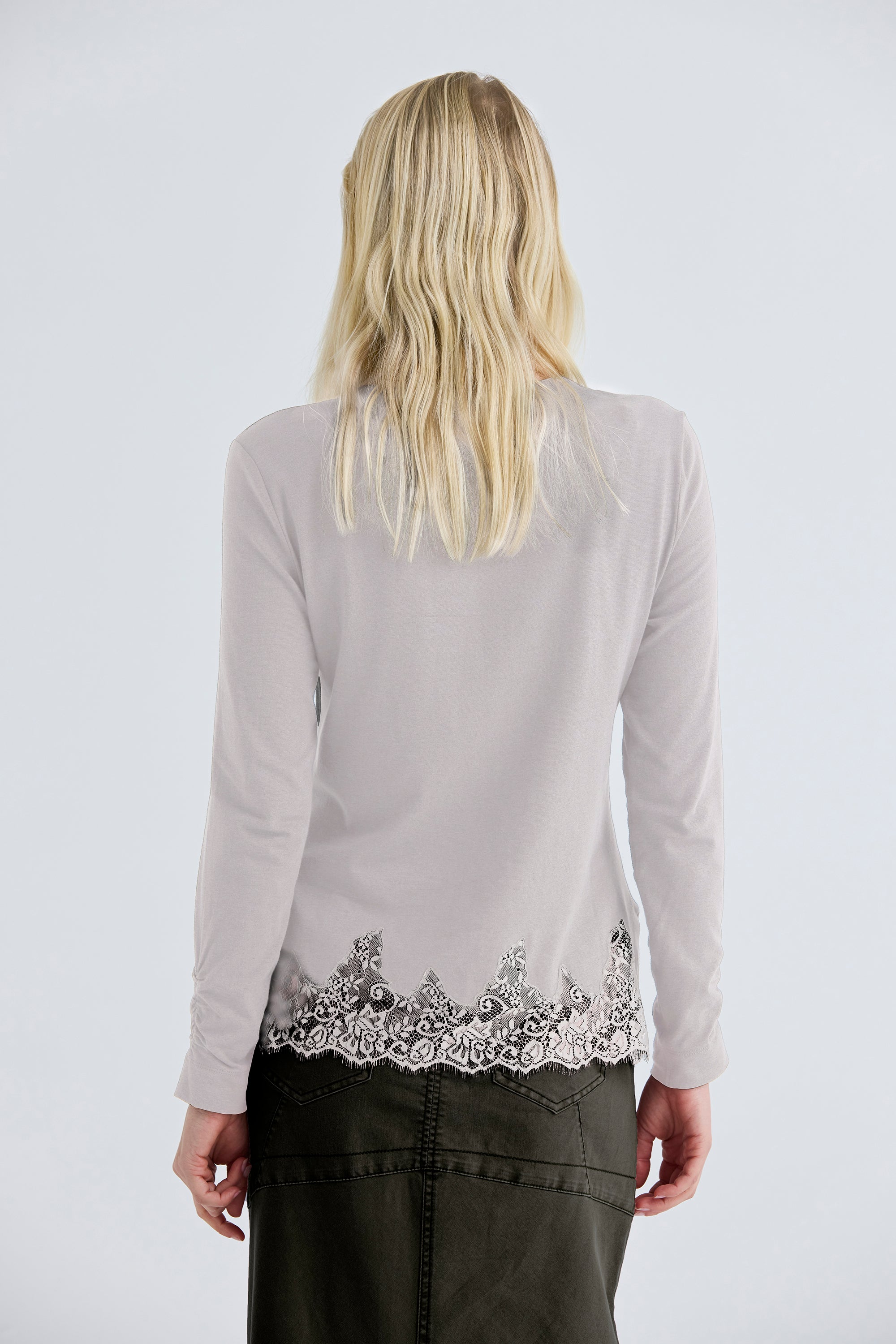 The Belle Top is a wool blend long sleeve knit that combines warmth with elegance, making it perfect for winter layering. It features a dyed-to-match cutaway eyelash lace detail at the hemline, adding a subtle touch of sophistication to your everyday look.
