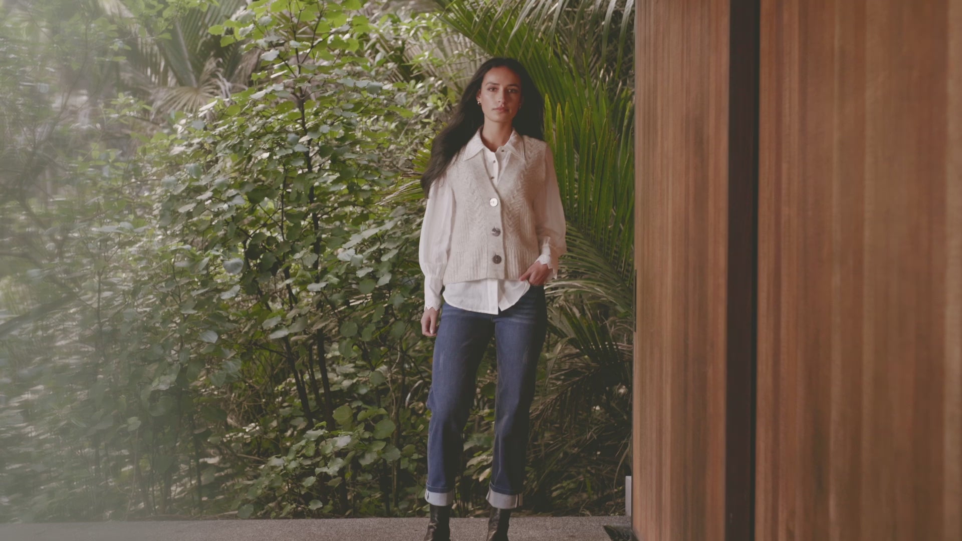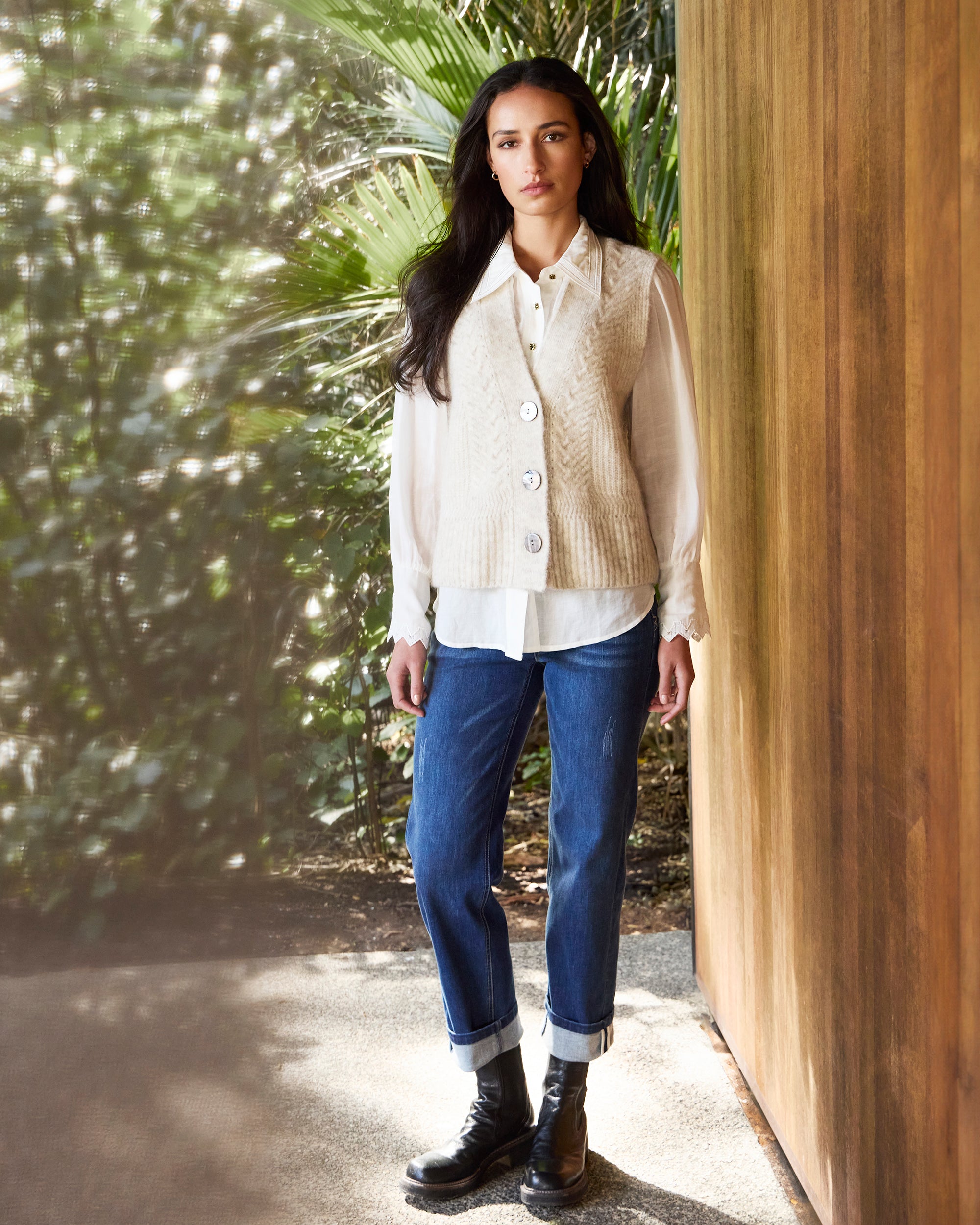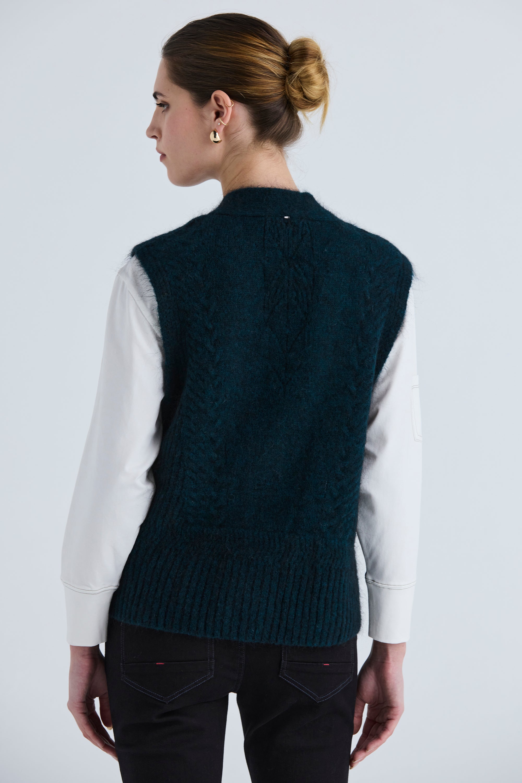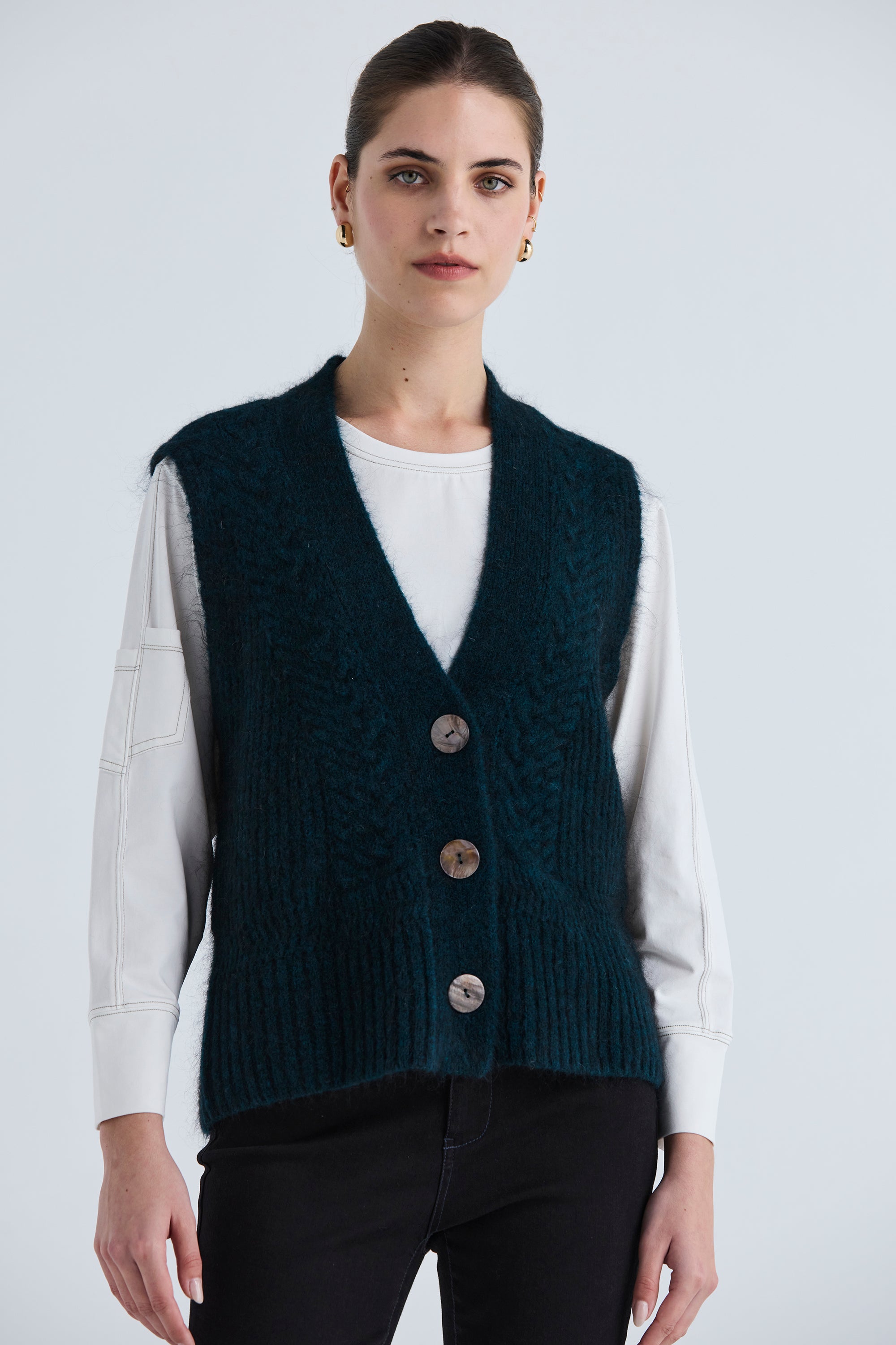 Elevate your style with the Brand Vest, crafted from a soft wool and mohair blend. This knitted vest showcases intricate detailing and is adorned with smoke shell buttons, perfect for layering this season.