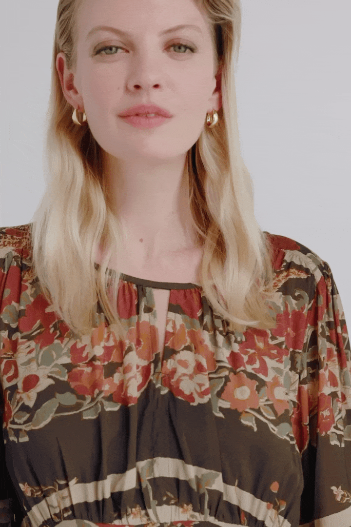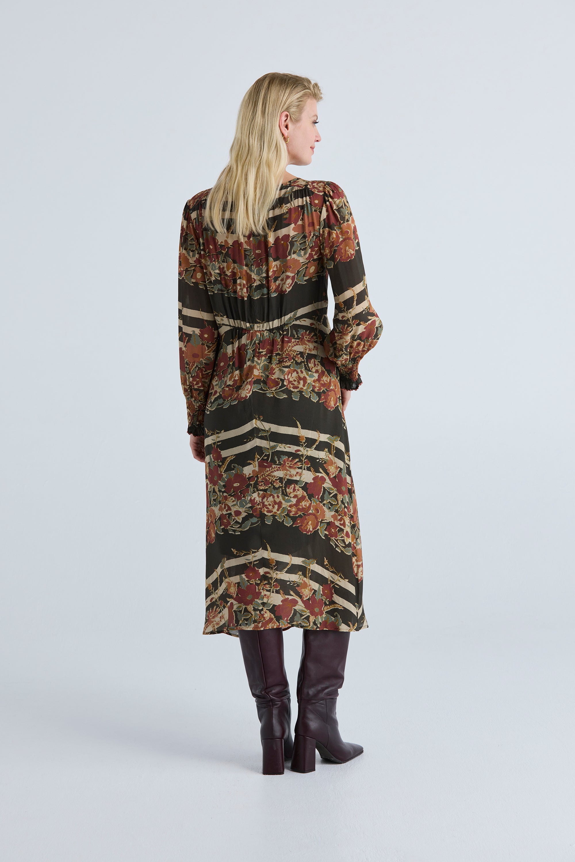 Crafted from a soft viscose cotton blend, the Jasmine Dress showcases the striking striped floral Jasmine print. A gathered round neckline with a front cut-out adds a unique detail, while shirred cuffs and delicate embroidery at the sleeve hems completes this elegant piece.