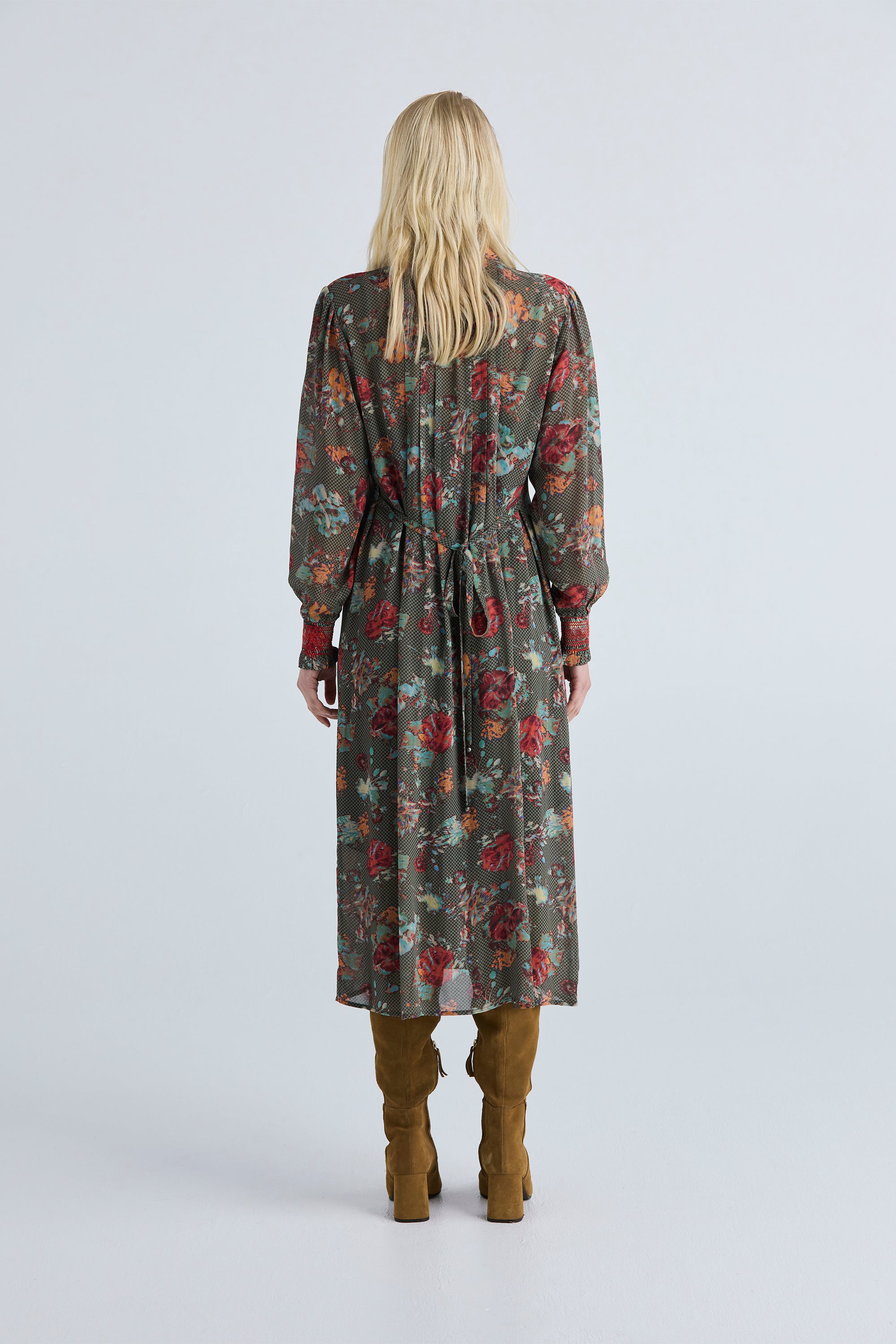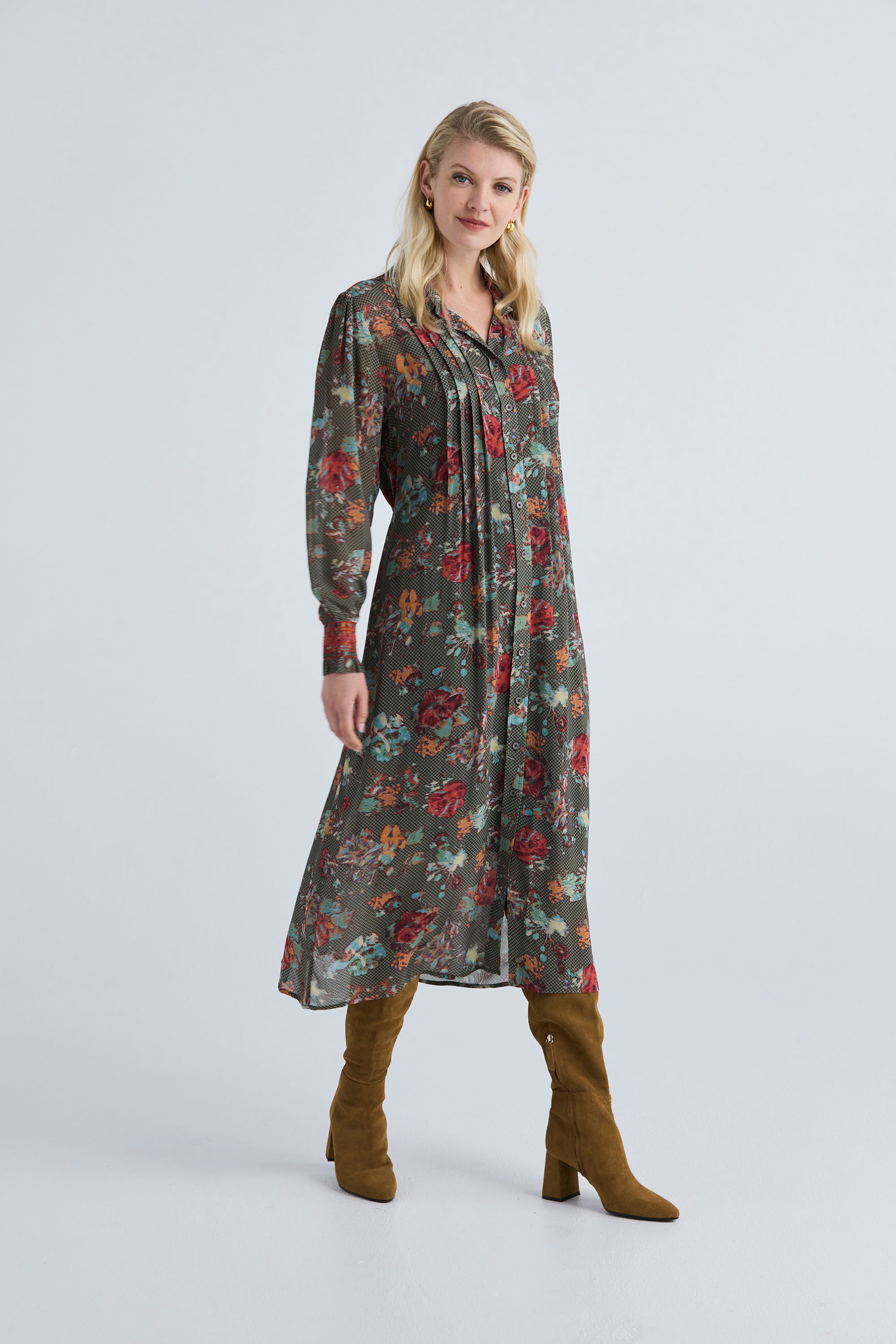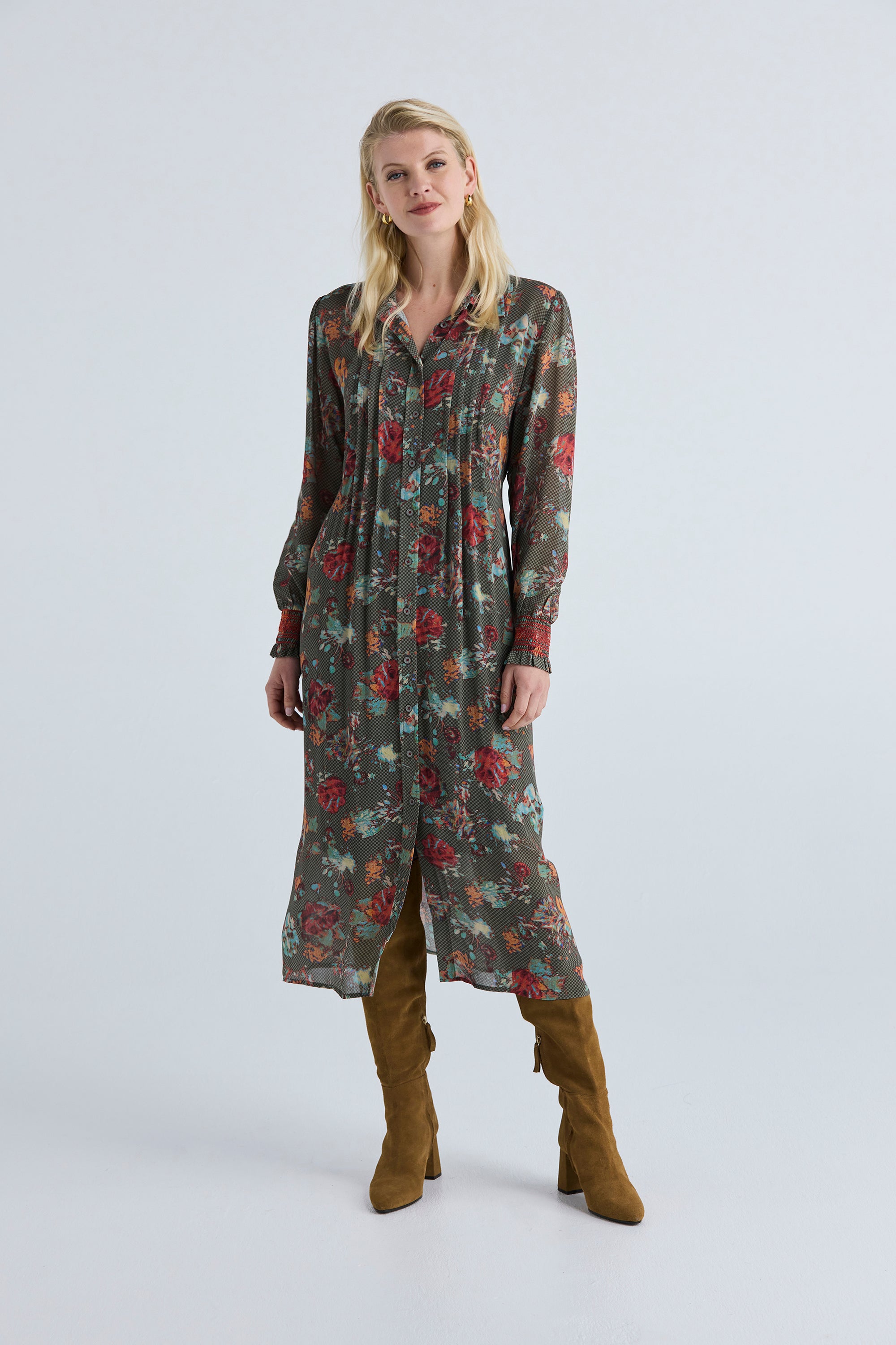 The Tuscan Dress combines elegance and comfort with its floaty viscose georgette fabric and vibrant Tuscan print. This button-through design features a collared neckline, tuck detailing, and a fabric tie belt, while the smocked cuffs in raspberry thread provide a playful finishing touch.