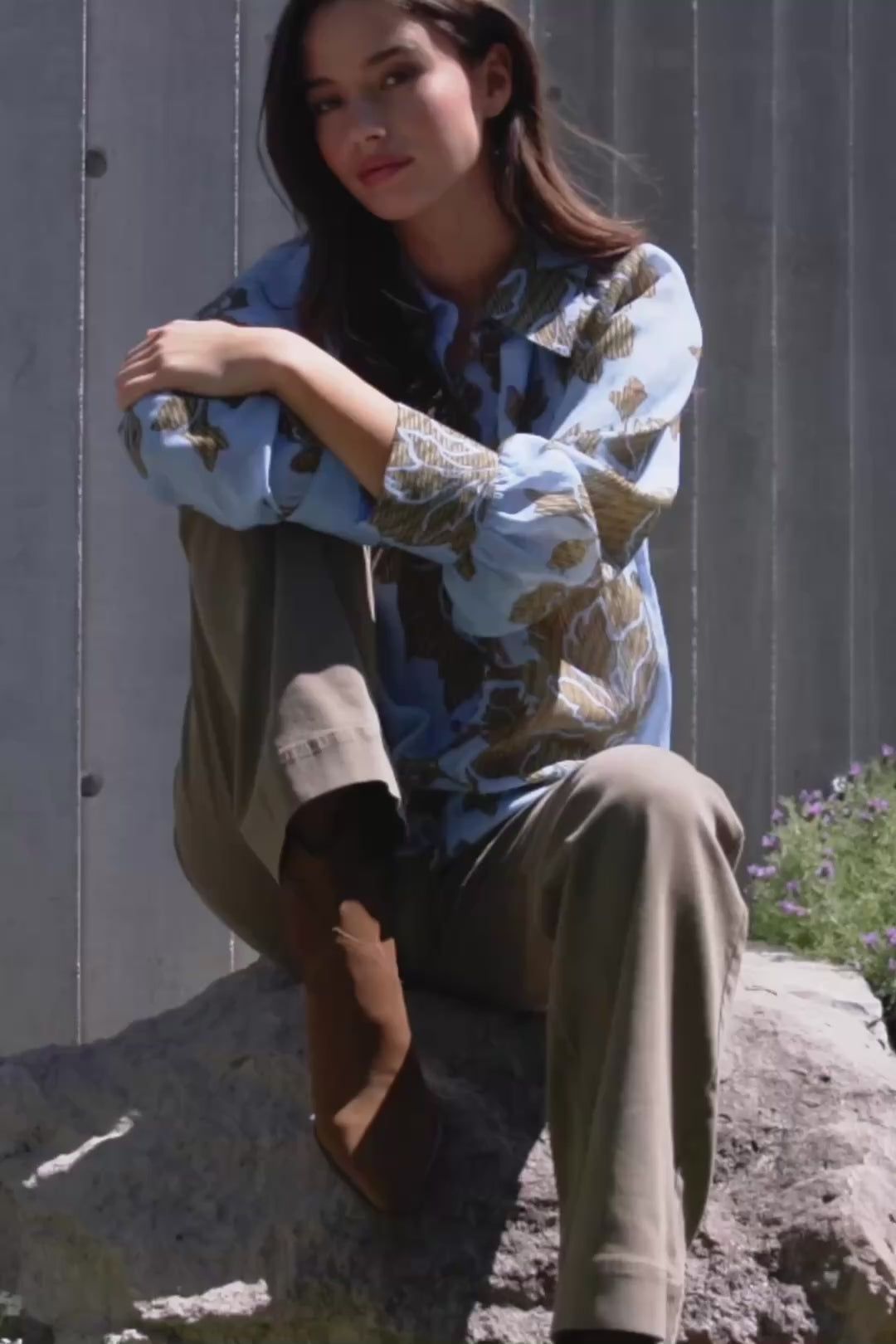 The Cello Shirt, crafted from a Tencel-linen blend, showcases the striking Cello Print. Featuring a collared button-through design with tonal dome glass buttons, it’s finished with soft tucks at the neckline and sleeve head for a flattering fit. A versatile wardrobe staple for sophisticated, modern styling.