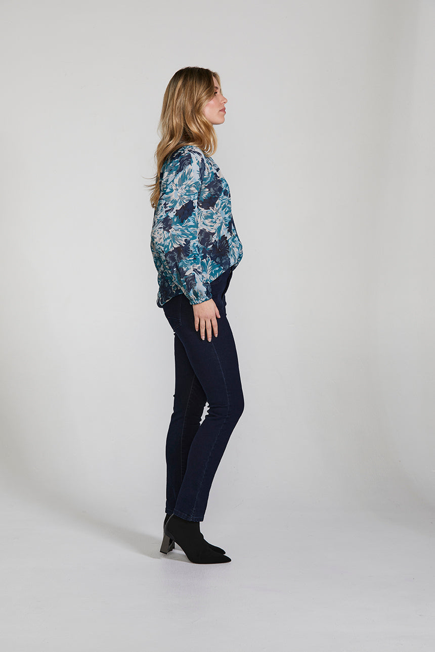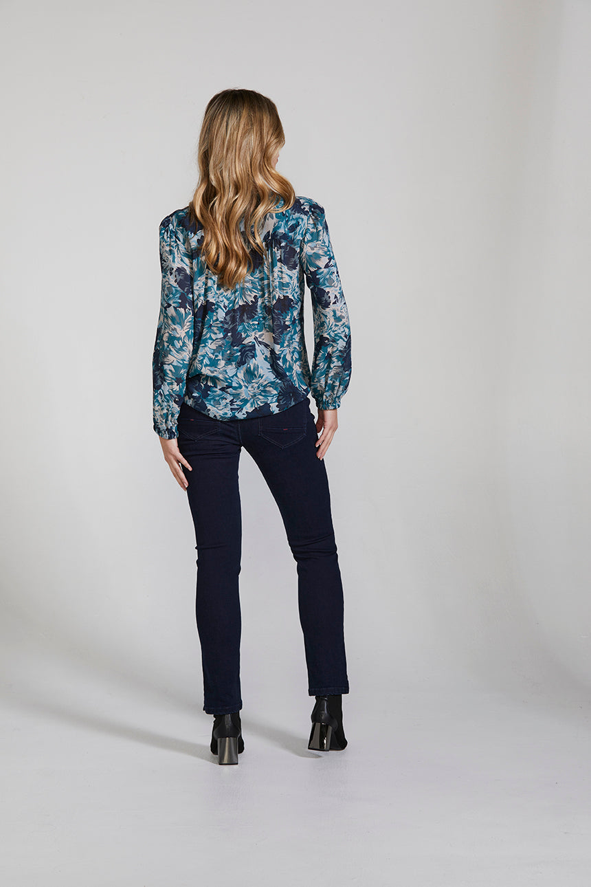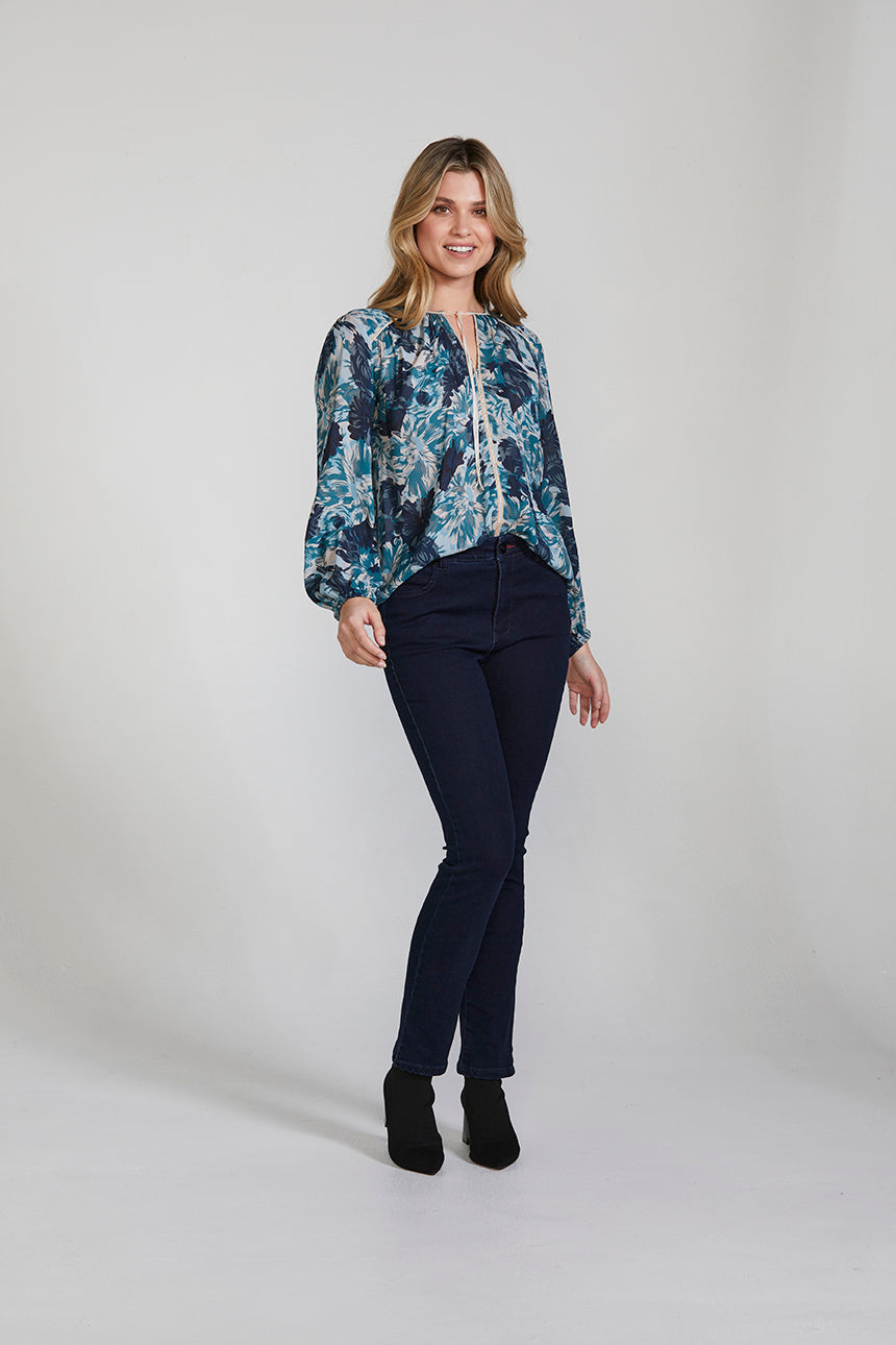 The Adore Top is in soft sheer fabric with a floral print. Features soft gathers at cuff and keyhole opening at CF neck with contrast velvet tape detail.