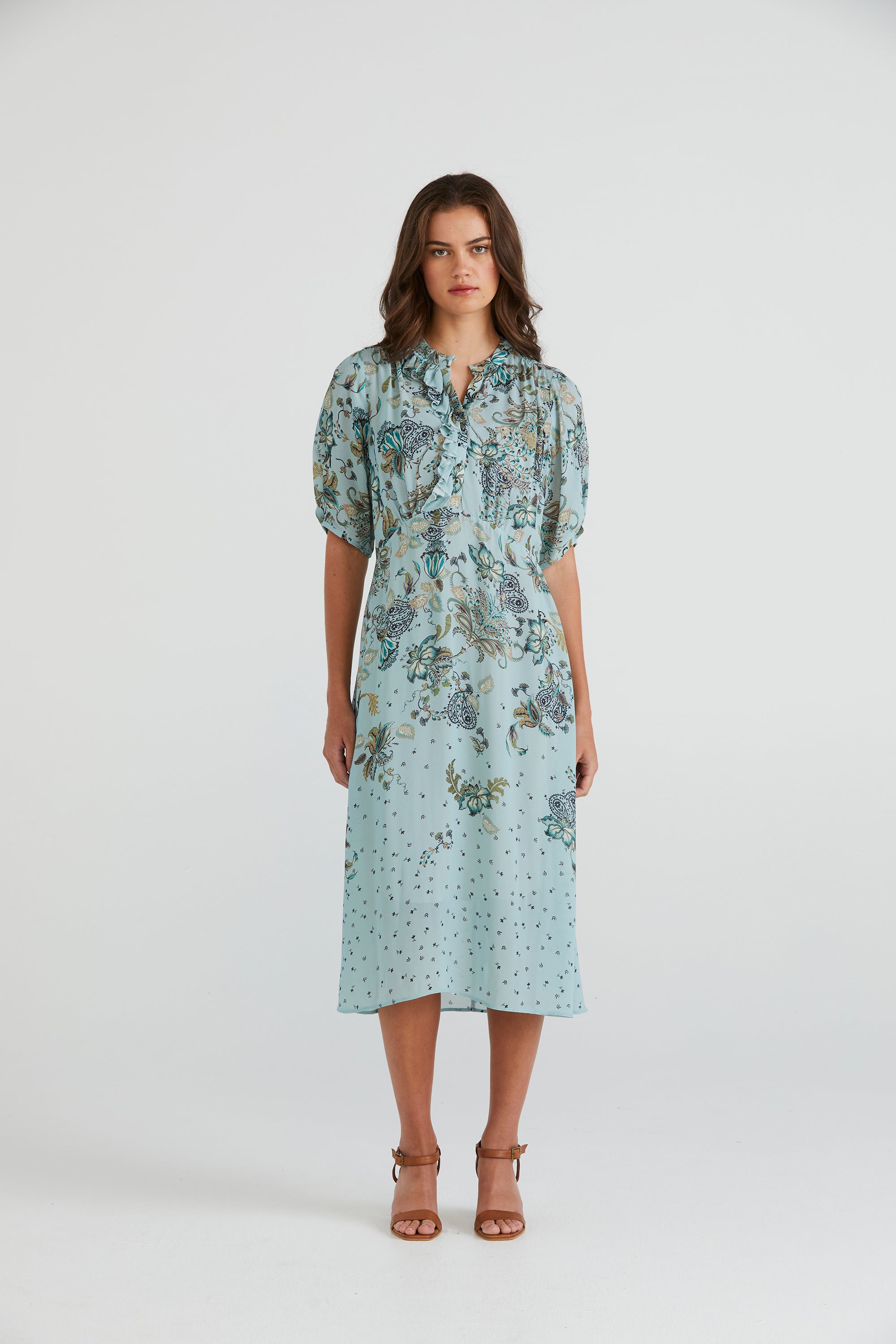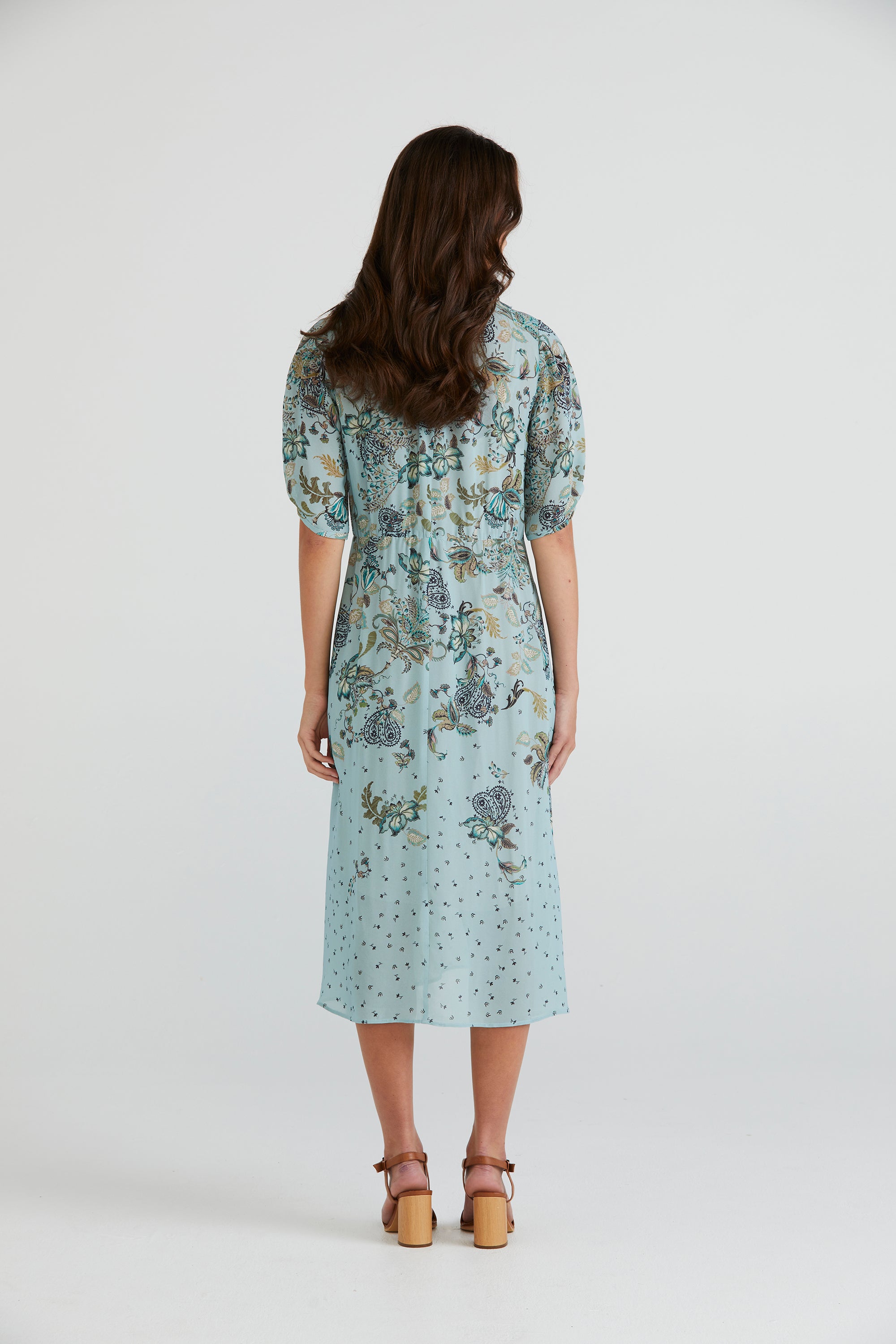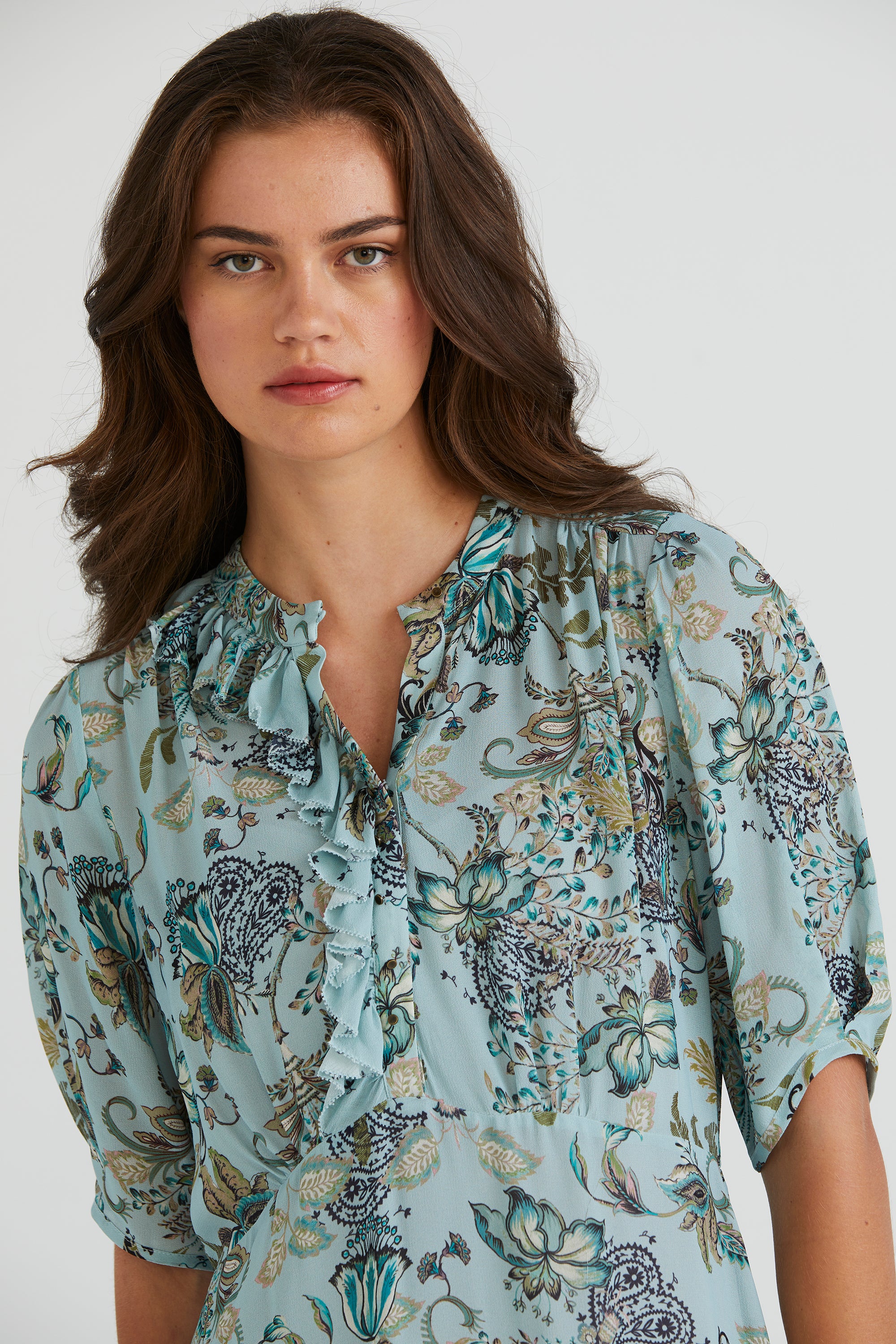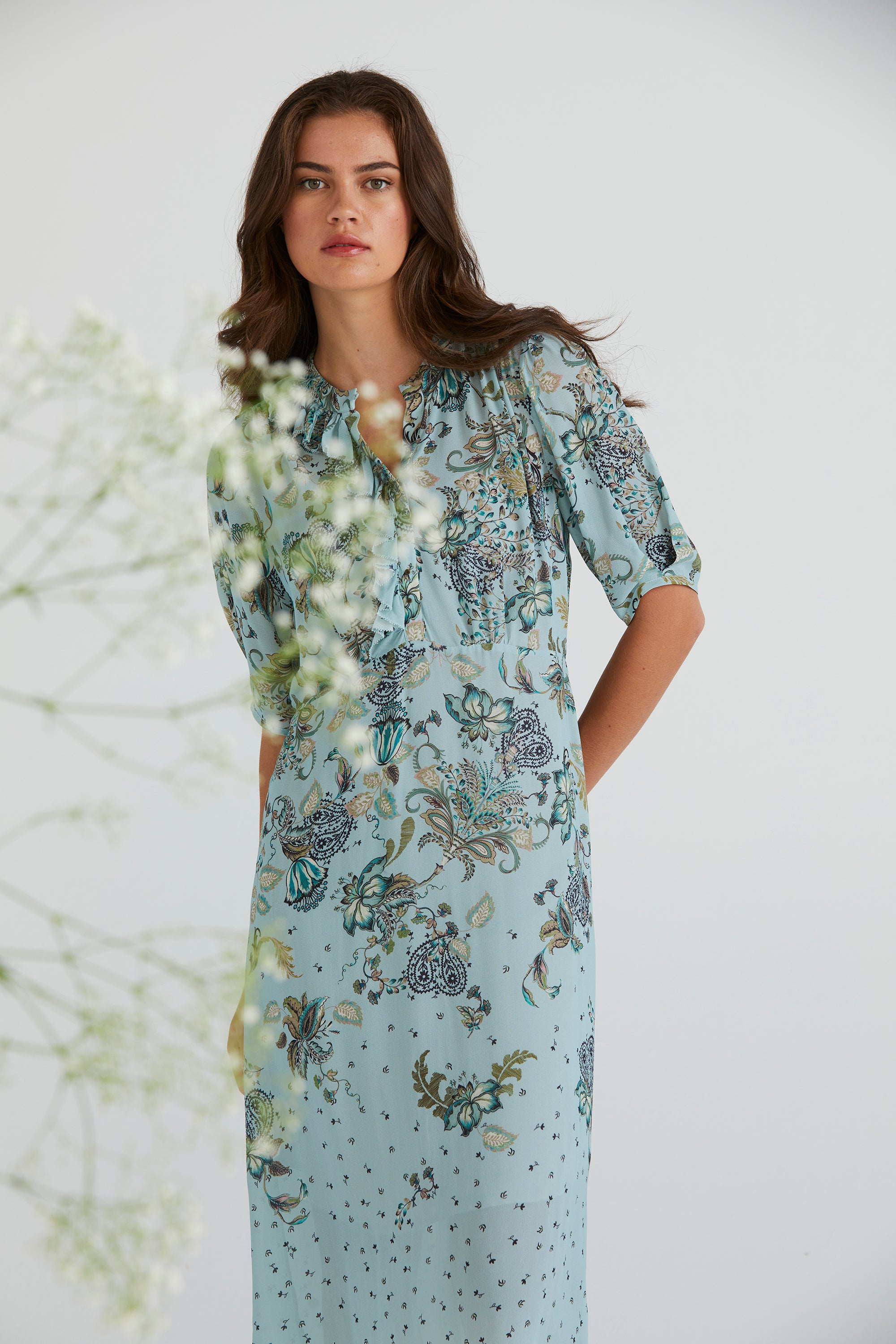 Step into sophistication with the Allura Dress, crafted from viscose georgette in the elegant Allura print. Its placement print design features a raining floral border at the hem, adding a timeless touch. Featuring picot-edged ruffle detail at the right side of the neckline, adorned with decorative gold buttons, this dress exudes refined femininity. With pleated sleeve hem design and elasticated back waist, it offers both style and comfort for any event.