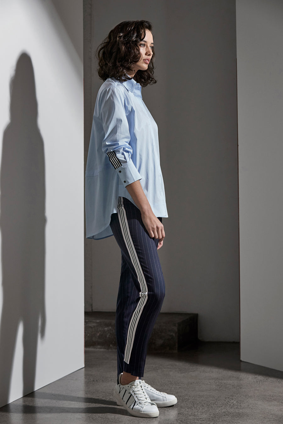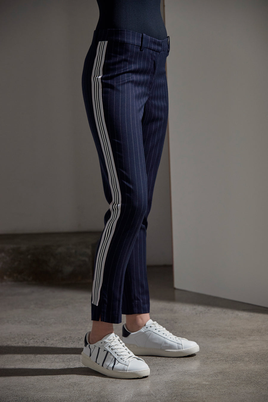 A dressy pant; slim leg with hem split; featuring novelty tape at outleg; contrast stripe waistband facing for extra comfort.