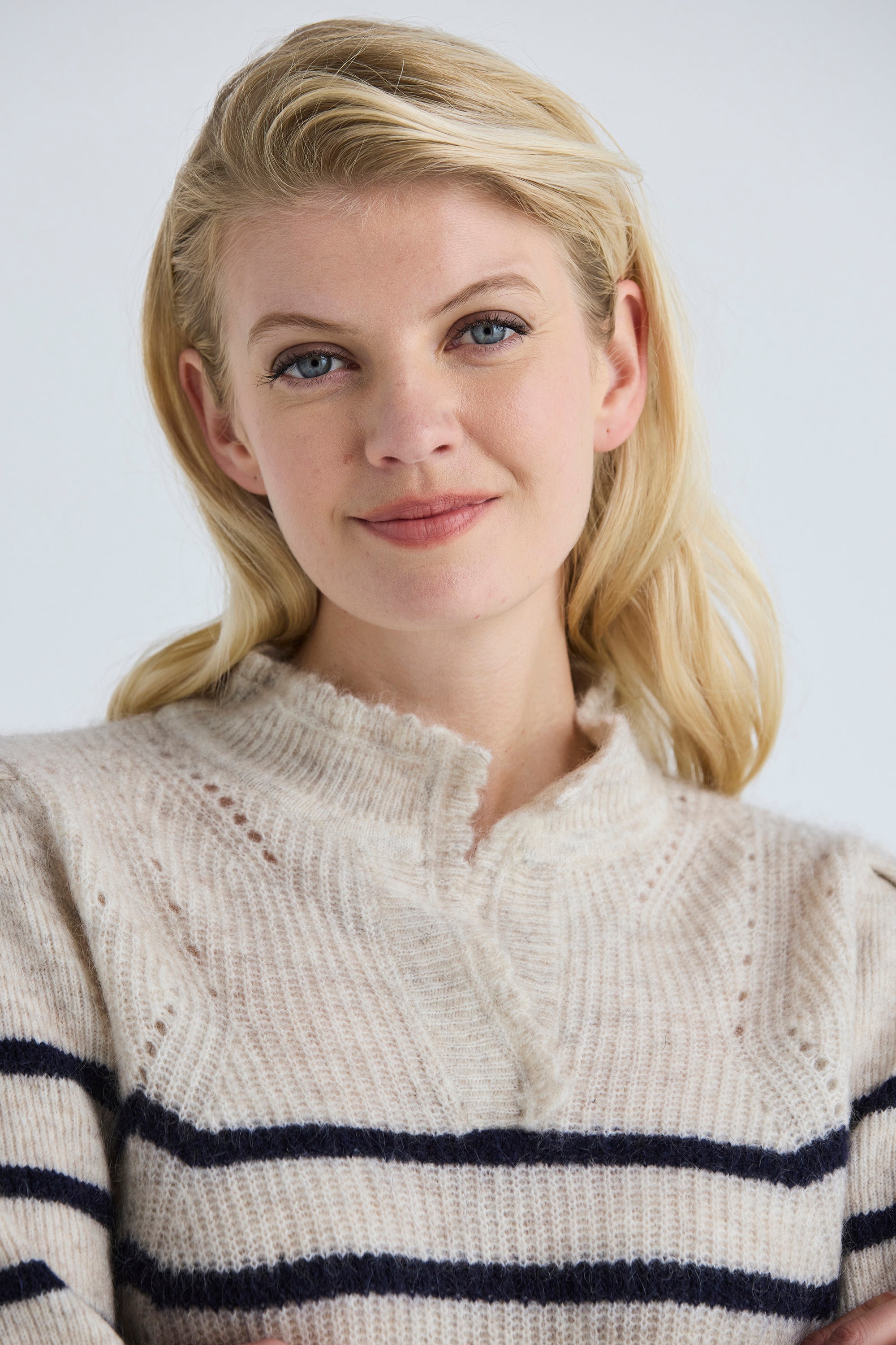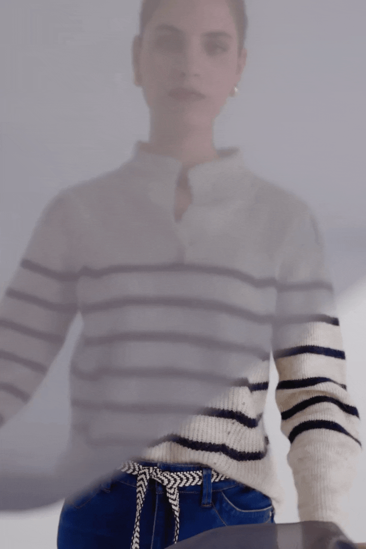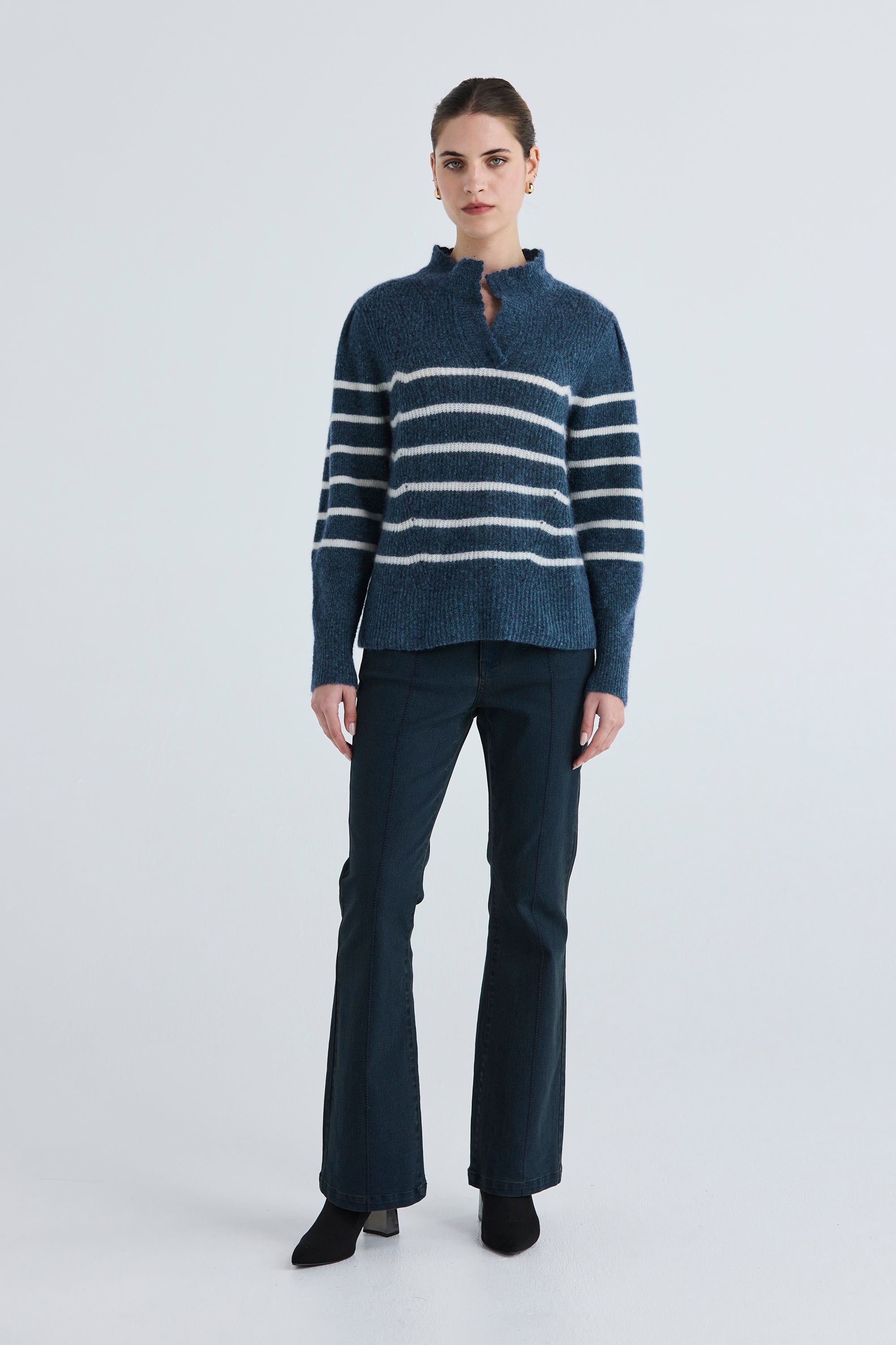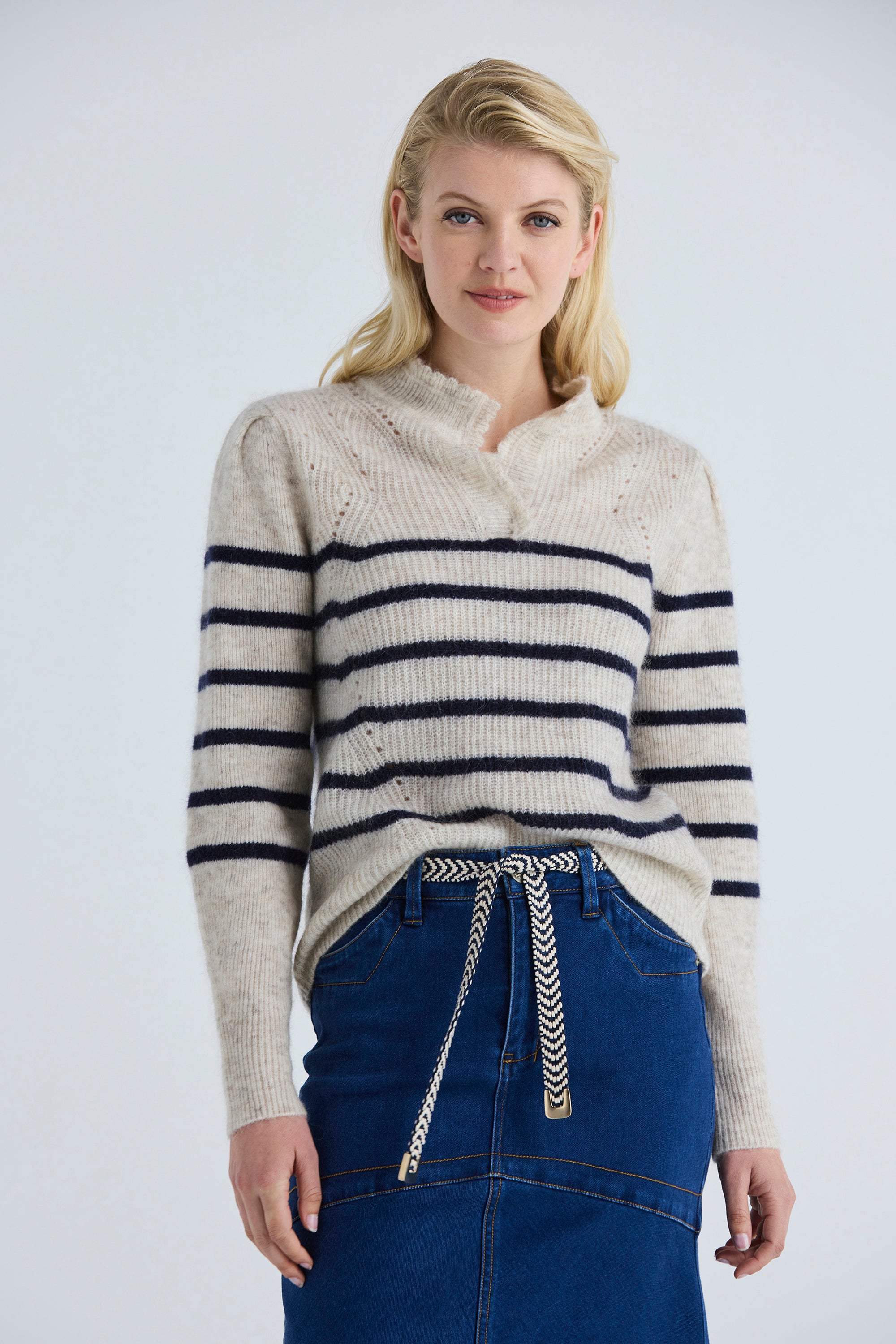 The Amelia Sweater is crafted from a soft mohair merino blend in a marled knit. It features a placement stripe design across the body and a placket neckline edged with a picot edge knit detail, with tucks at the shoulder for a refined silhouette.