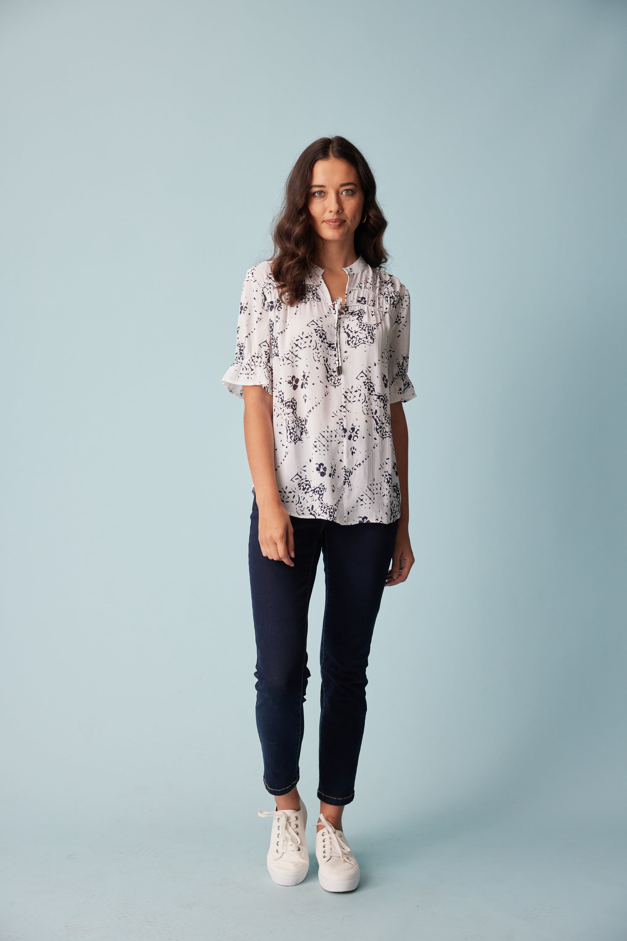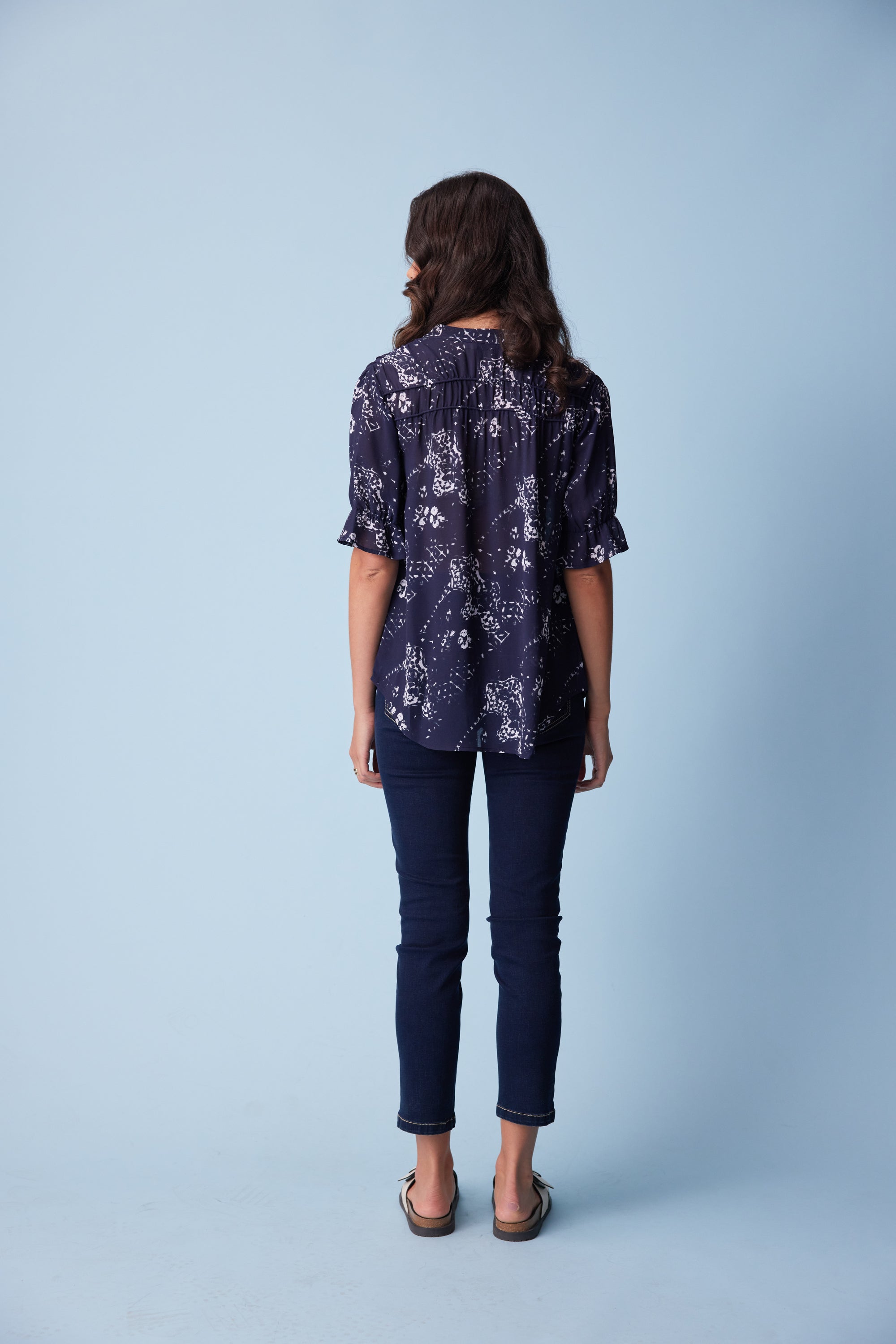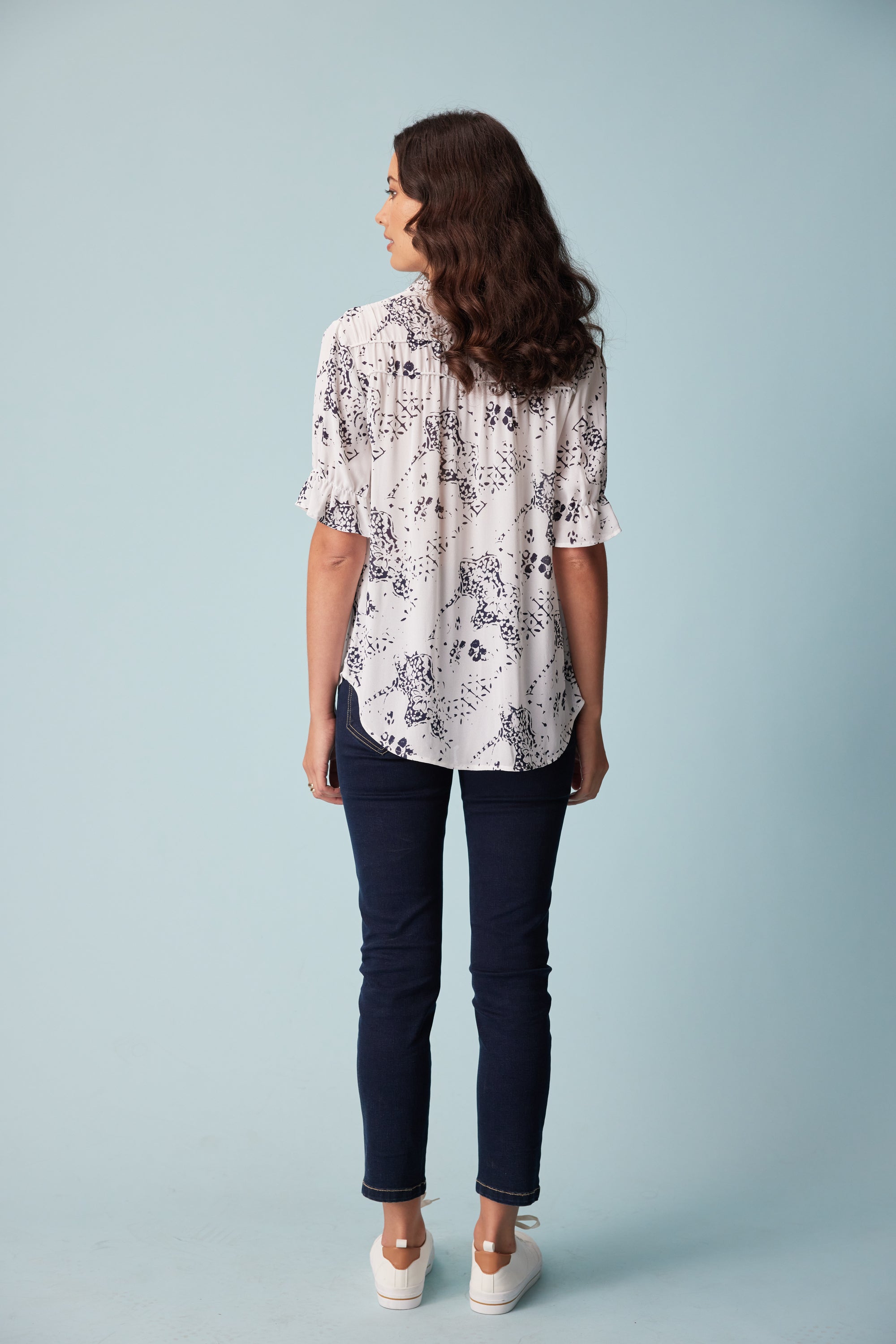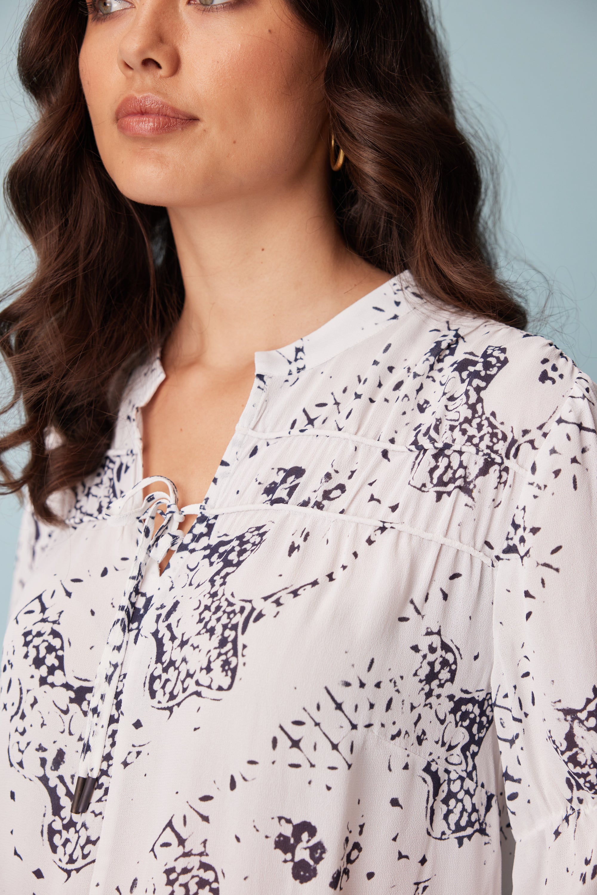 This subtle antique print is elegantly formed into this flattering loose-fitting top with a bound split opening and rouleaux neck ties. The yoke panels are lightly gathered over rows of corded piping to complete the refined feminine look.