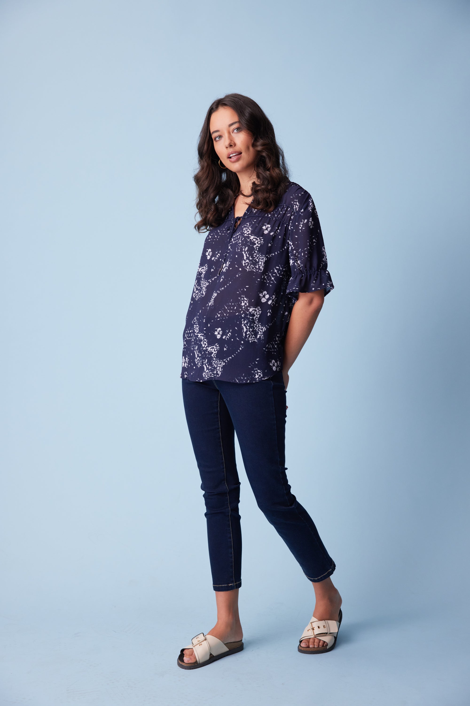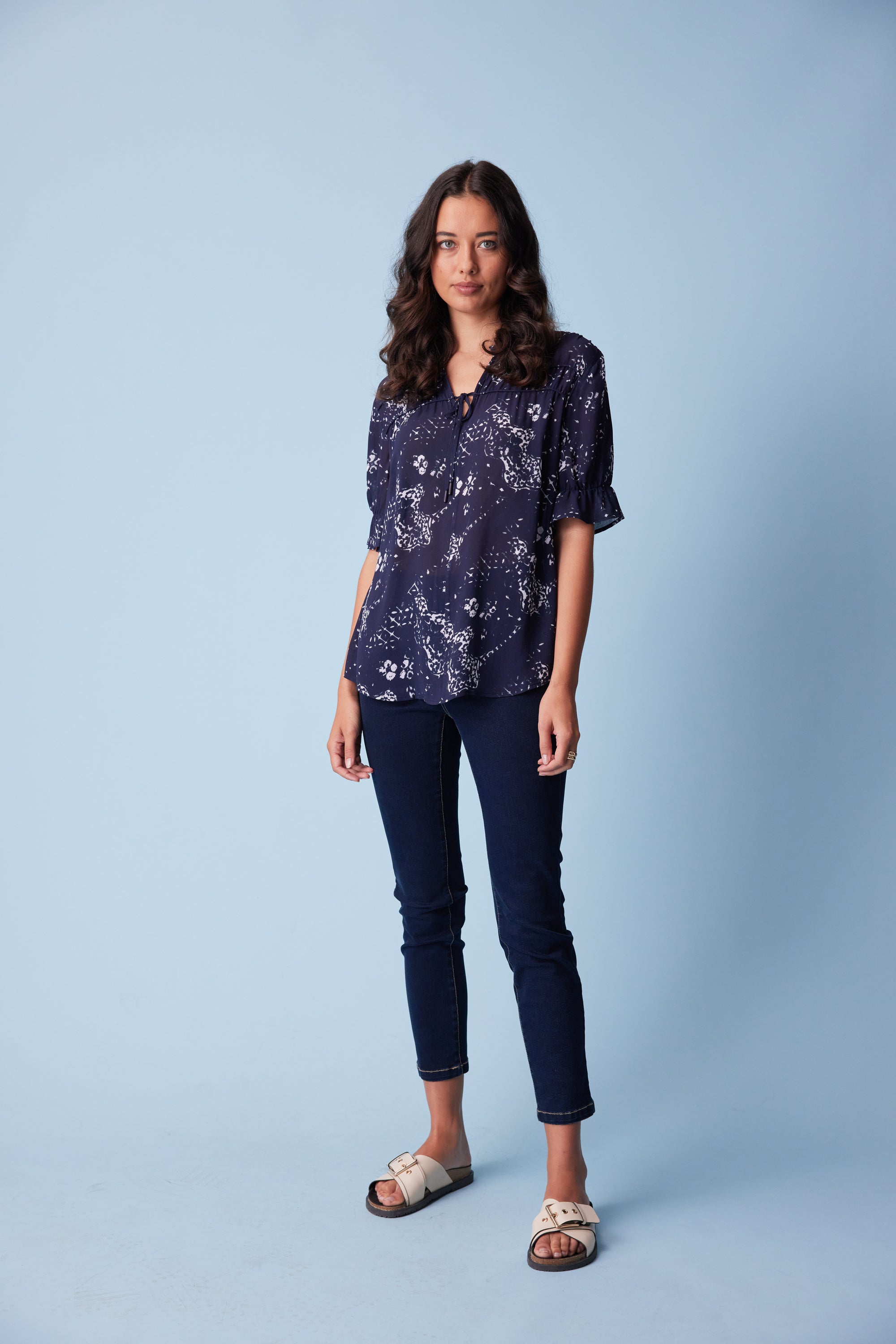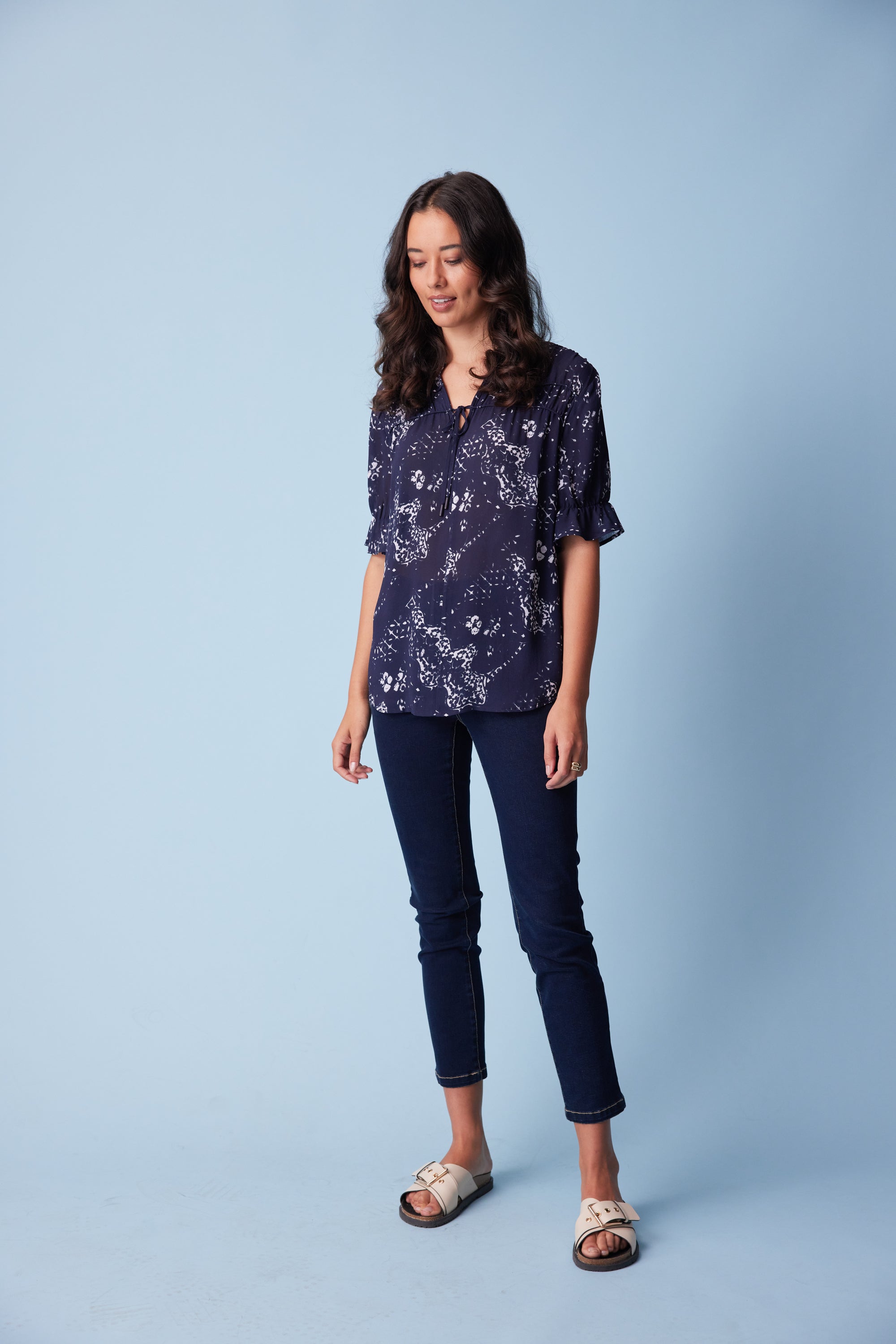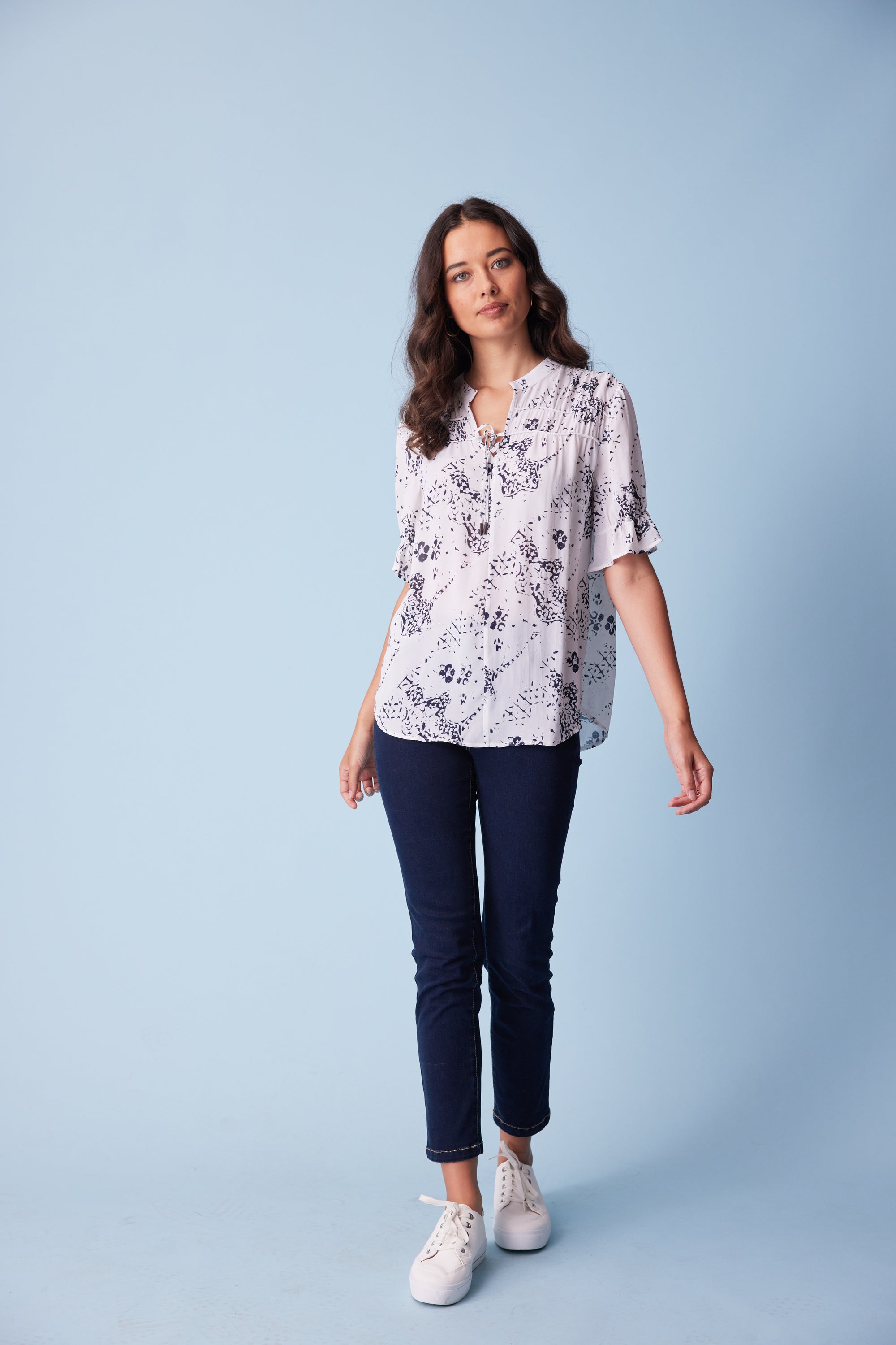 This subtle antique print is elegantly formed into this flattering loose-fitting top with a bound split opening and rouleaux neck ties. The yoke panels are lightly gathered over rows of corded piping to complete the refined feminine look.