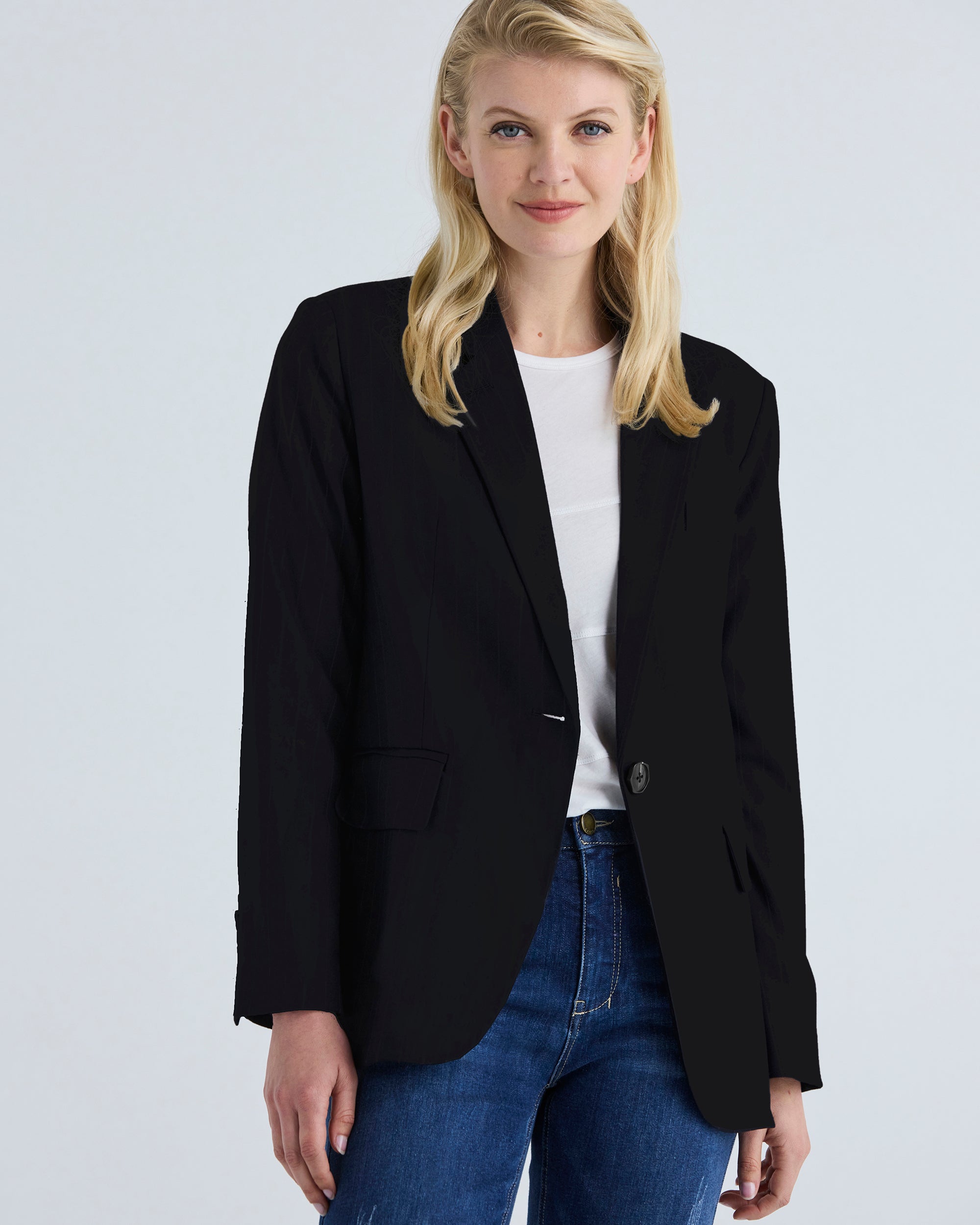 The Athena Jacket is a luxe acetate blend single-breasted longline blazer, featuring asymmetrical black tortoiseshell buttons. Fully lined. A dressy wardrobe staple, pair it with the matching Athena Pant for a chic, modern look.