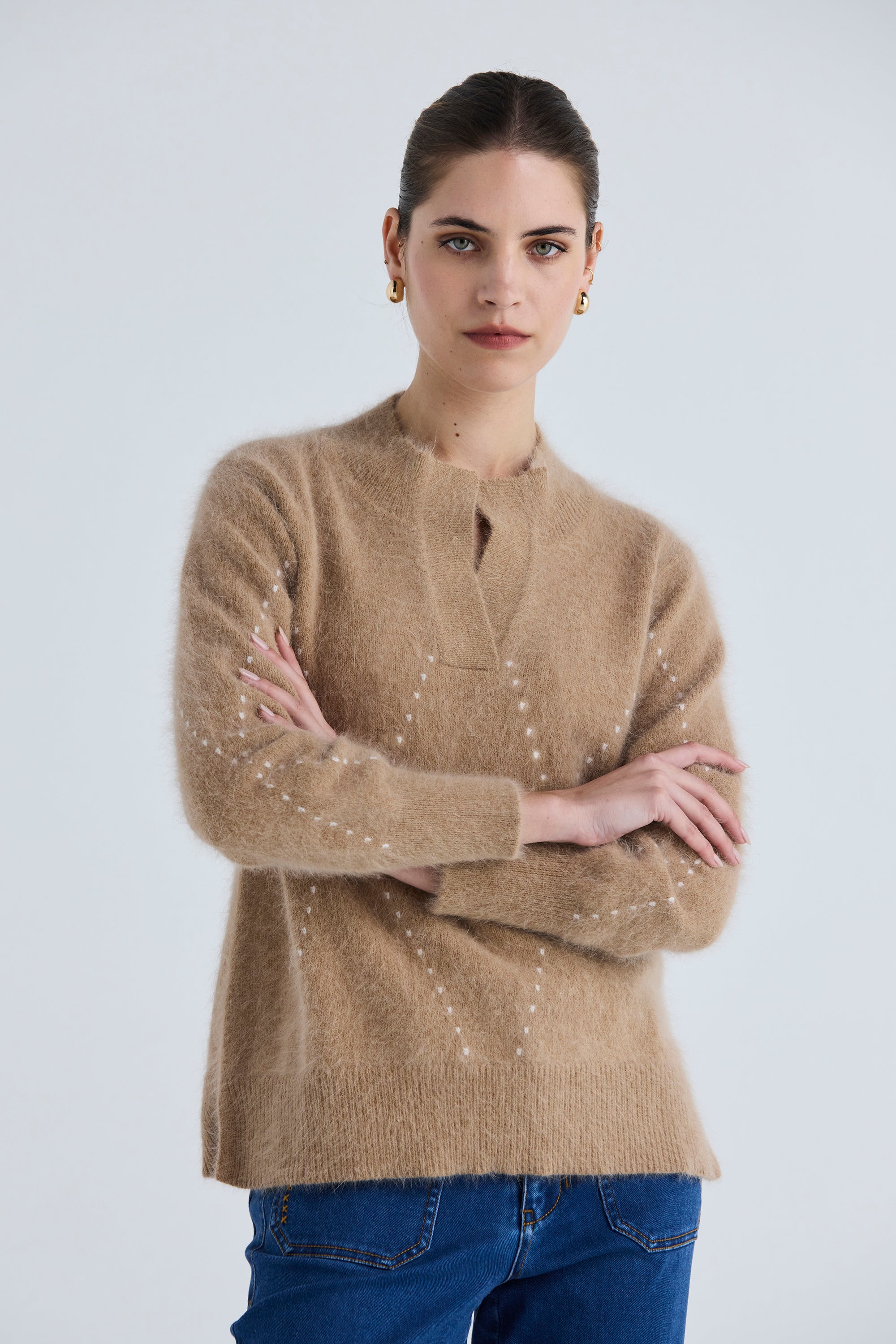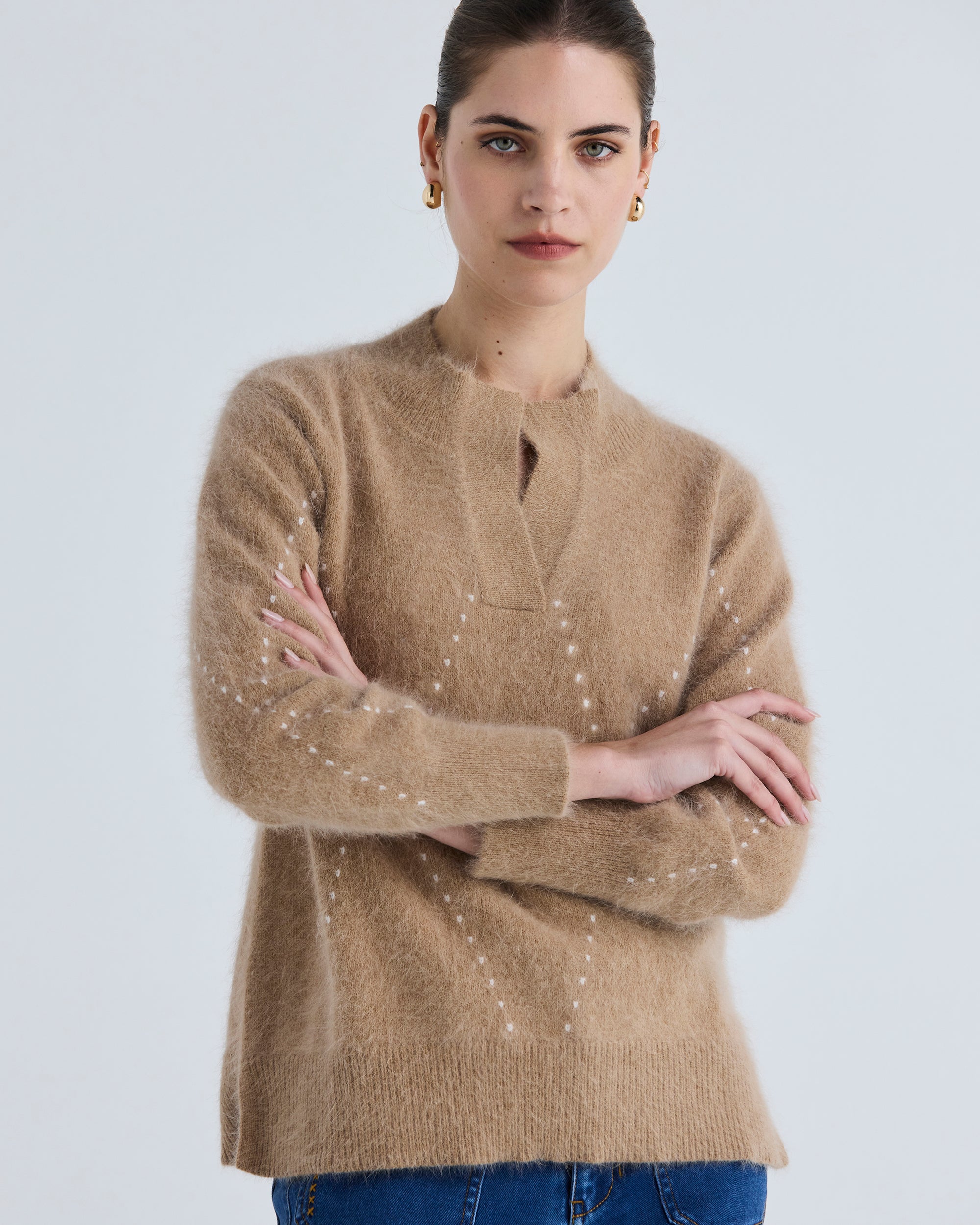The Beau Sweater is crafted from a super soft wool angora blend, offering ultimate coziness. Featuring a classic placket neckline, it's available in two vibrant colours—glacier and sorbet—for a fresh pop to your wardrobe.