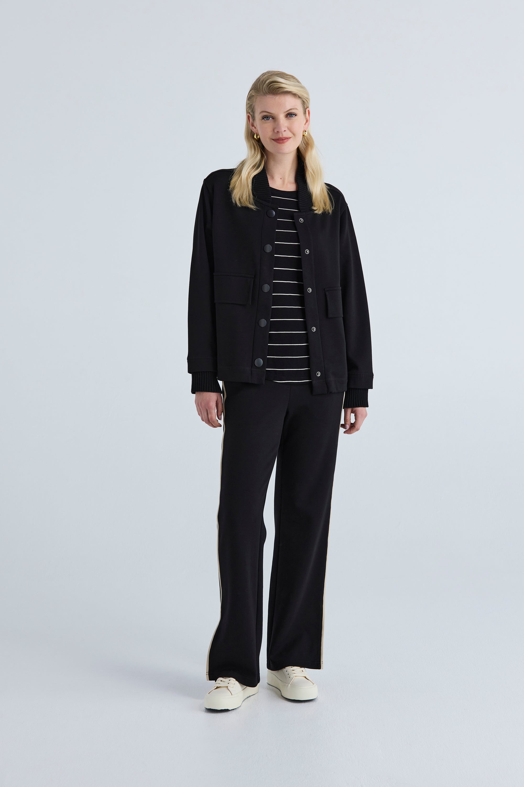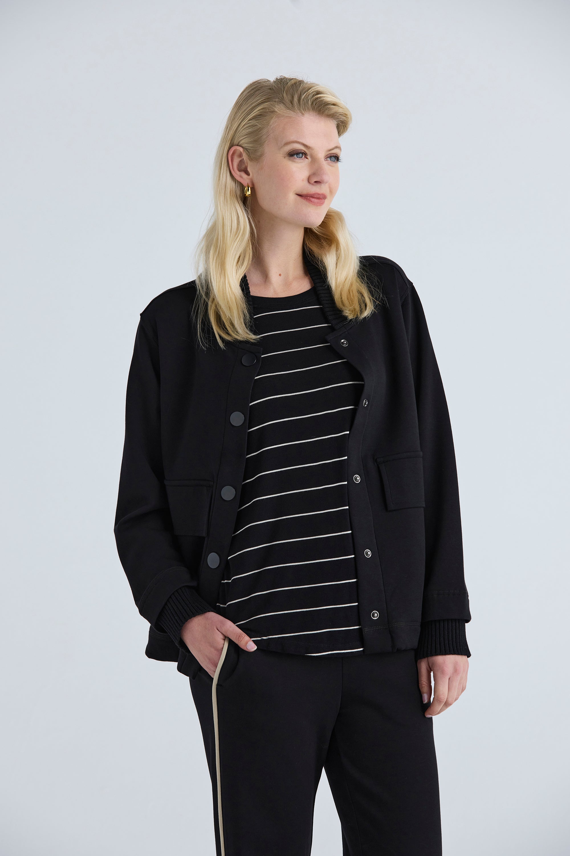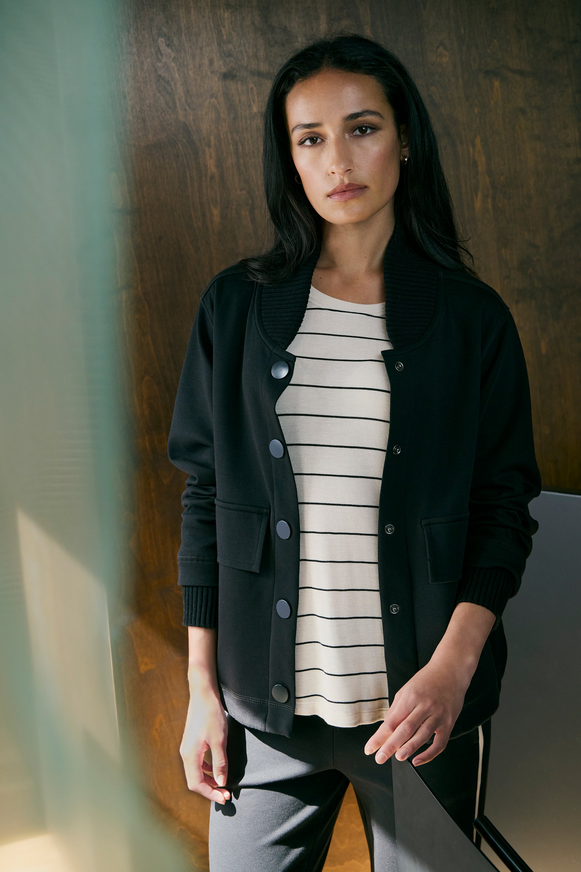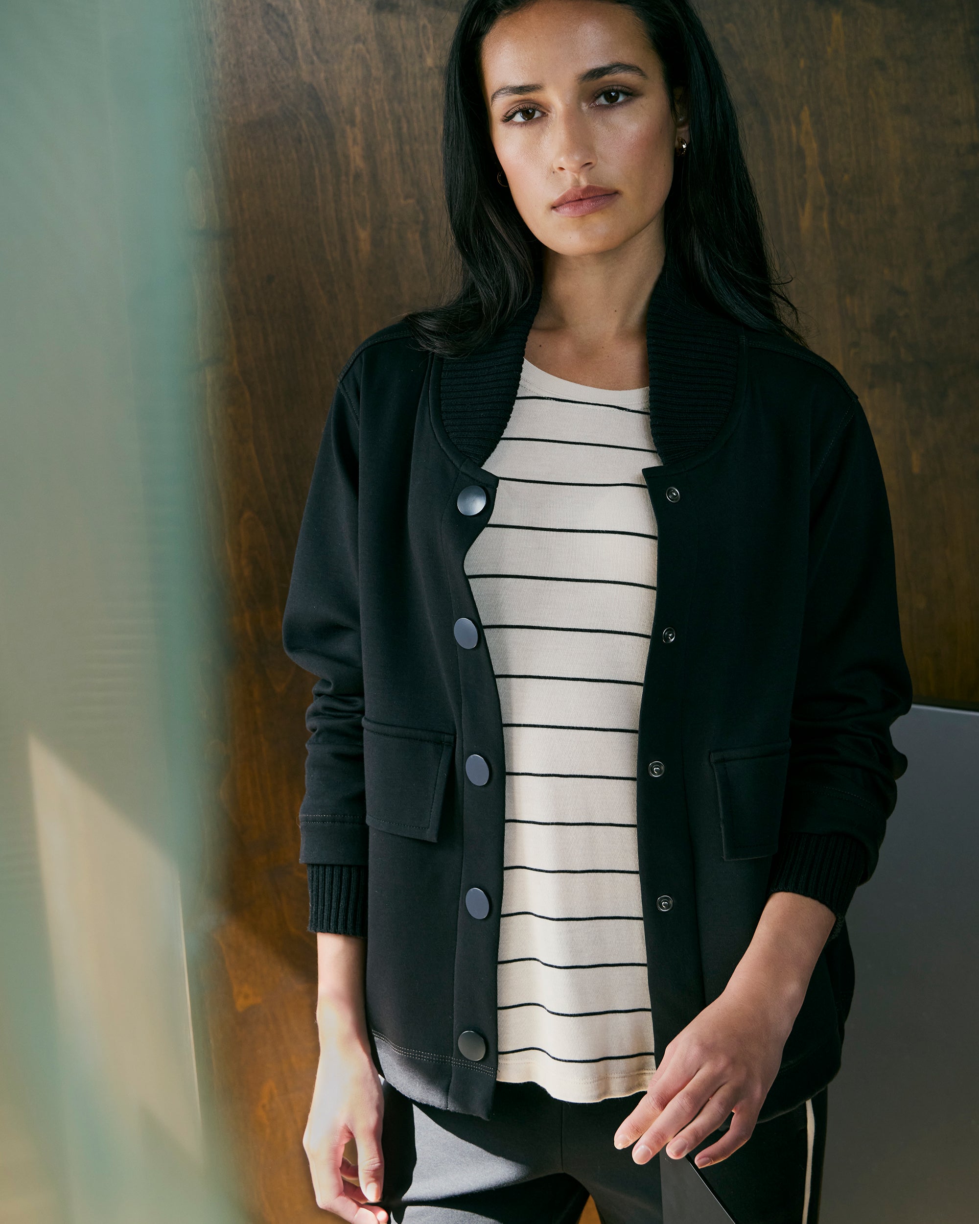 Casual yet refined, this bomber-style jacket is crafted from a cotton blend with powder-coated dome closures, ribbed knit detailing at the collar and cuffs, and functional pockets. Style with the Beaumont Pant for a polished weekend ensemble.