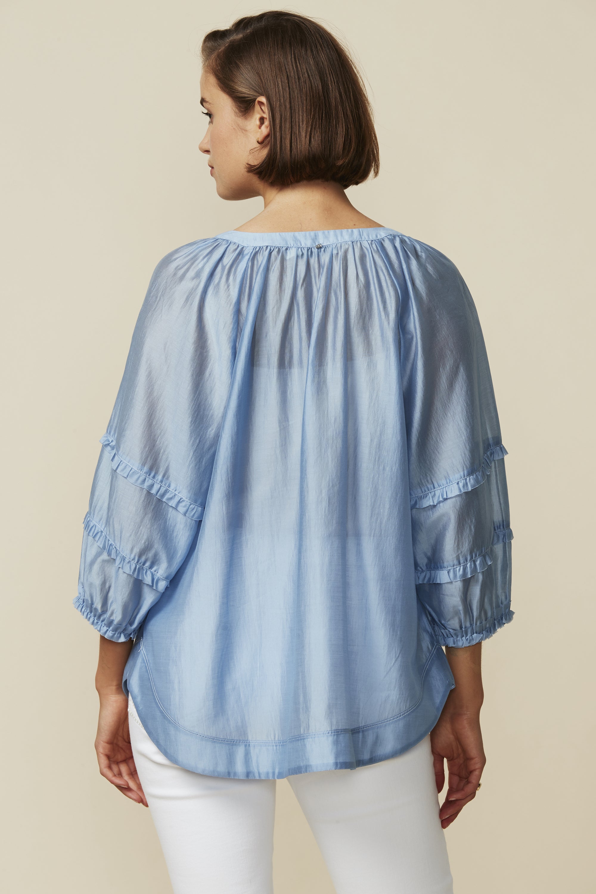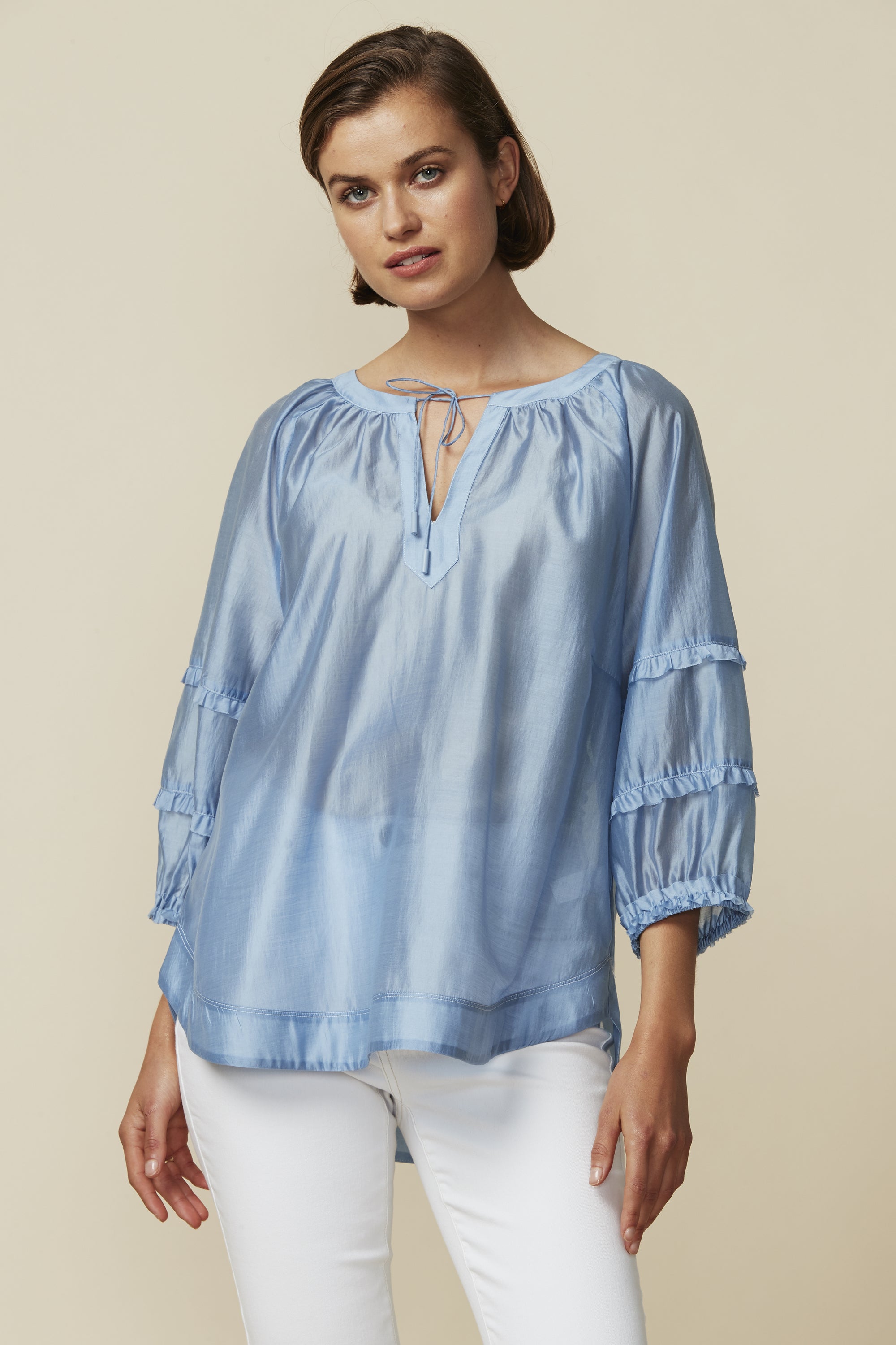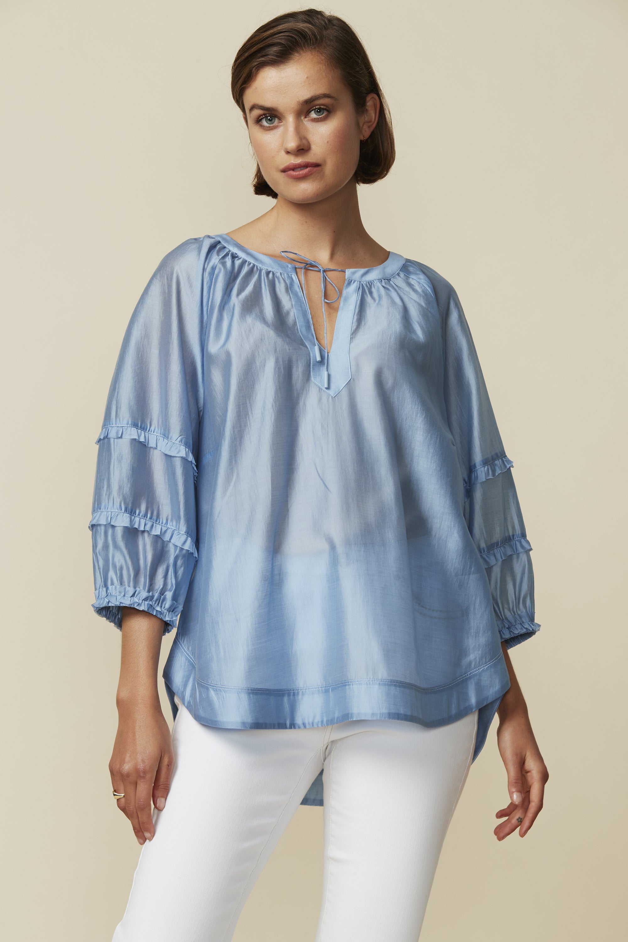 Bella Frill Top, a delicate tencel mix top, round neck with gathers and tie closure, contour high low hem, raglan sleeves featuring frill detail — a summer delight.