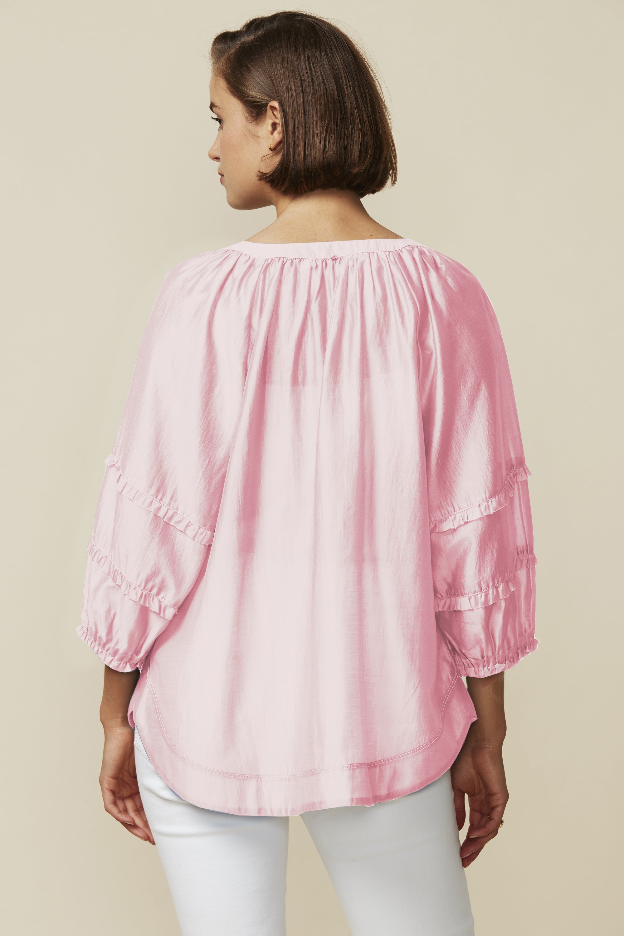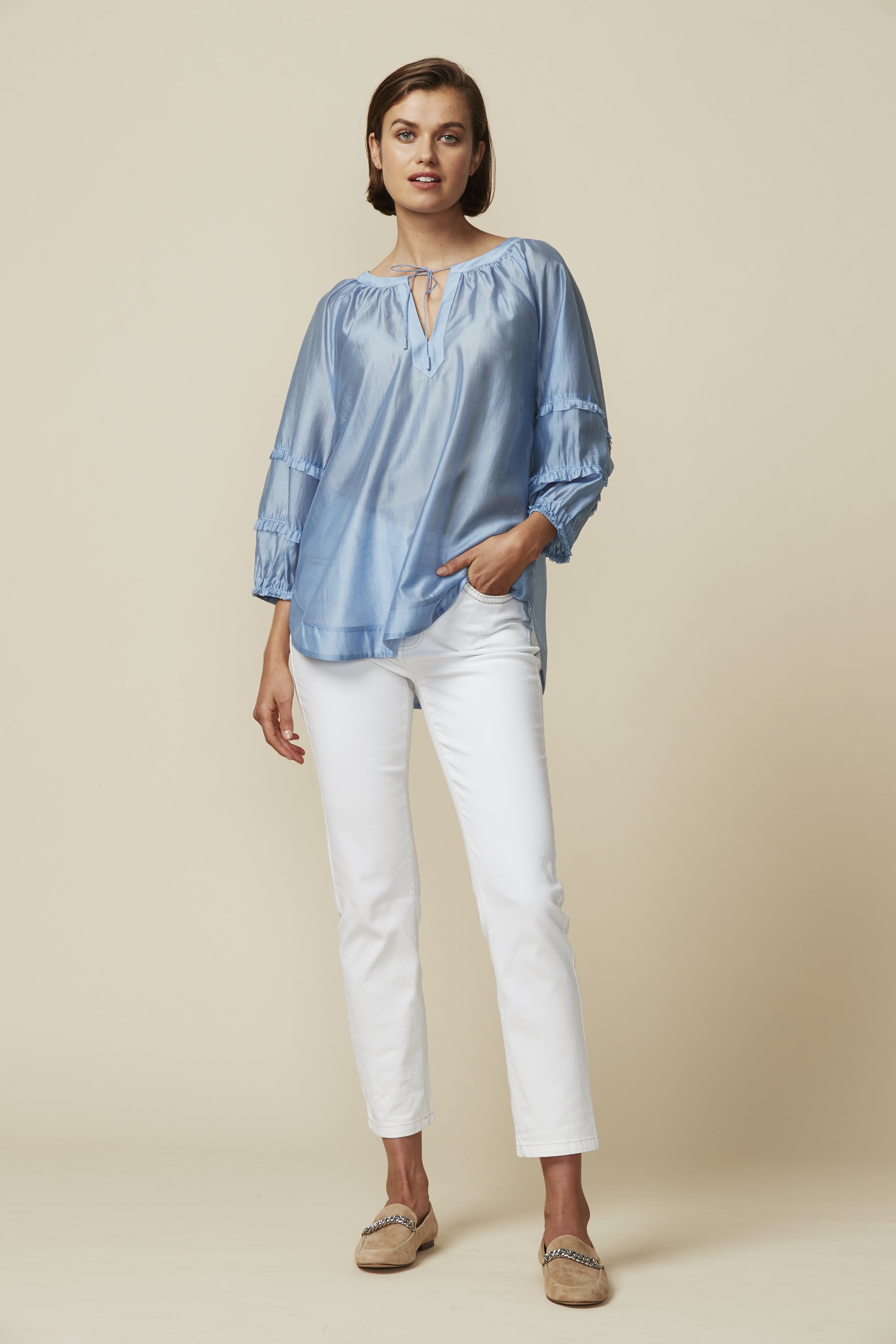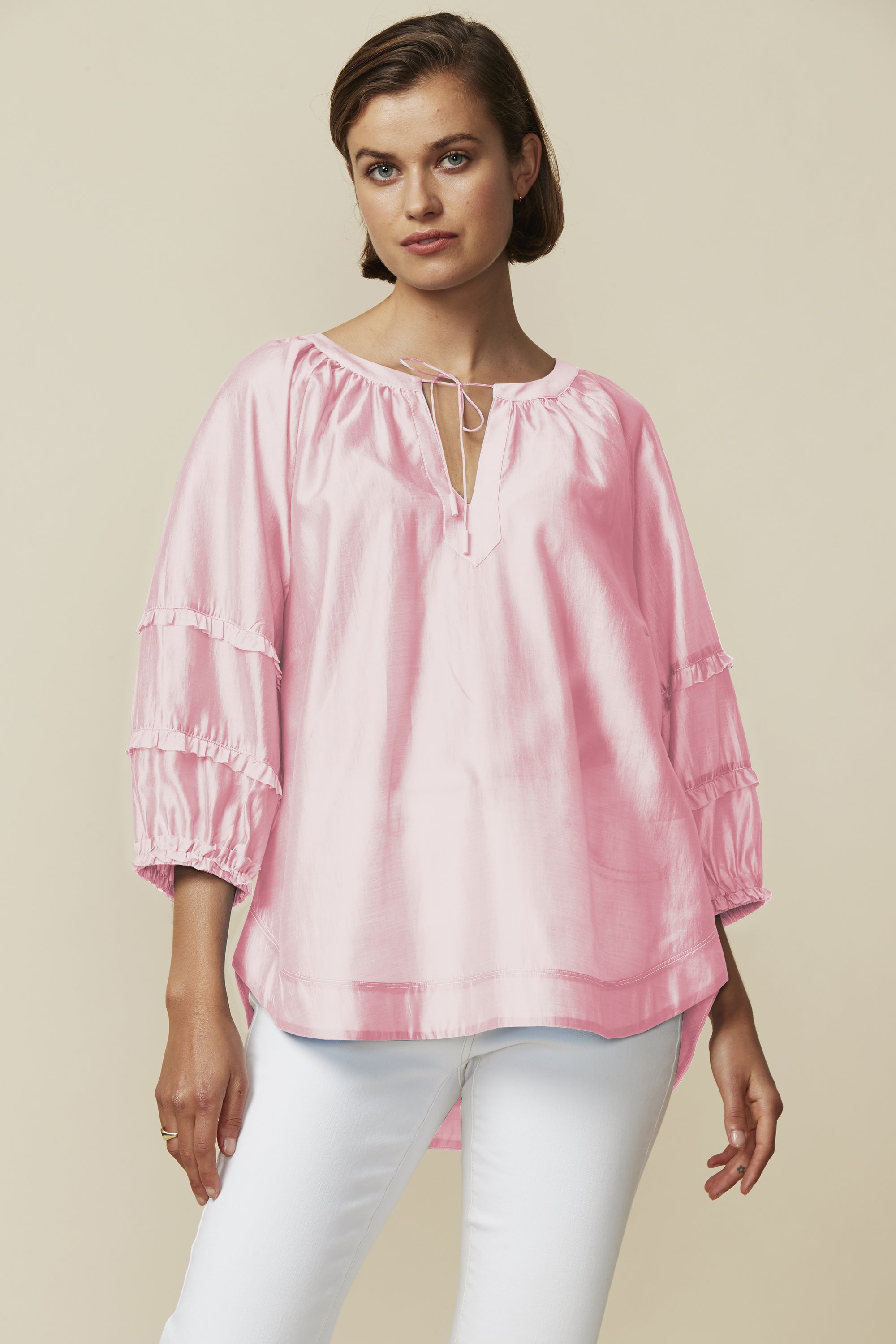 Bella Frill Top, a delicate tencel mix top, round neck with gathers and tie closure, contour high low hem, raglan sleeves featuring frill detail — a summer delight.