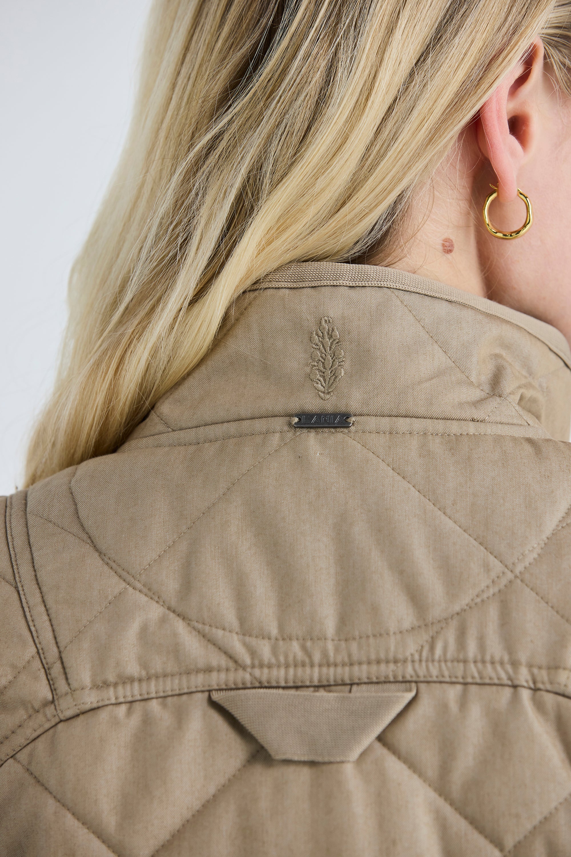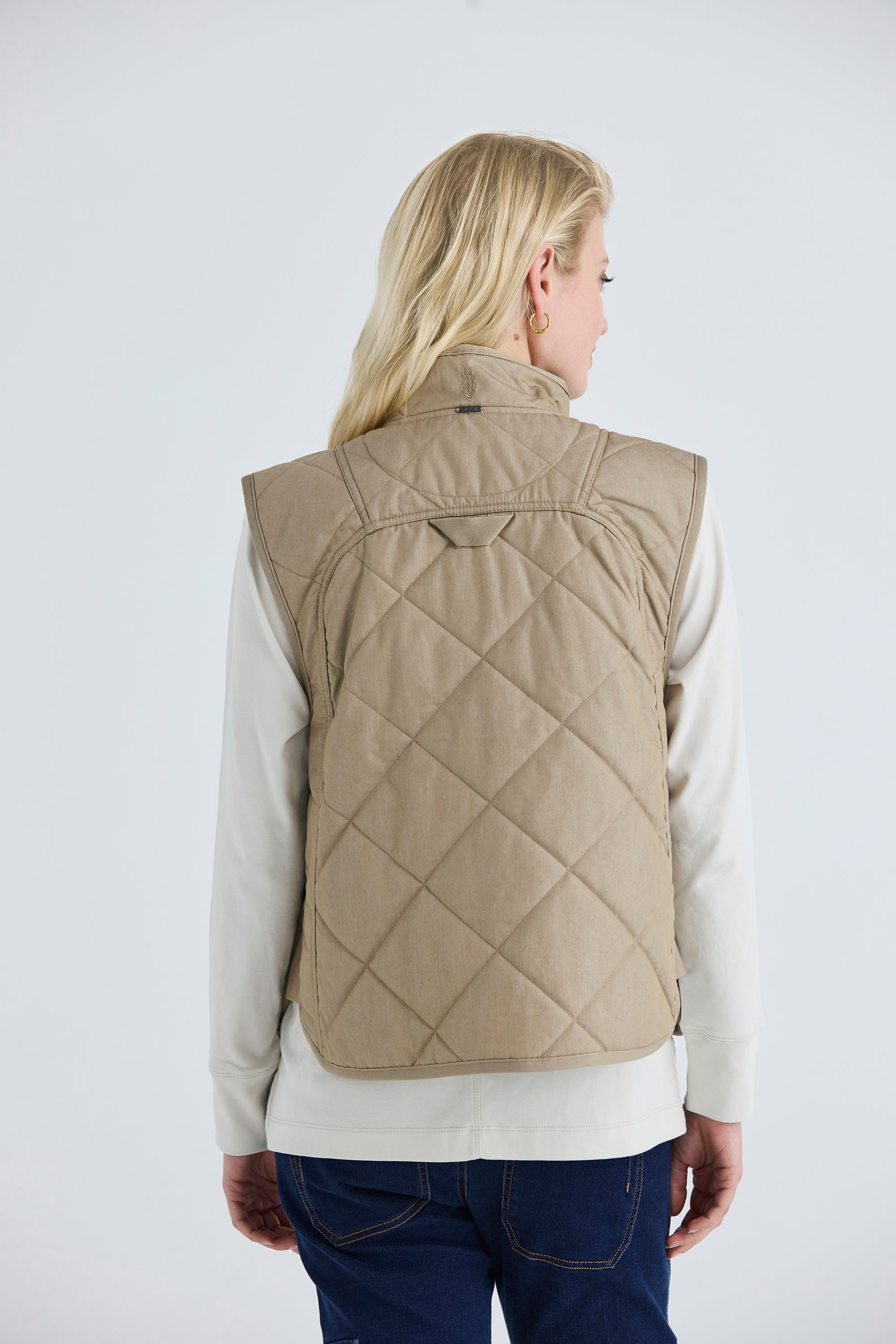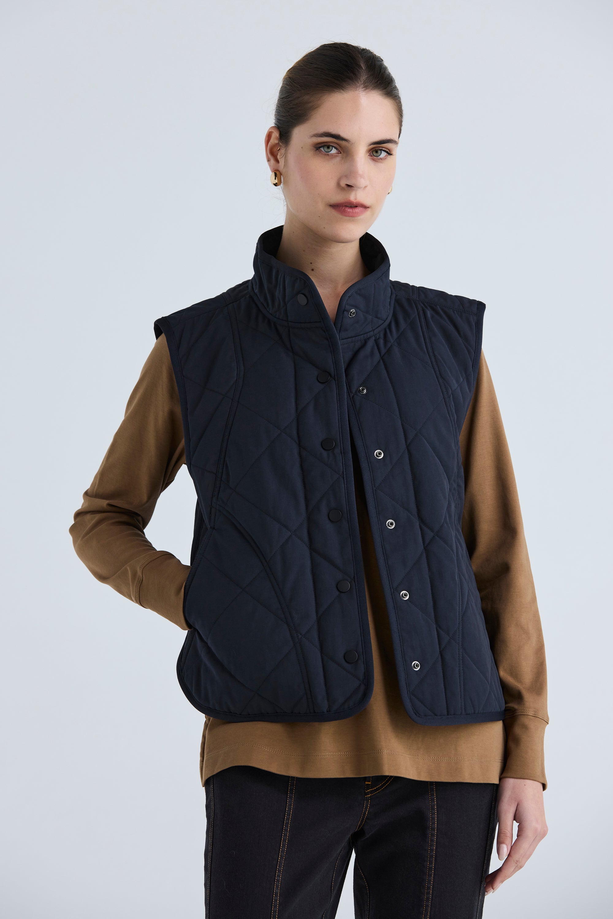 Stay on-trend with the Bolt Vest, a padded quilted vest designed for both style and comfort. It boasts a stand-neckline for a modern look. Featuring black powder-coated dome hardware and bound edge detail, this water-resistant vest exudes a sporty edge. The rounded hemline with godet side splits and the tab detail at the centre back complete the look.