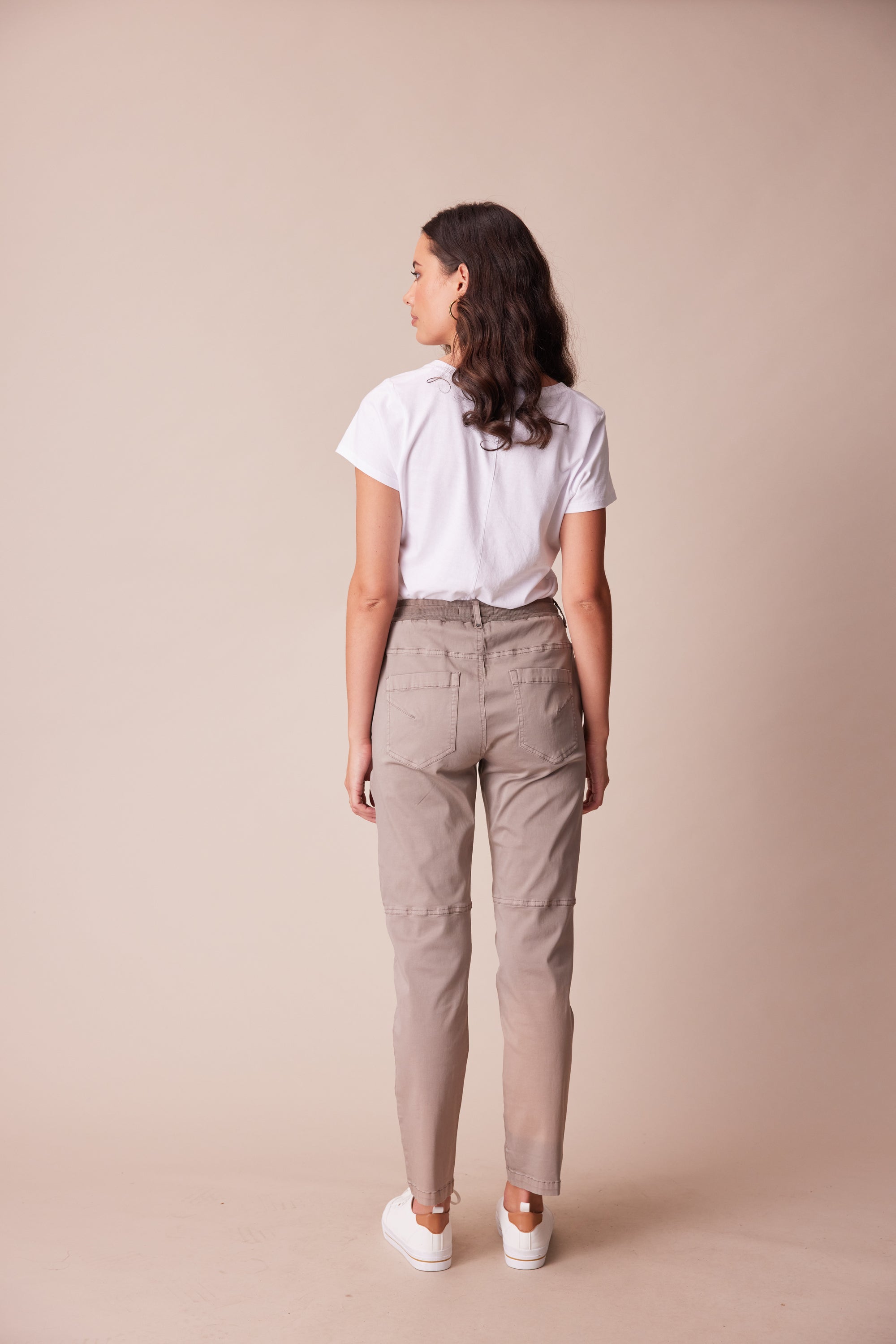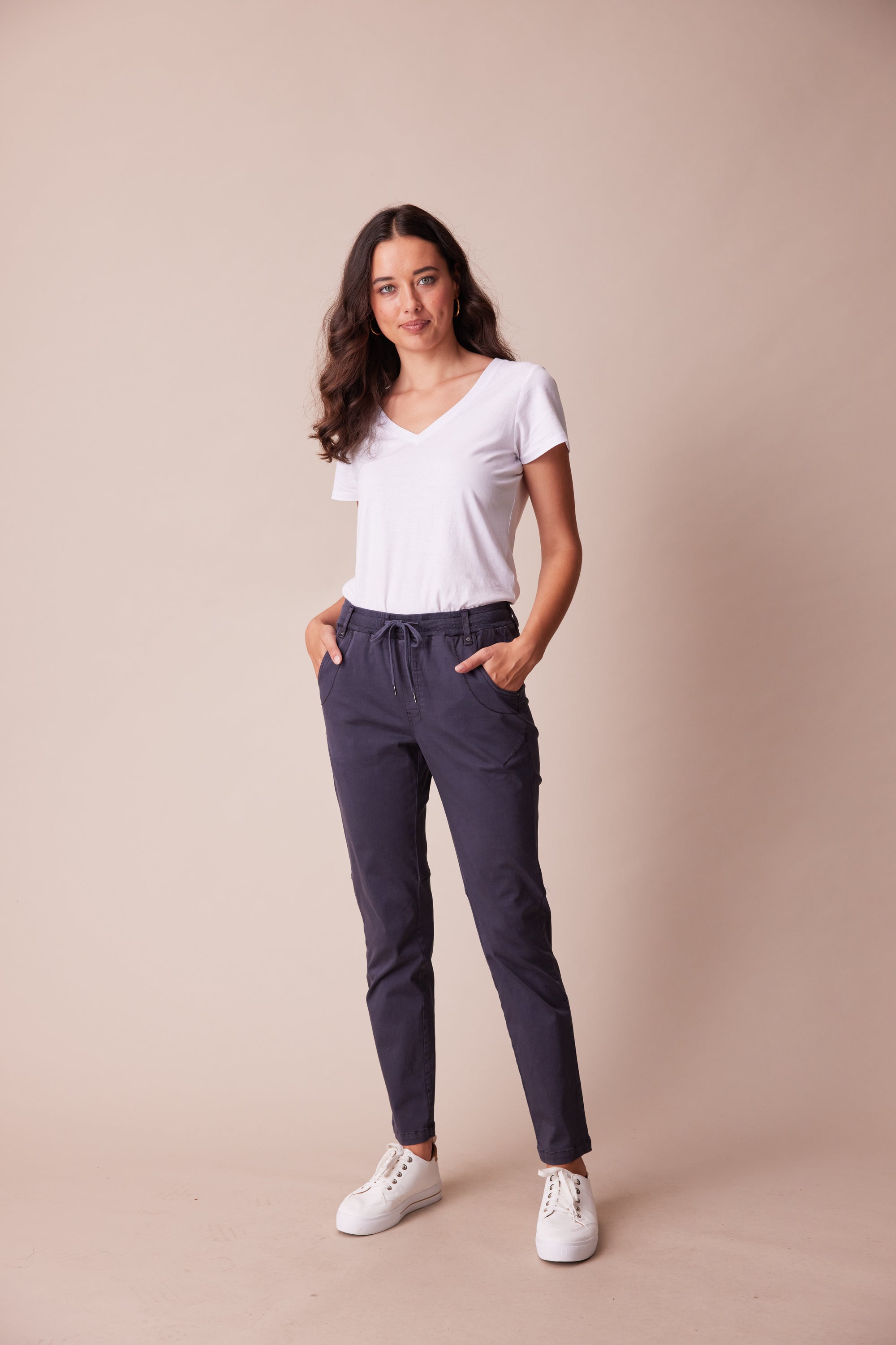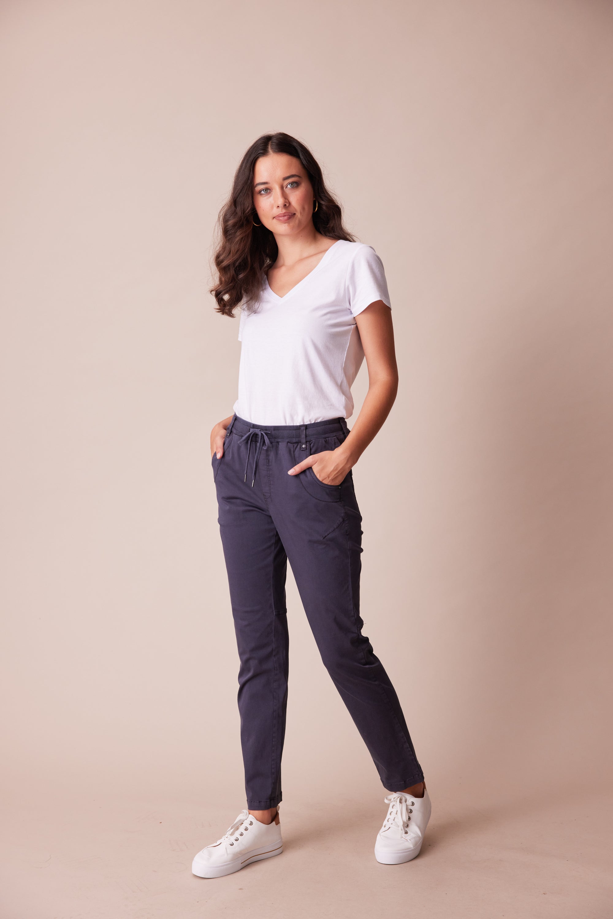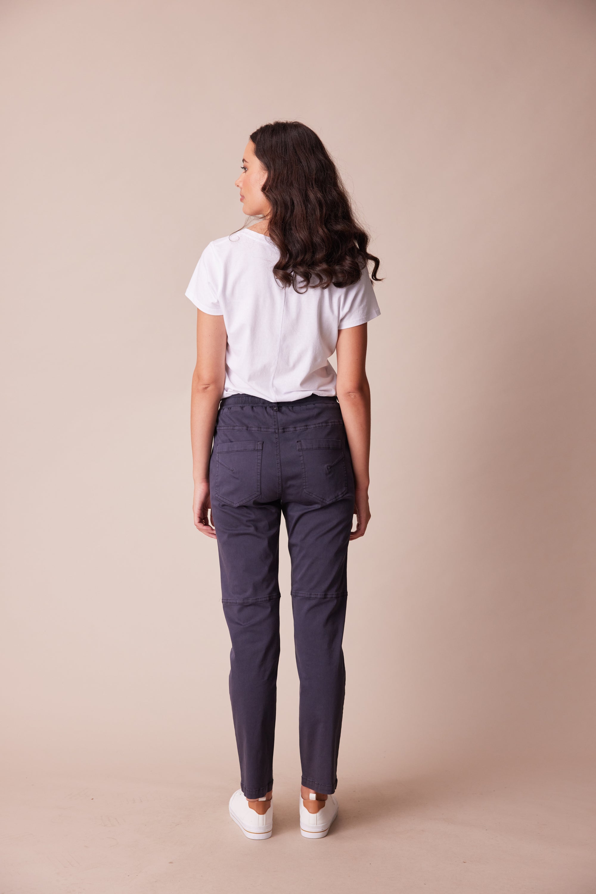 A casual pant with elasticated waist and adjustable drawstring tie. The distressed colour is achieved by special garment dye, making every pant unique.