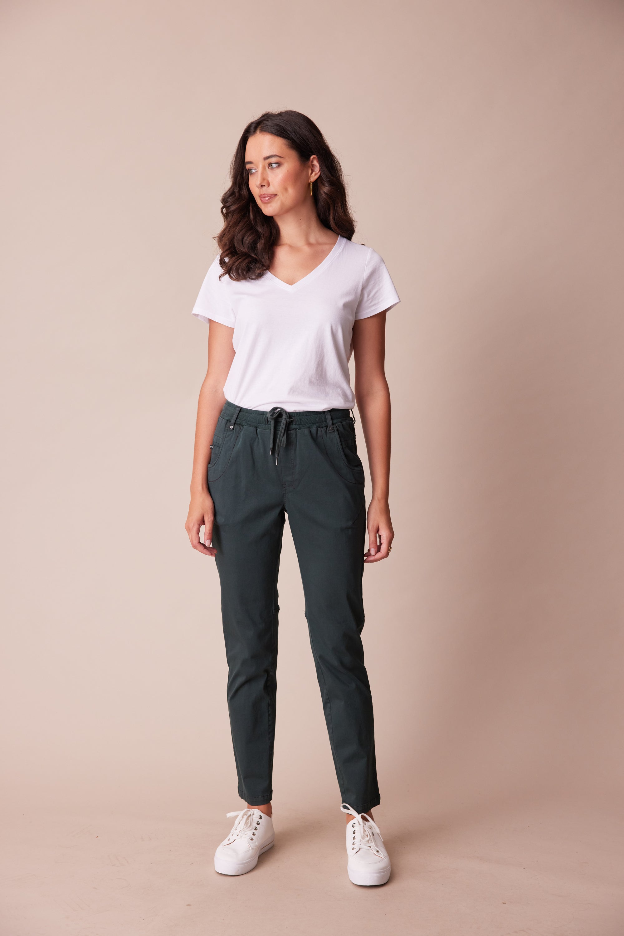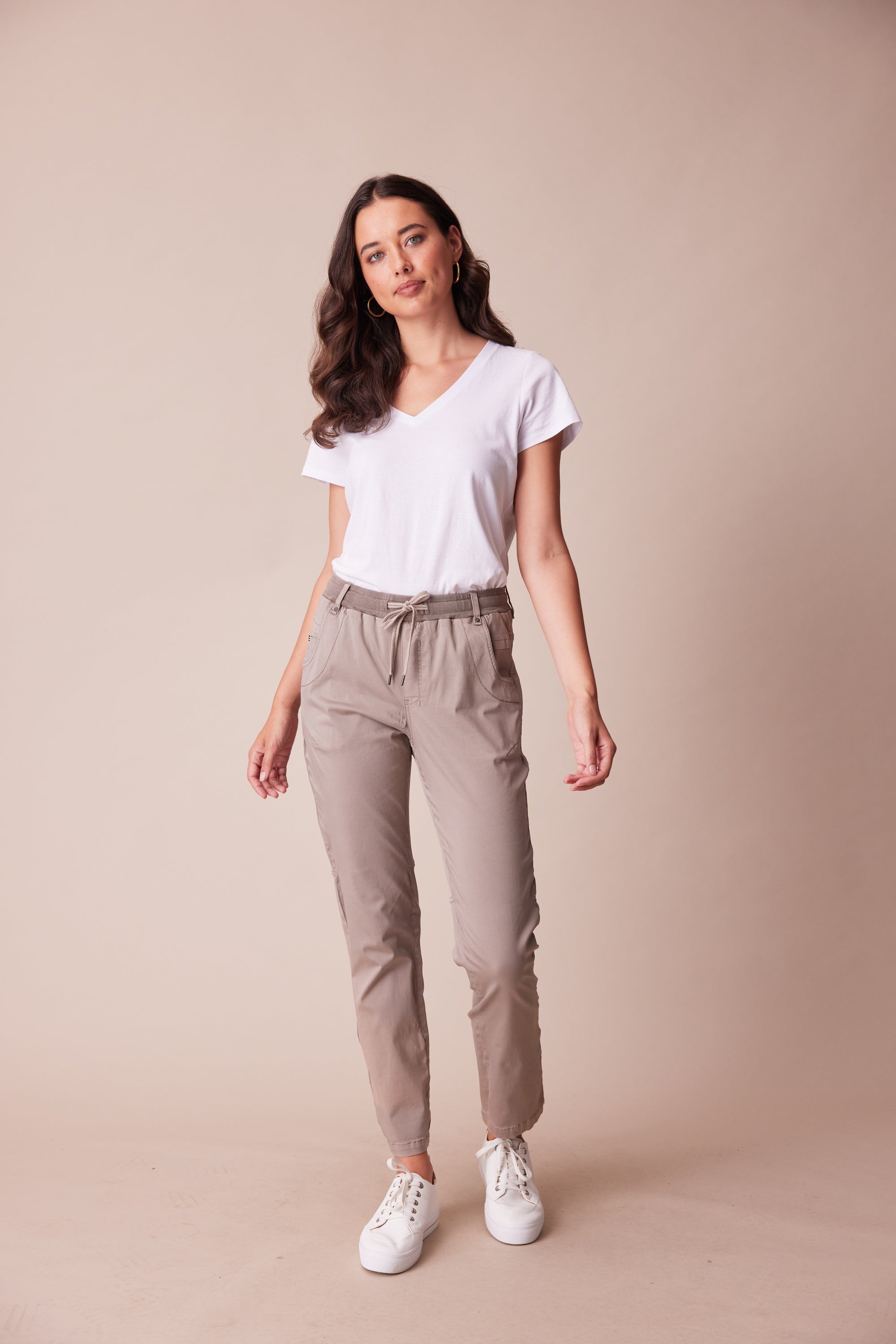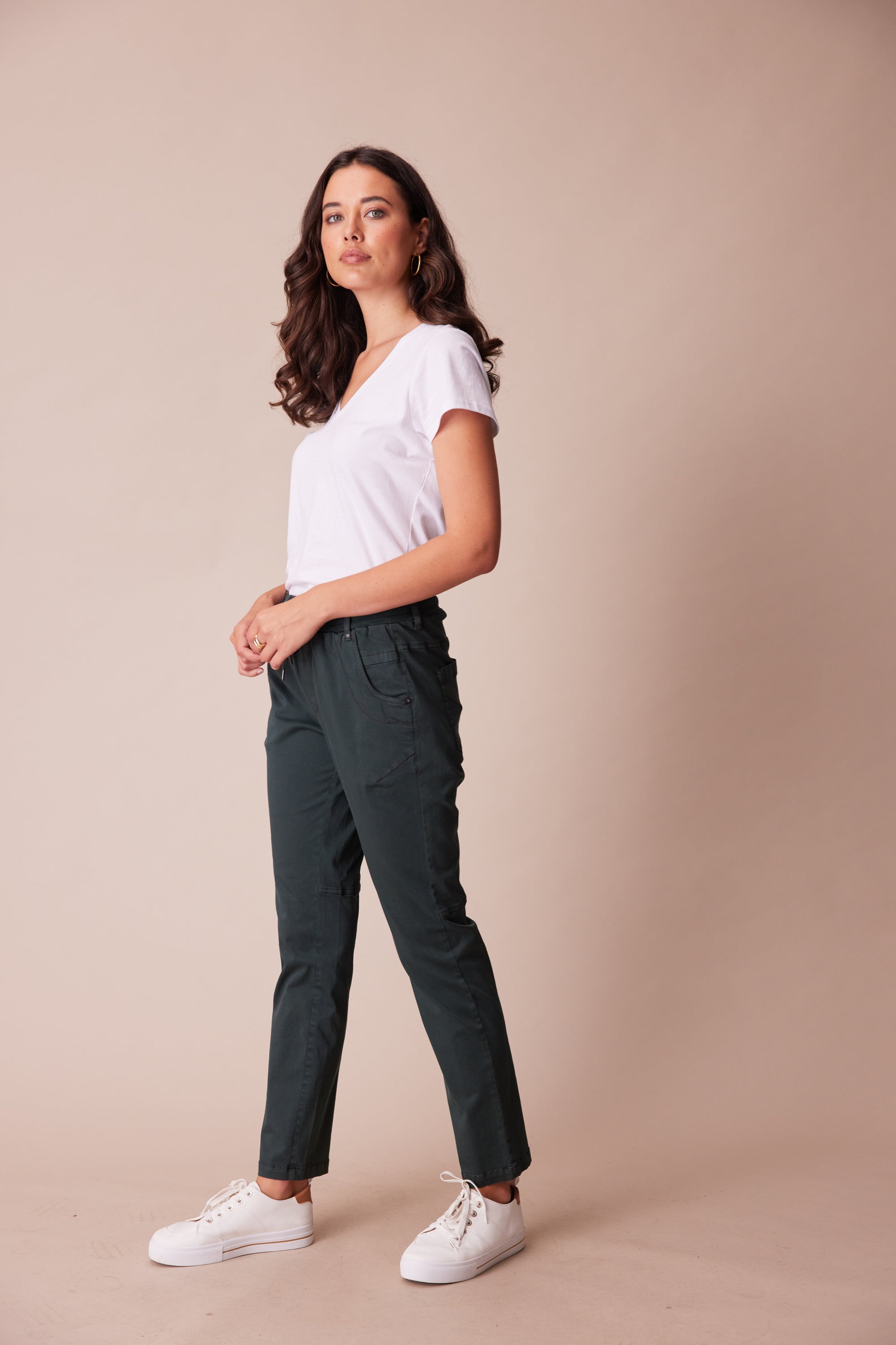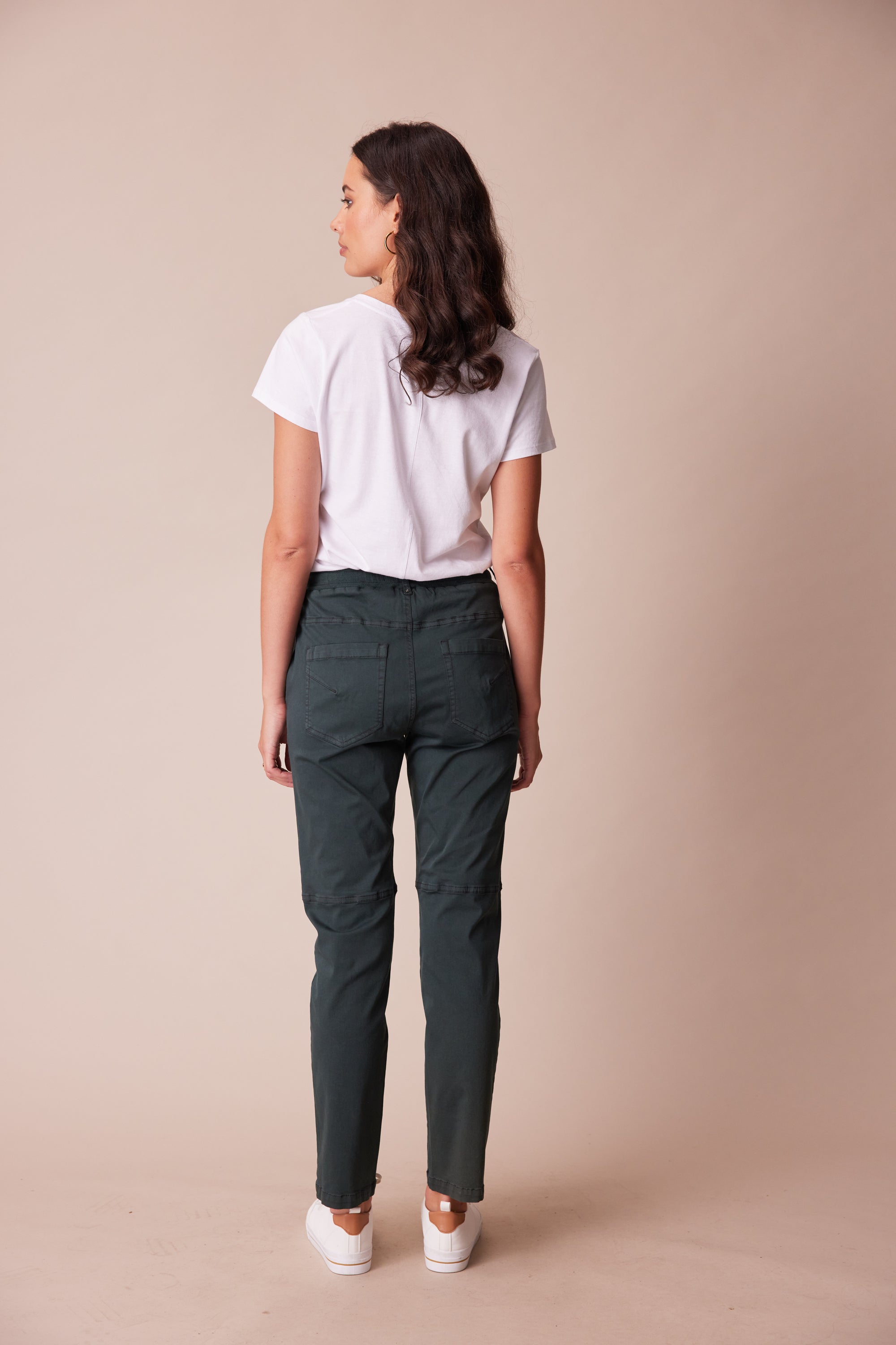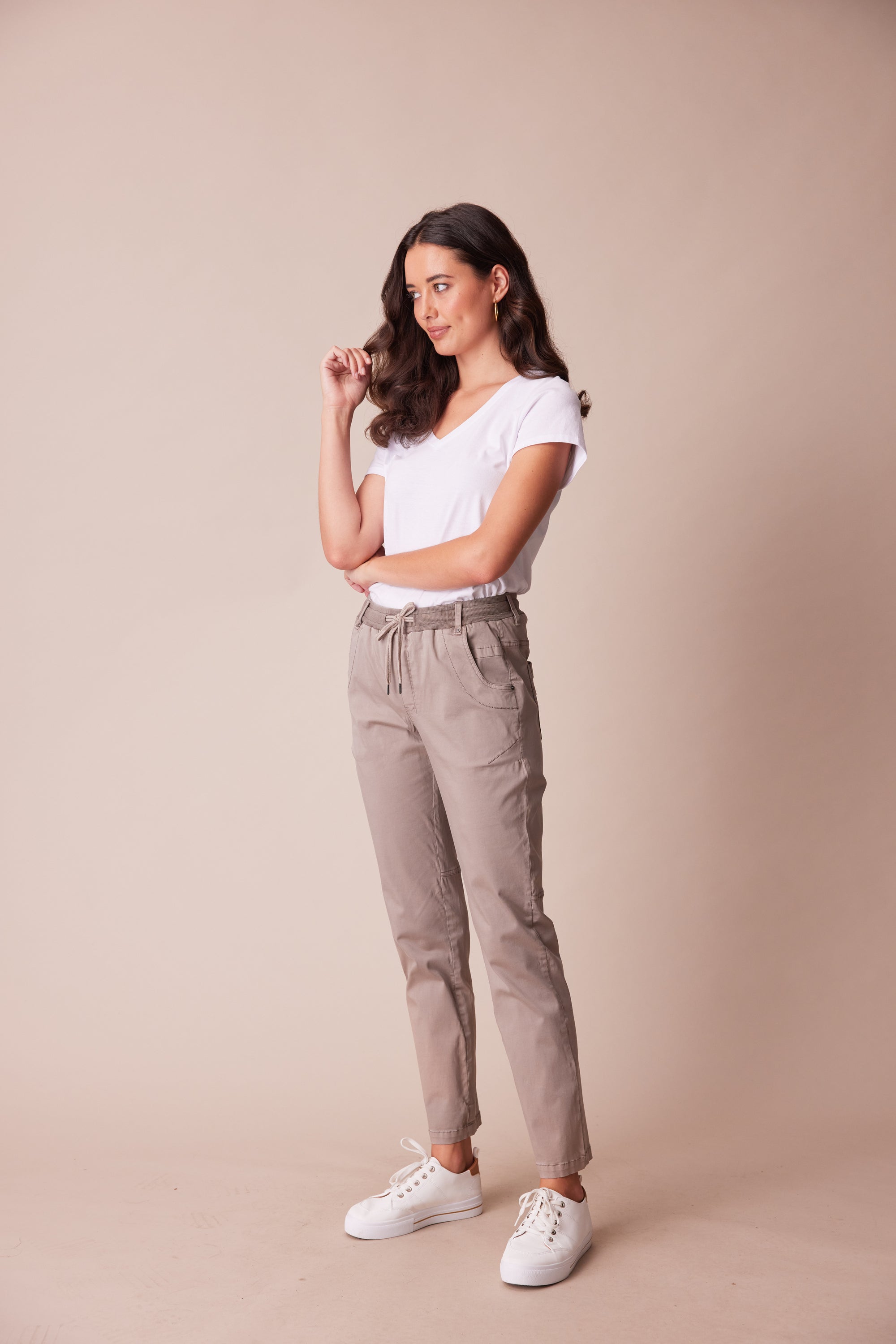A casual pant with elasticated waist and adjustable drawstring tie. The distressed colour is achieved by special garment dye, making every pant unique.