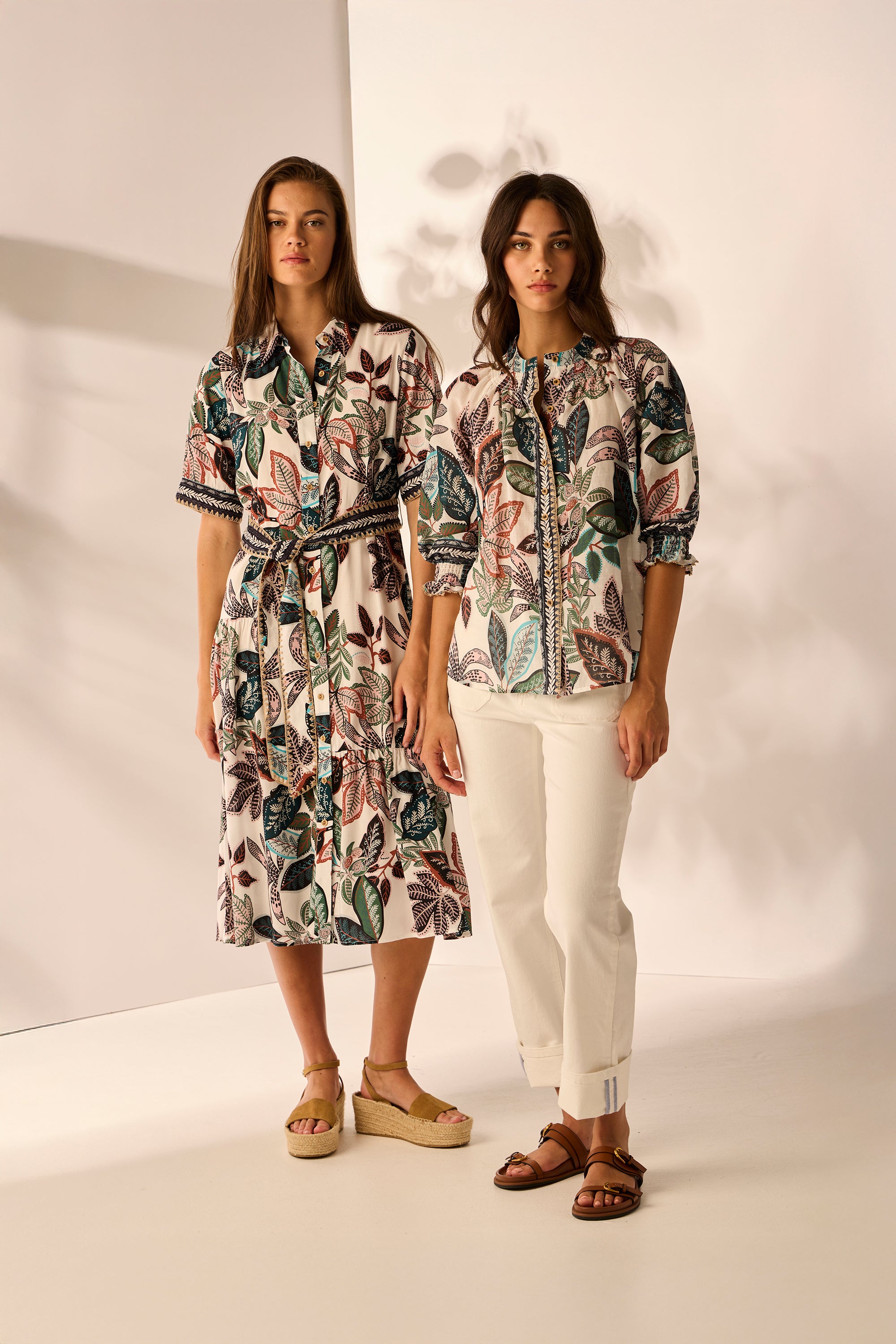The Carnaby Dress is a perfect balance of elegance and artisanal charm, featuring a mid-calf length silhouette with a flowing high-low gathered hem. Thoughtful details like blanket stitch embroidery on the belt and cuffs, a border print accent, and a centre-front placket with wooden buttons make this a standout piece for effortless styling.