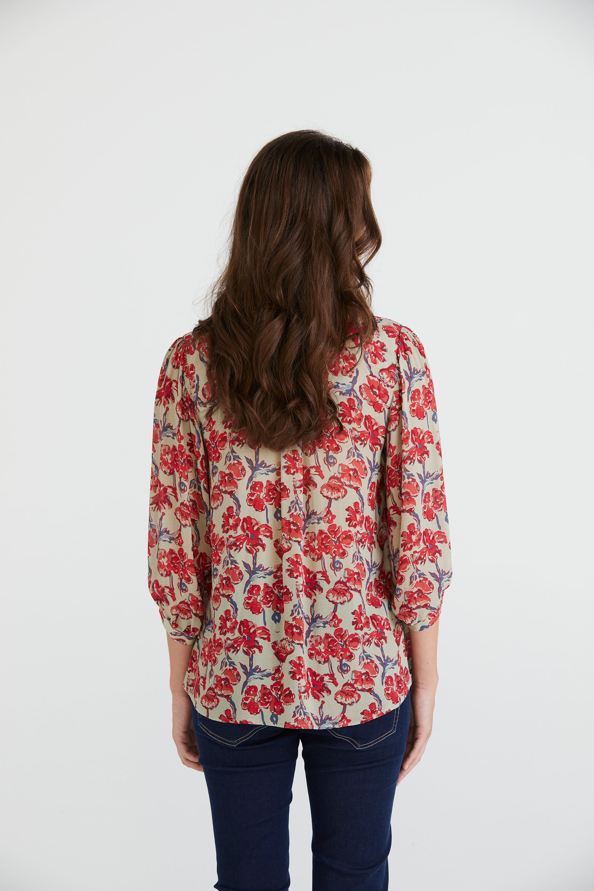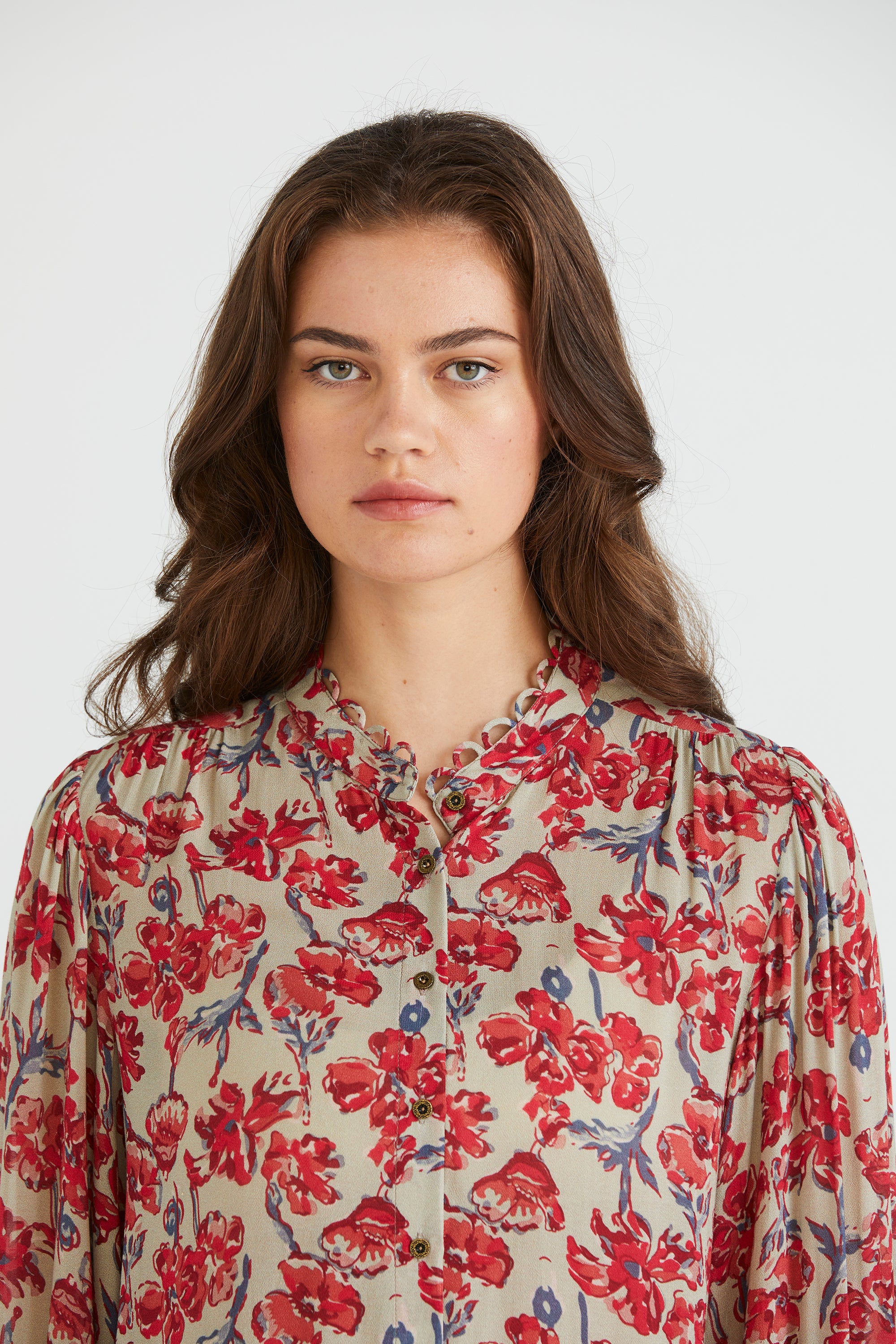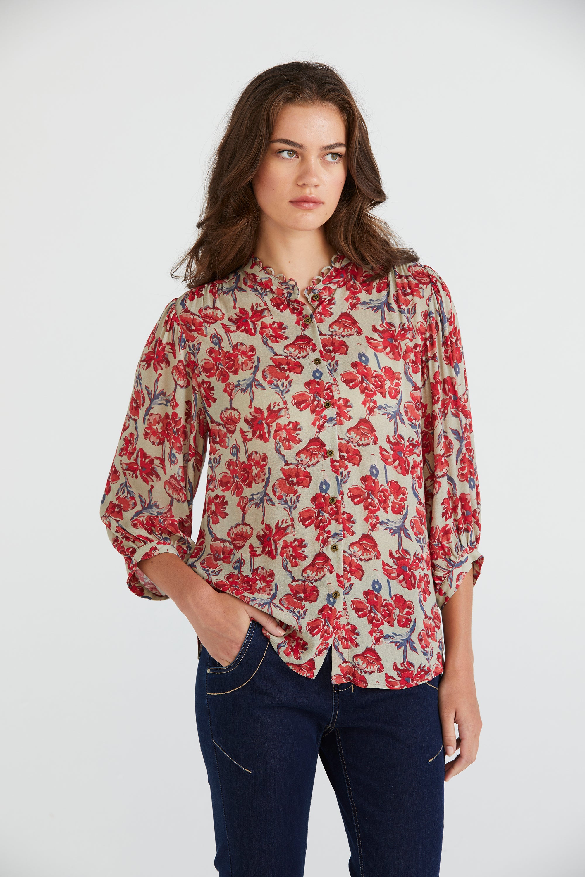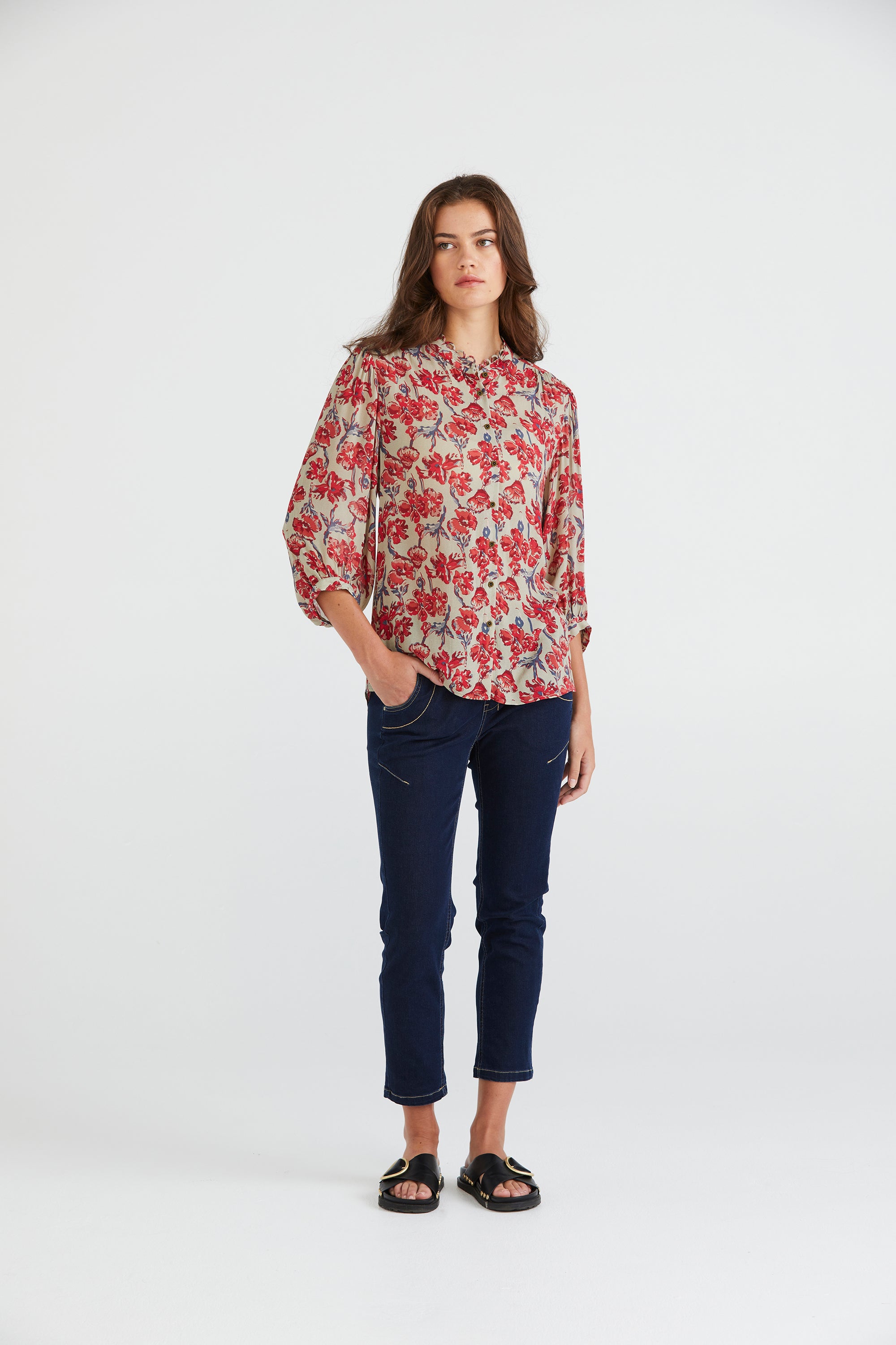 Embrace timeless elegance with the Casia Shirt, a button-through viscose rayon blend shirt adorned with the floral Casia print. Its elegant rouleau loop neckline design adds a sophisticated touch, and the engraved antique brass metal buttons provide a classic finish, making it a versatile piece for casual and dressy occasions.