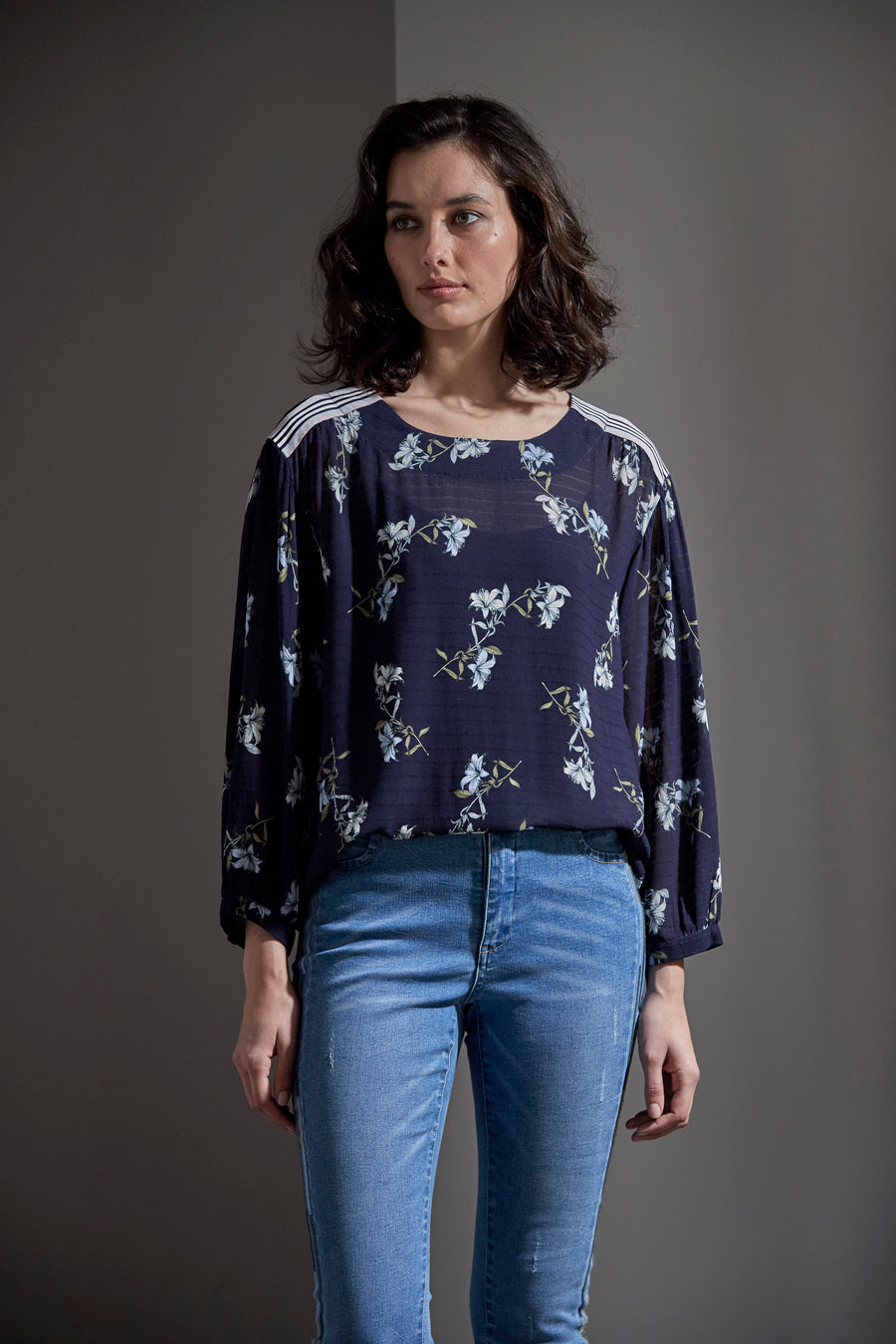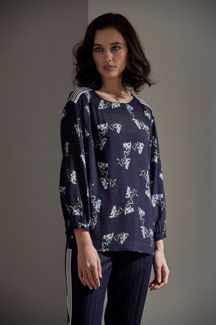 An easy throw on top in the pretty Cedar Lily print; elbow length sleeve; featuring novelty tape on shoulder.