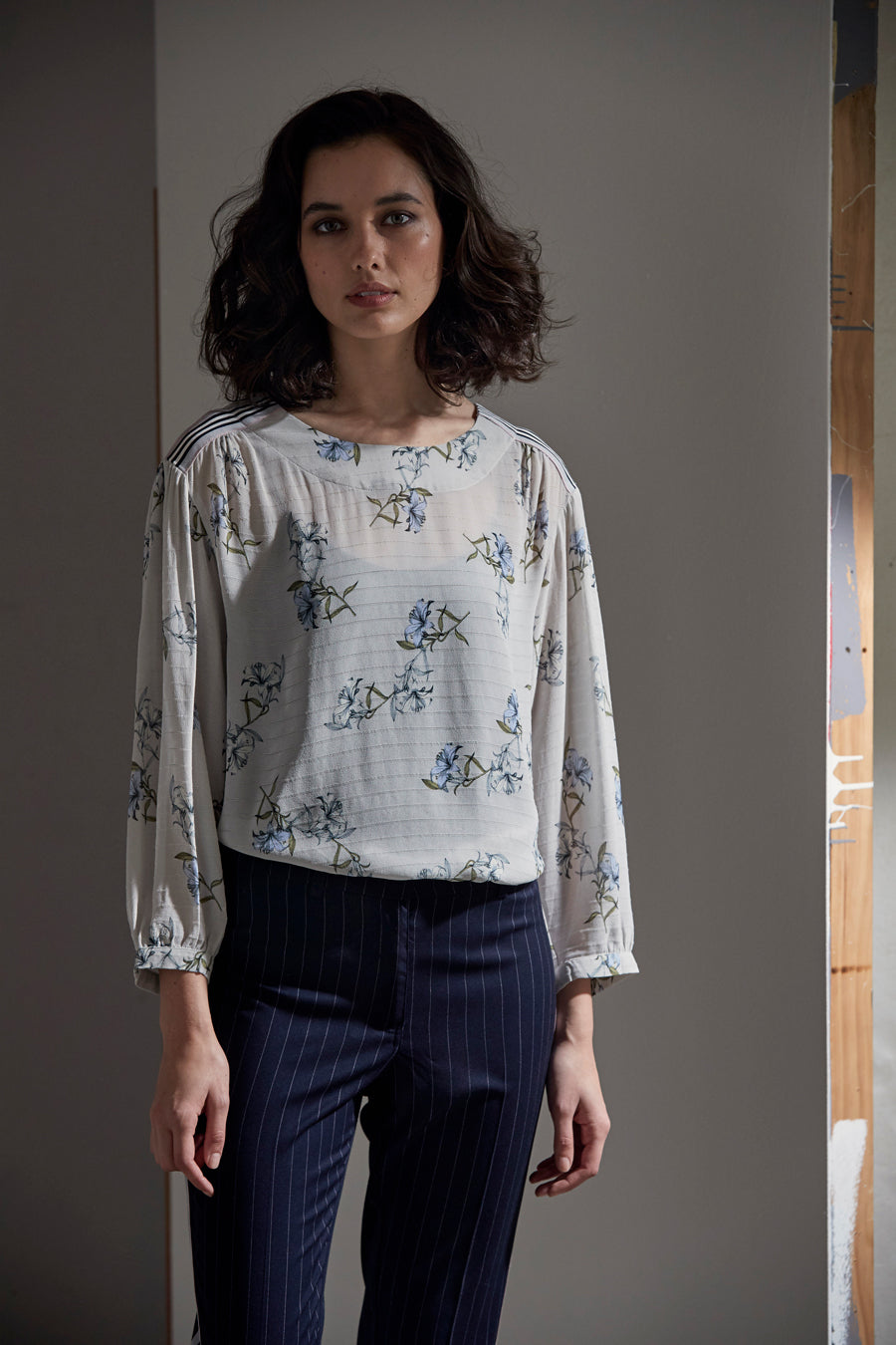 An easy throw on top in the pretty Cedar Lily print; elbow length sleeve; featuring novelty tape on shoulder.