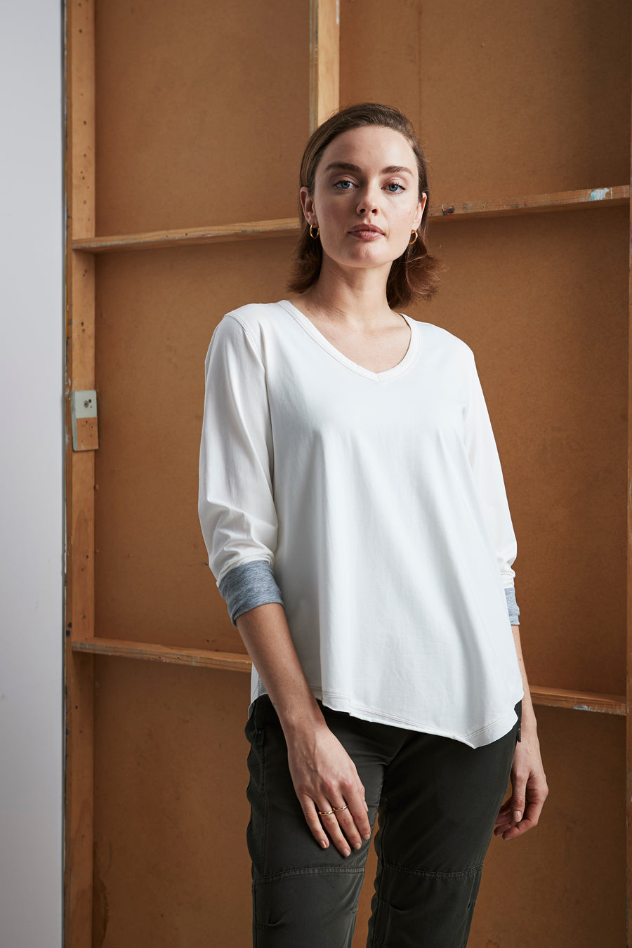 An easy fit tee, V-neckline, 7/8 sleeves with a turned-up contrast cuff. Featuring a unique asymmetrical raw edge hemline.