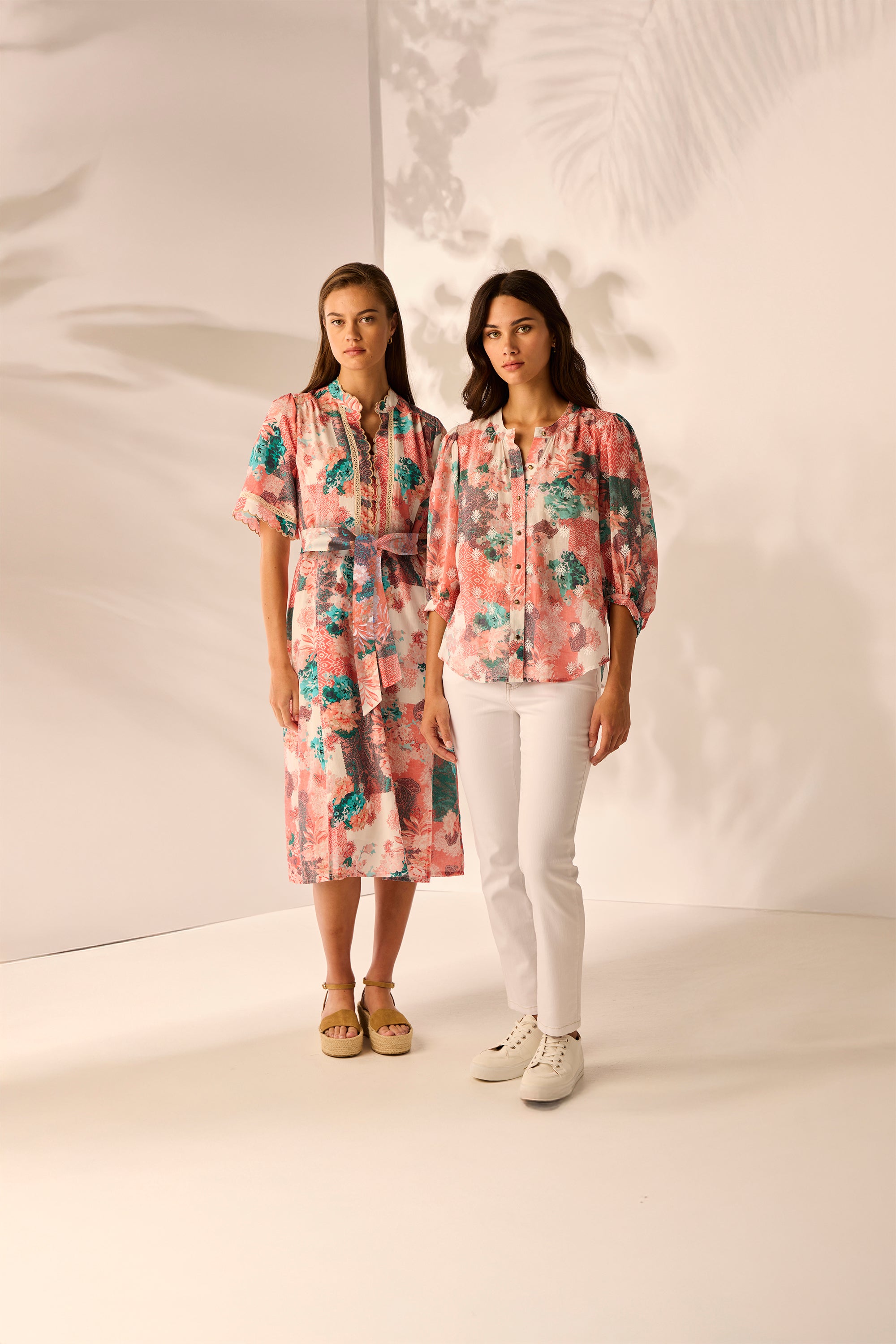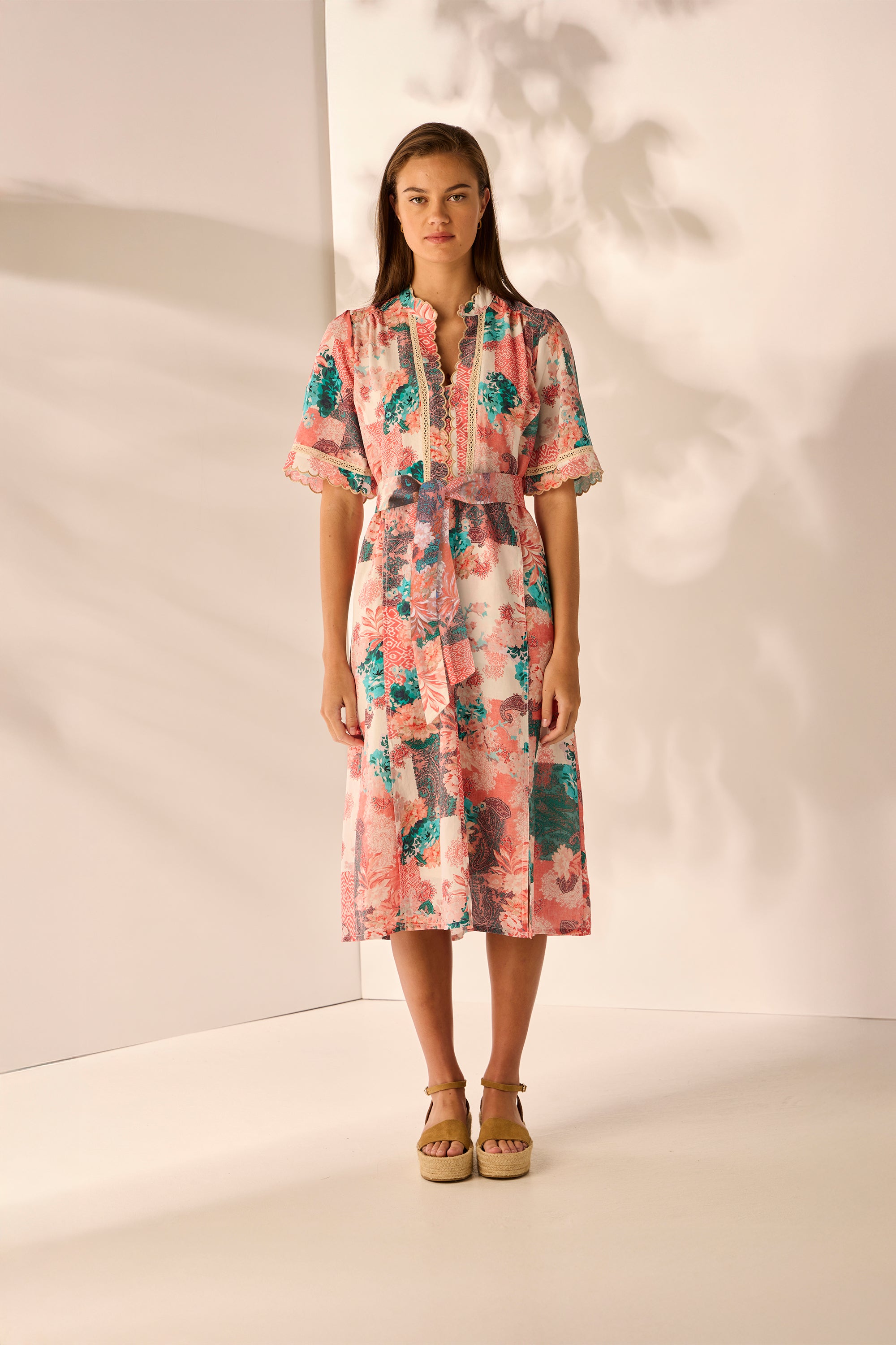 The Chantelle Dress is an elevated style featuring a delicate lace trim inserted into the centre front panel and cuff, with the scallop embroidery around the neckline, centre front opening and cuff. An flattering a-line silhouette with buckled tie at the waist and hidden pockets.