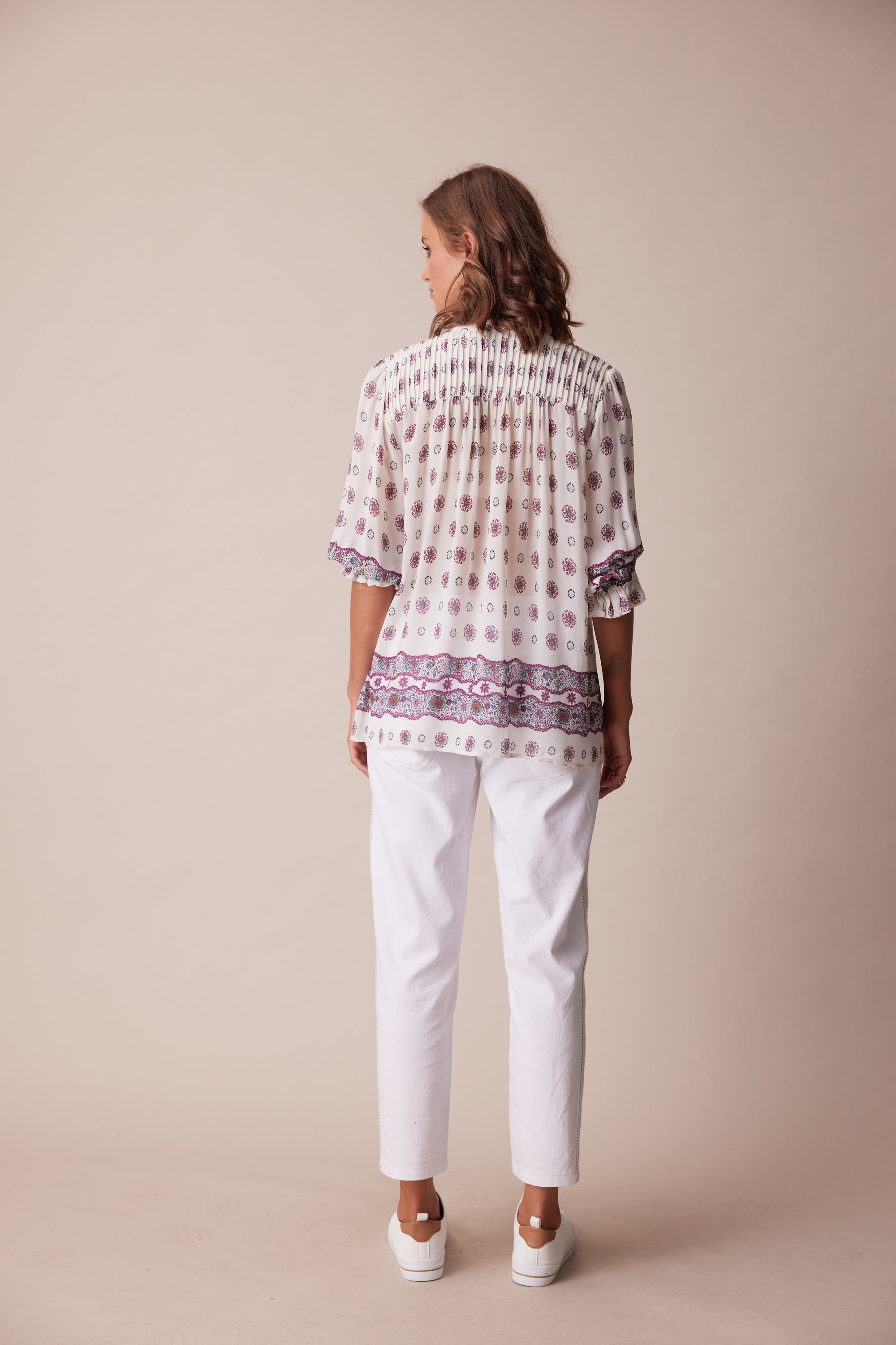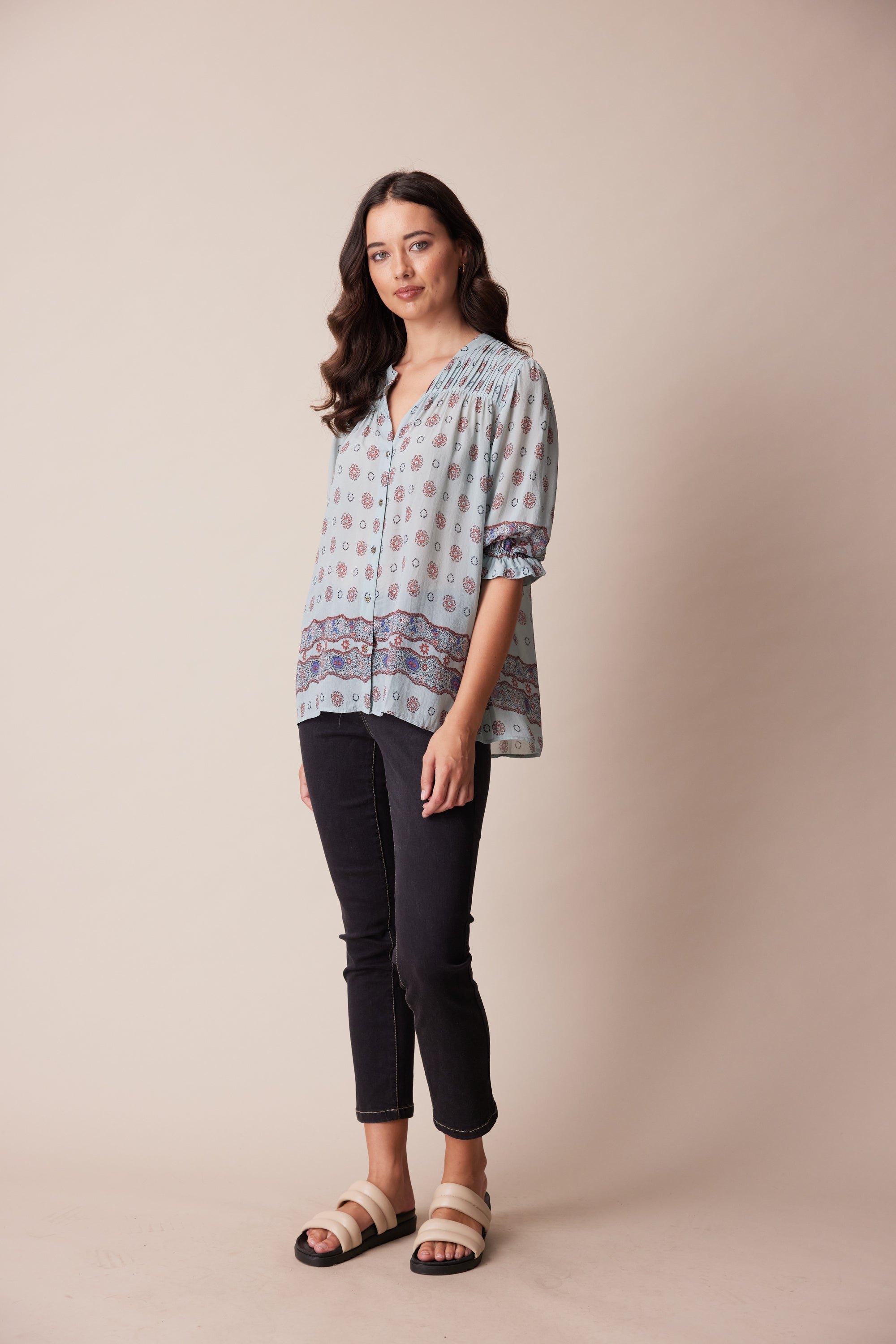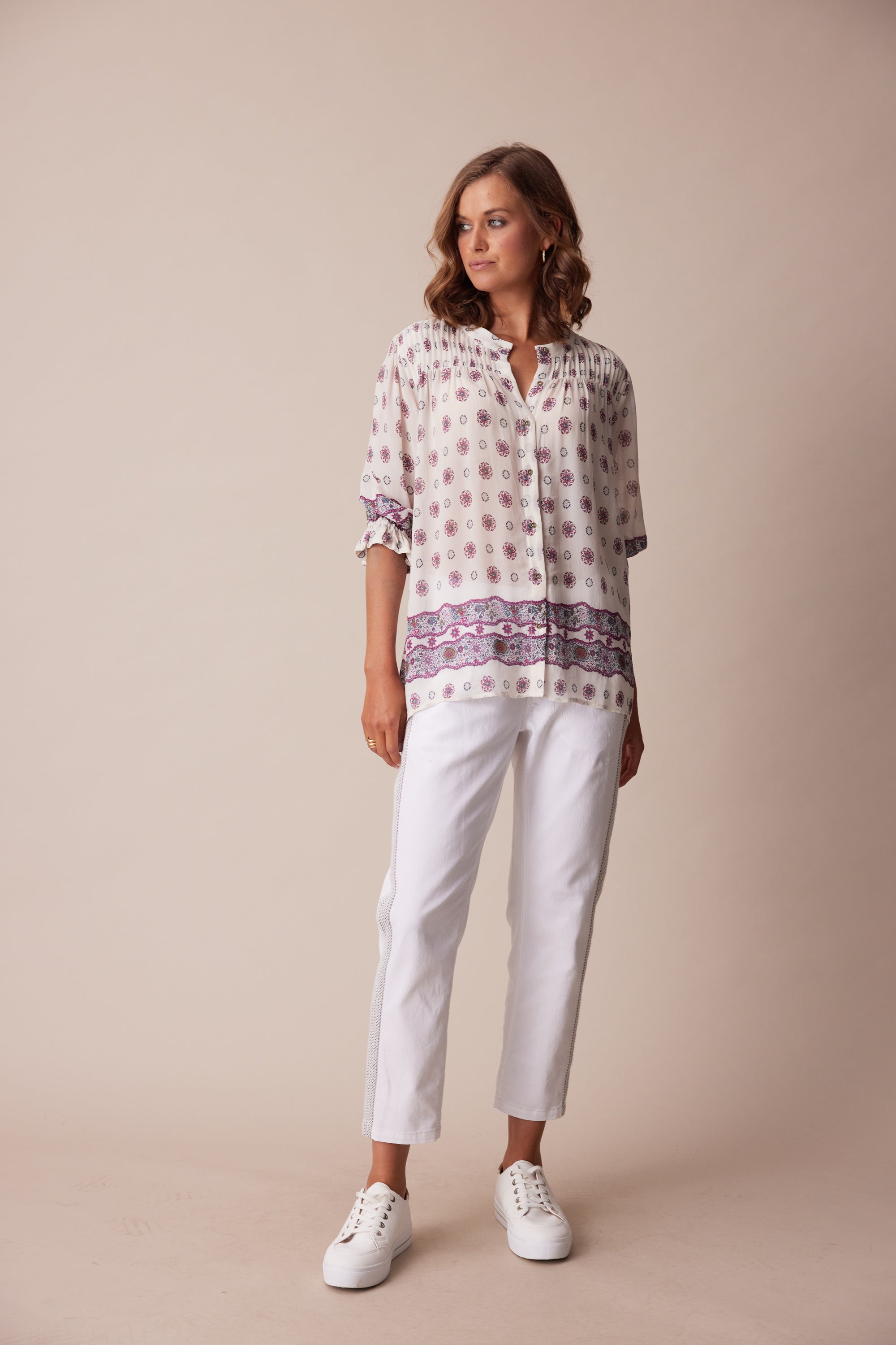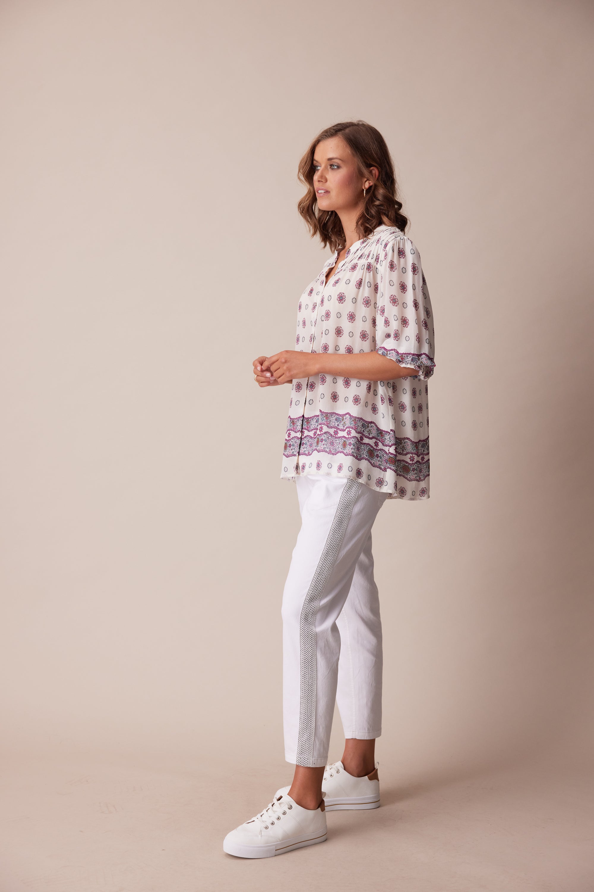 Add a playful elegance to your daytime look with this short sleeve button front shirt cut in lightweight georgette. Soft gathering through the bodice creates an A-line silhouette. Design details include pintucks at the front & back yokes, border print hem & cuffs and intricately engraved metal buttons.