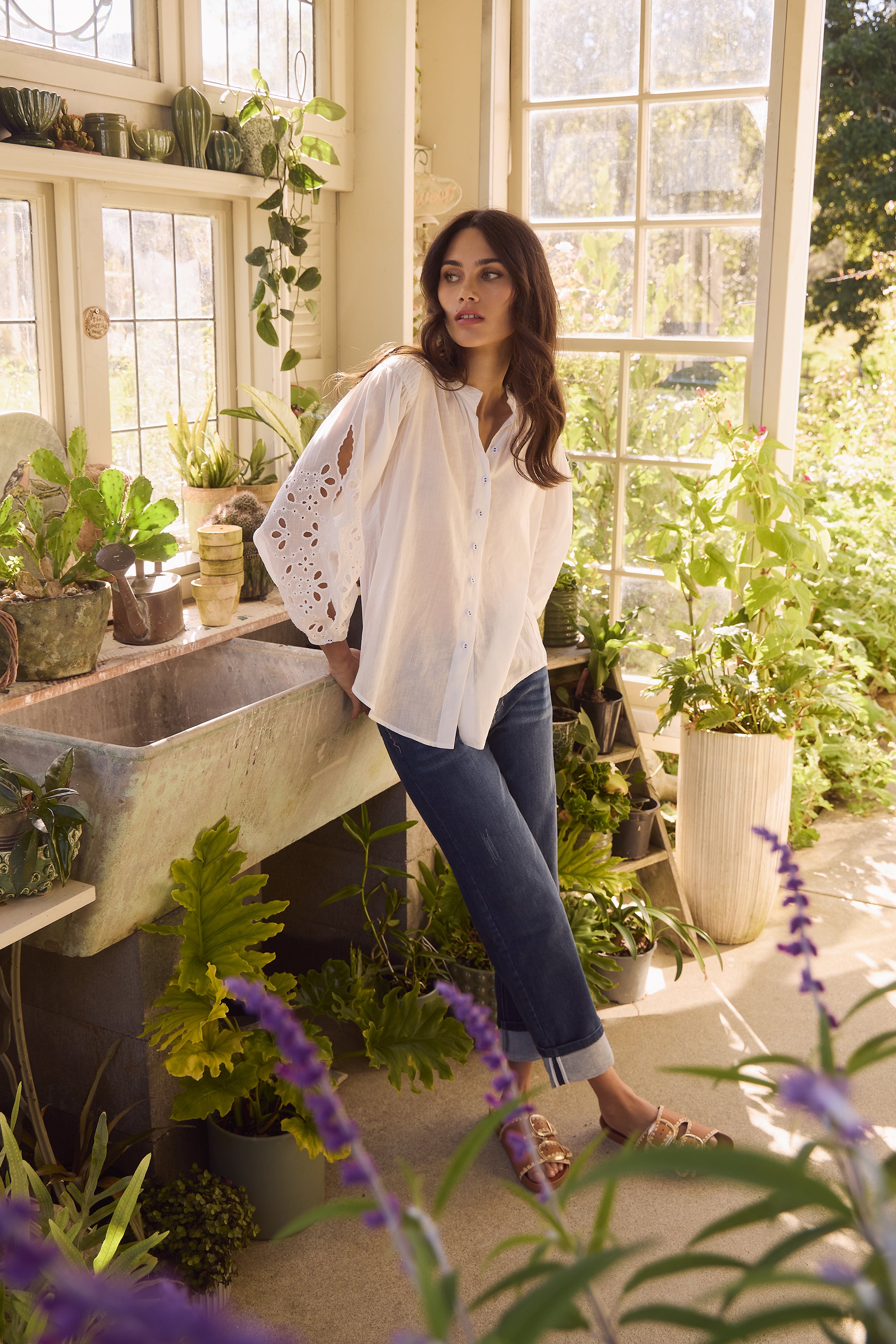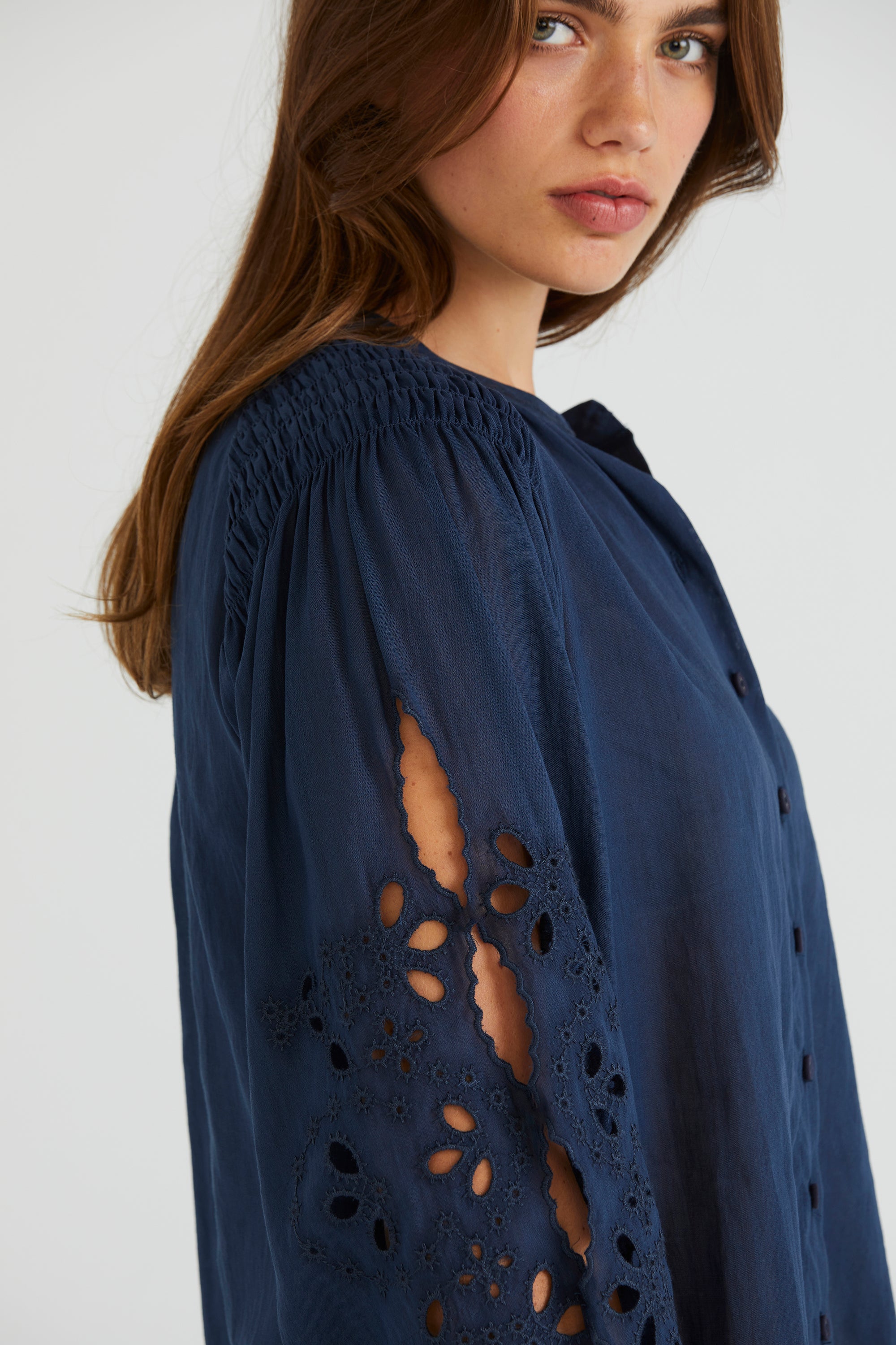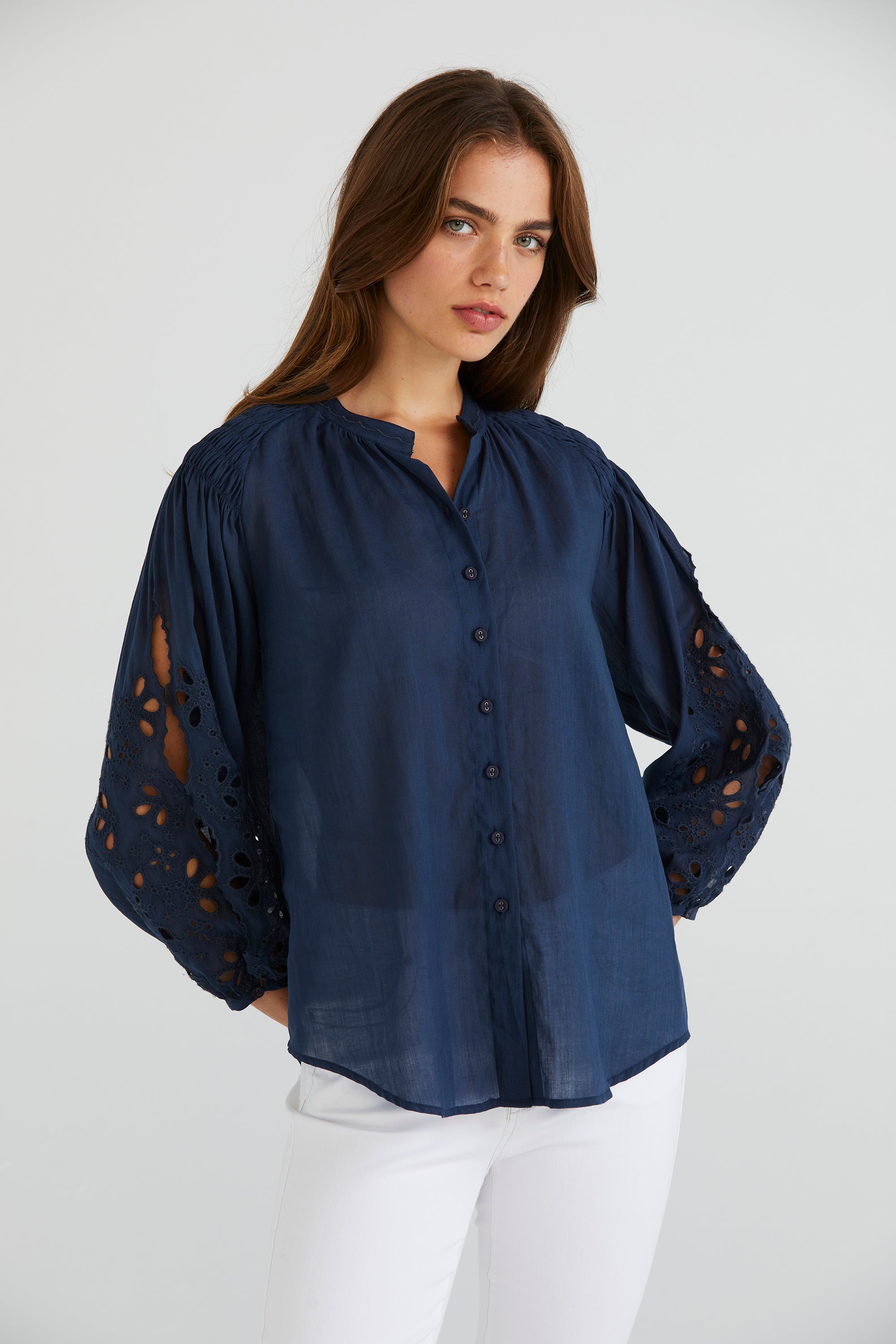 Step into timeless elegance with the Claudia Shirt, a stunning button-through shirt designed to captivate. Made from a premium ramie cotton blend, its shirred overarm detail adds a touch of texture, while the cut-out embroidery design sleeves offer intricate detailing. This shirt is perfect for making a style statement with ease.