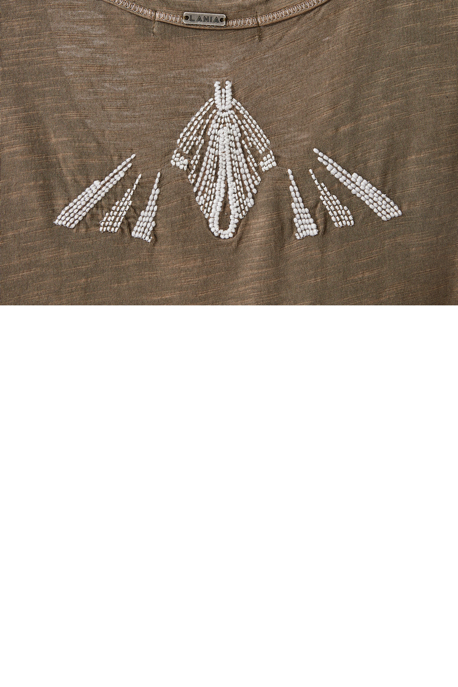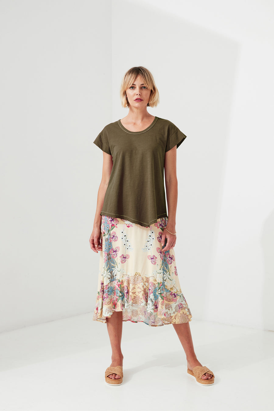 Soft handle 100% slub cotton, easy wear, featuring asymmetrical raw edge hemline and embroidered detail at back. Slightly distressed finish is achieved by special garment wash.