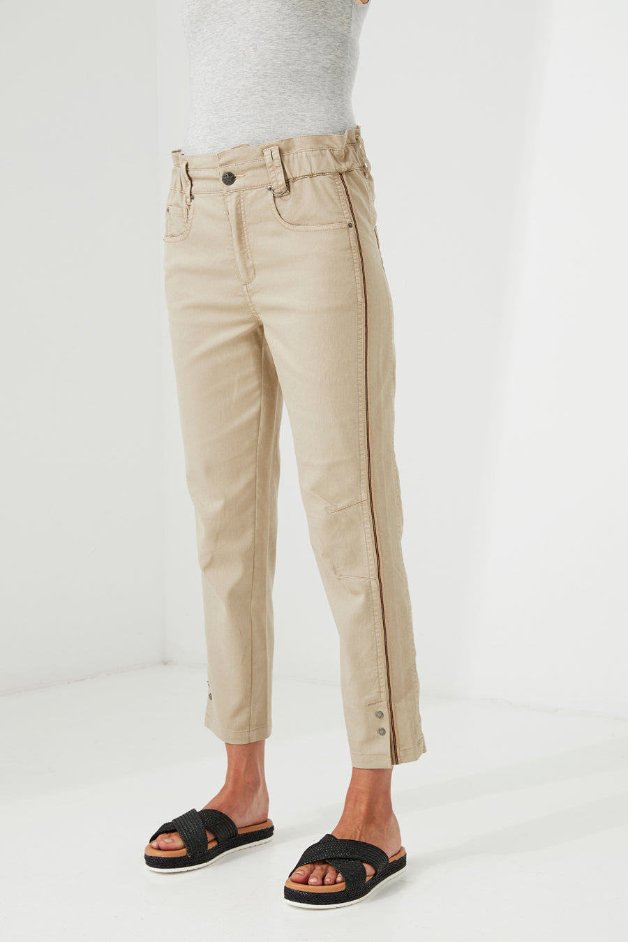 Cruze into summer with comfort, easy fit 7/8 length, featuring soft stretch lightweight cotton blend, with our comfort stretch waistband and signature snaps at hem.