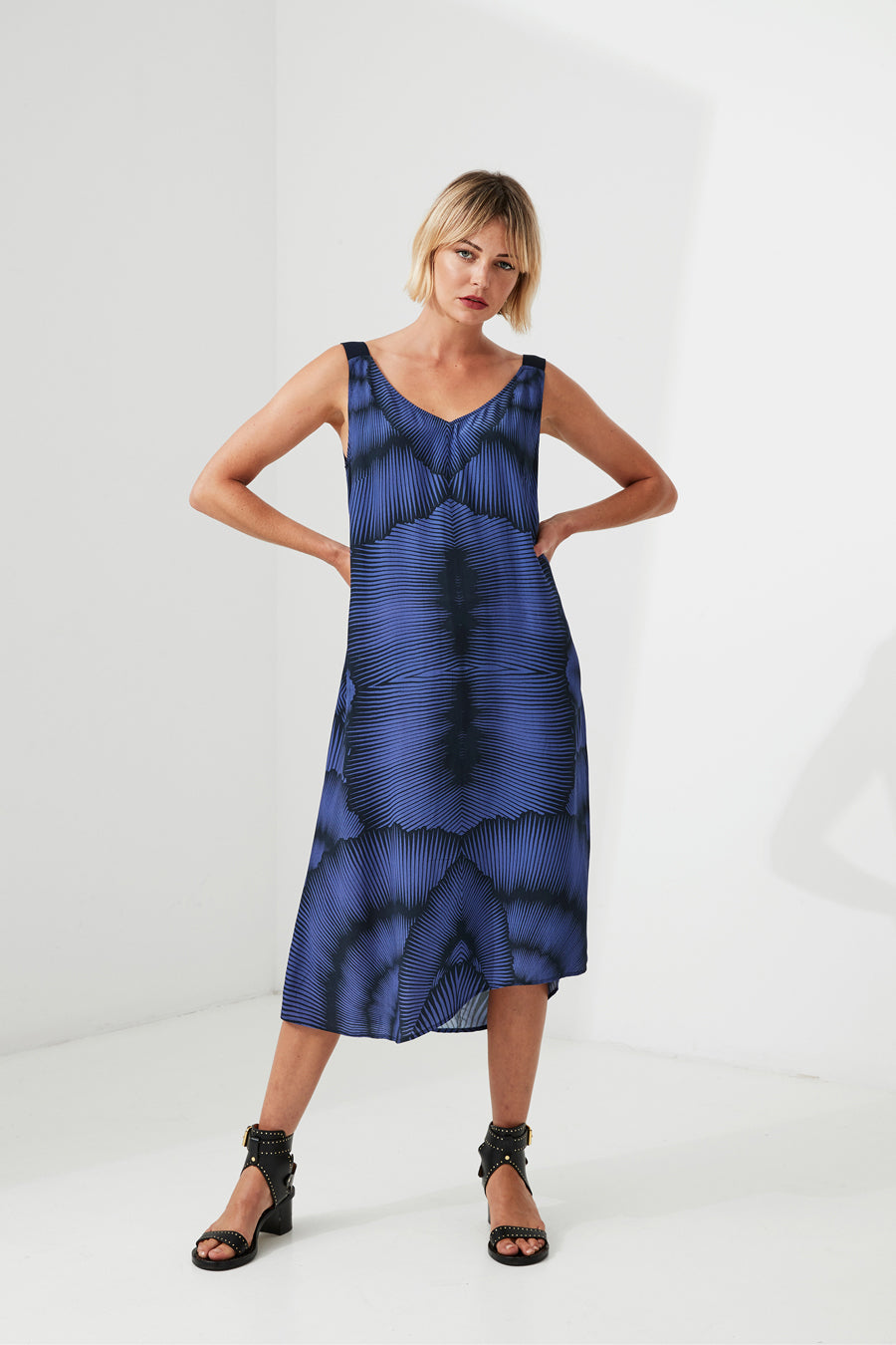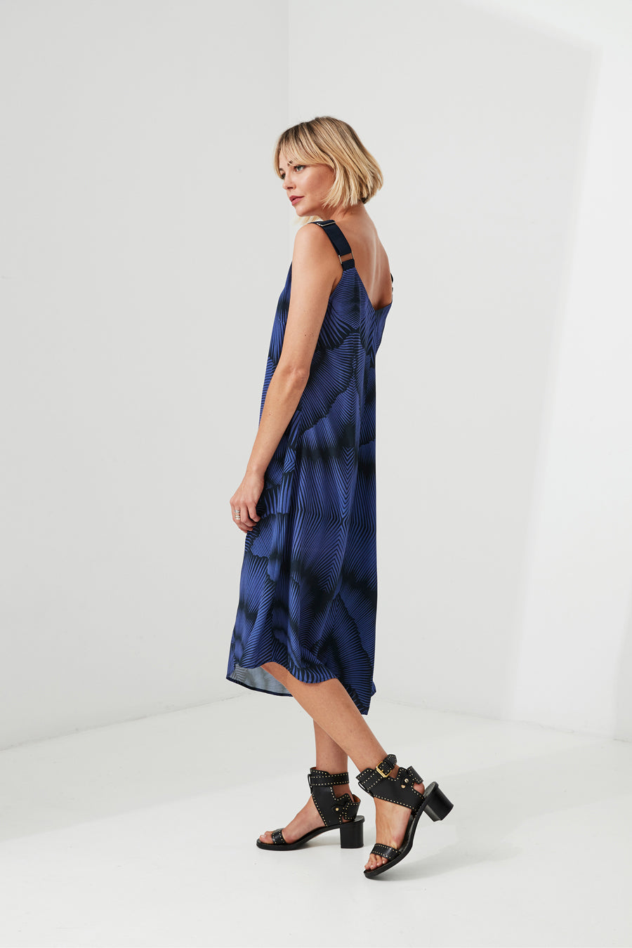 Dash print, simple styling with adjustable straps, length to mid-calf with hi-lo hemline, perfect for a summers day.