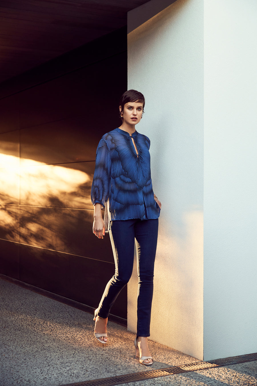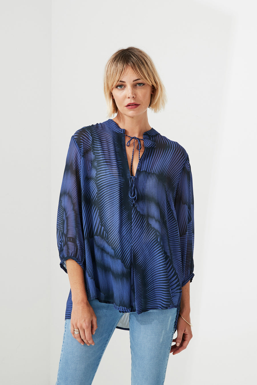 Our Dash sheer shirt, easy transition from day to night, gathers to create a feminine silhouette, with rouleau ties.