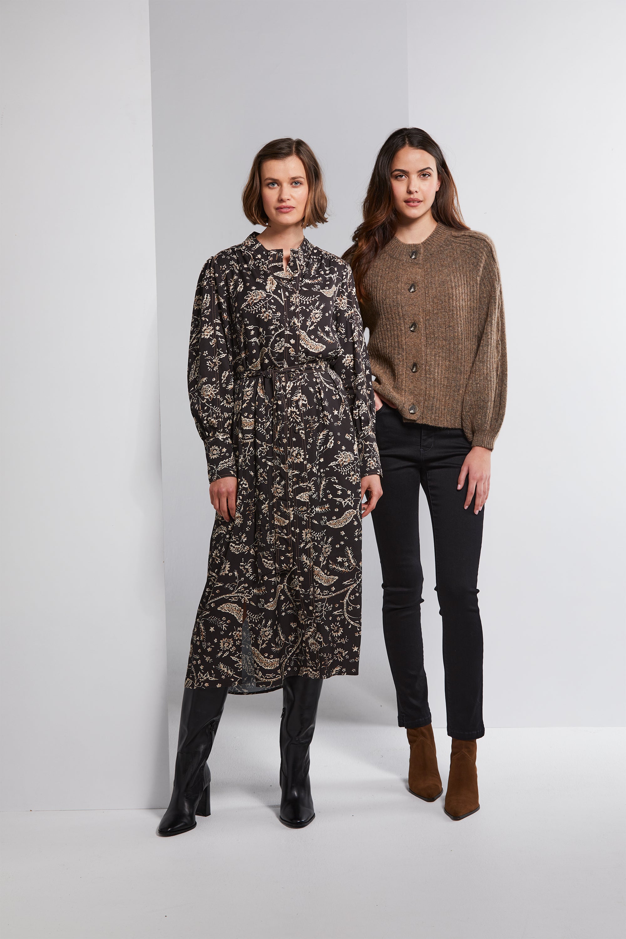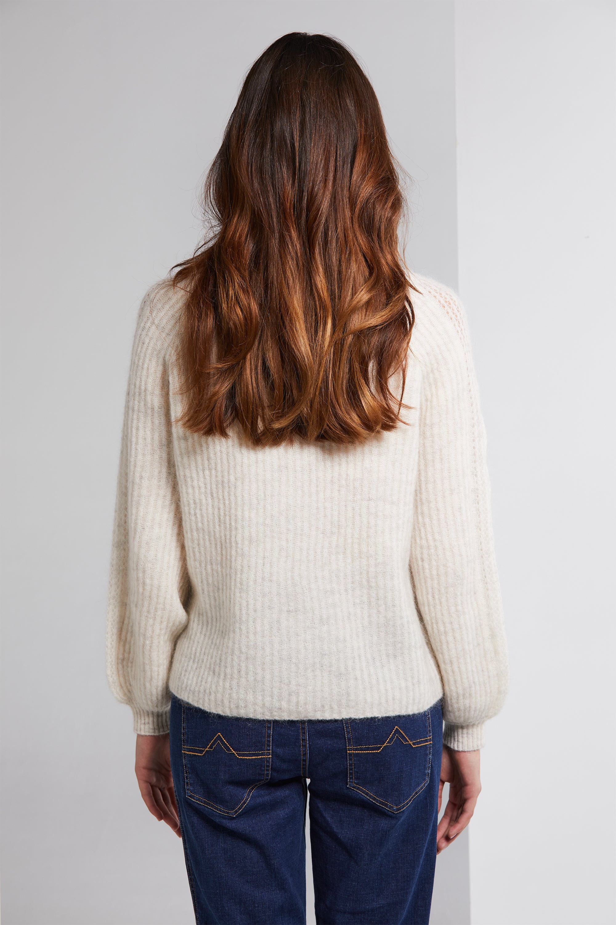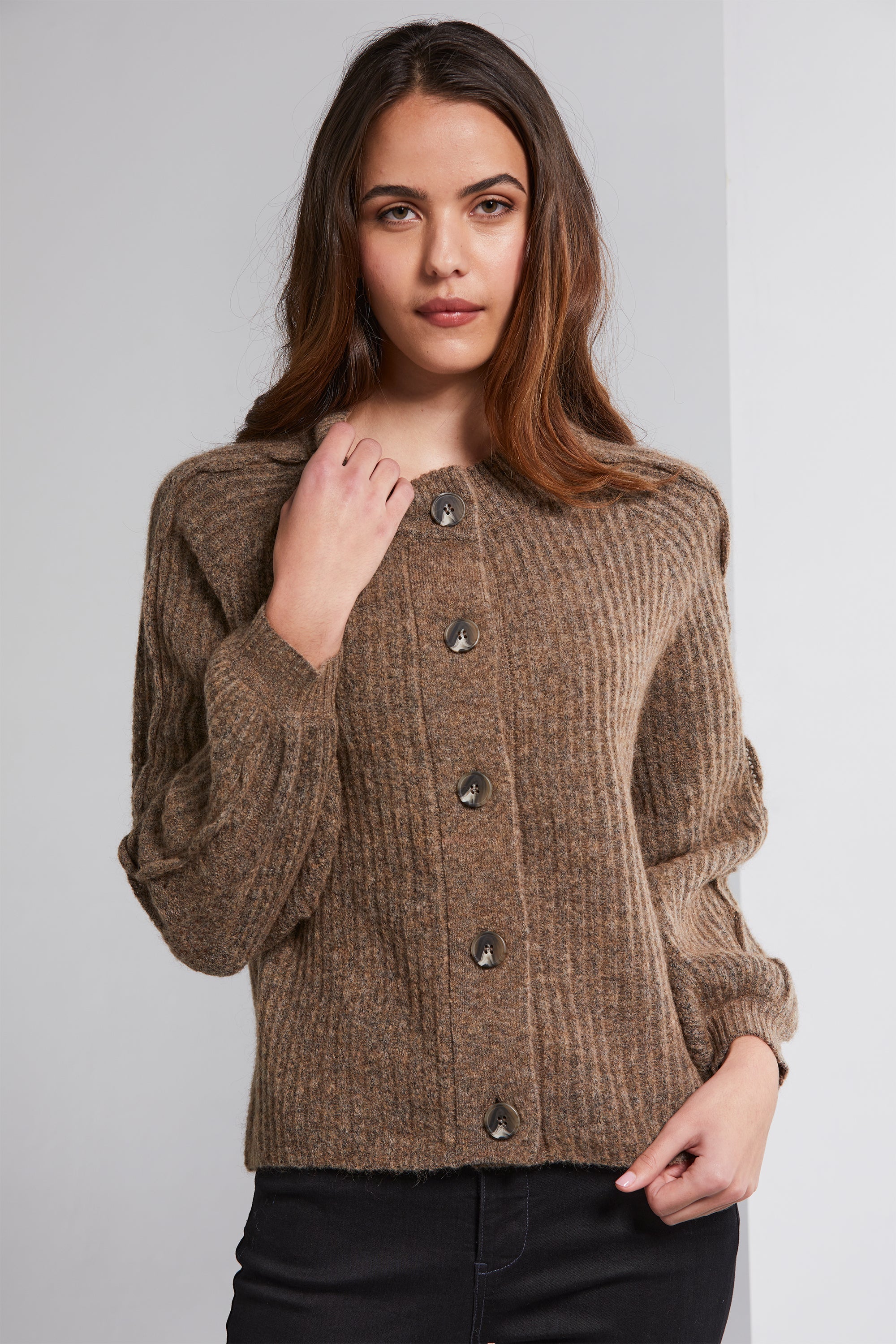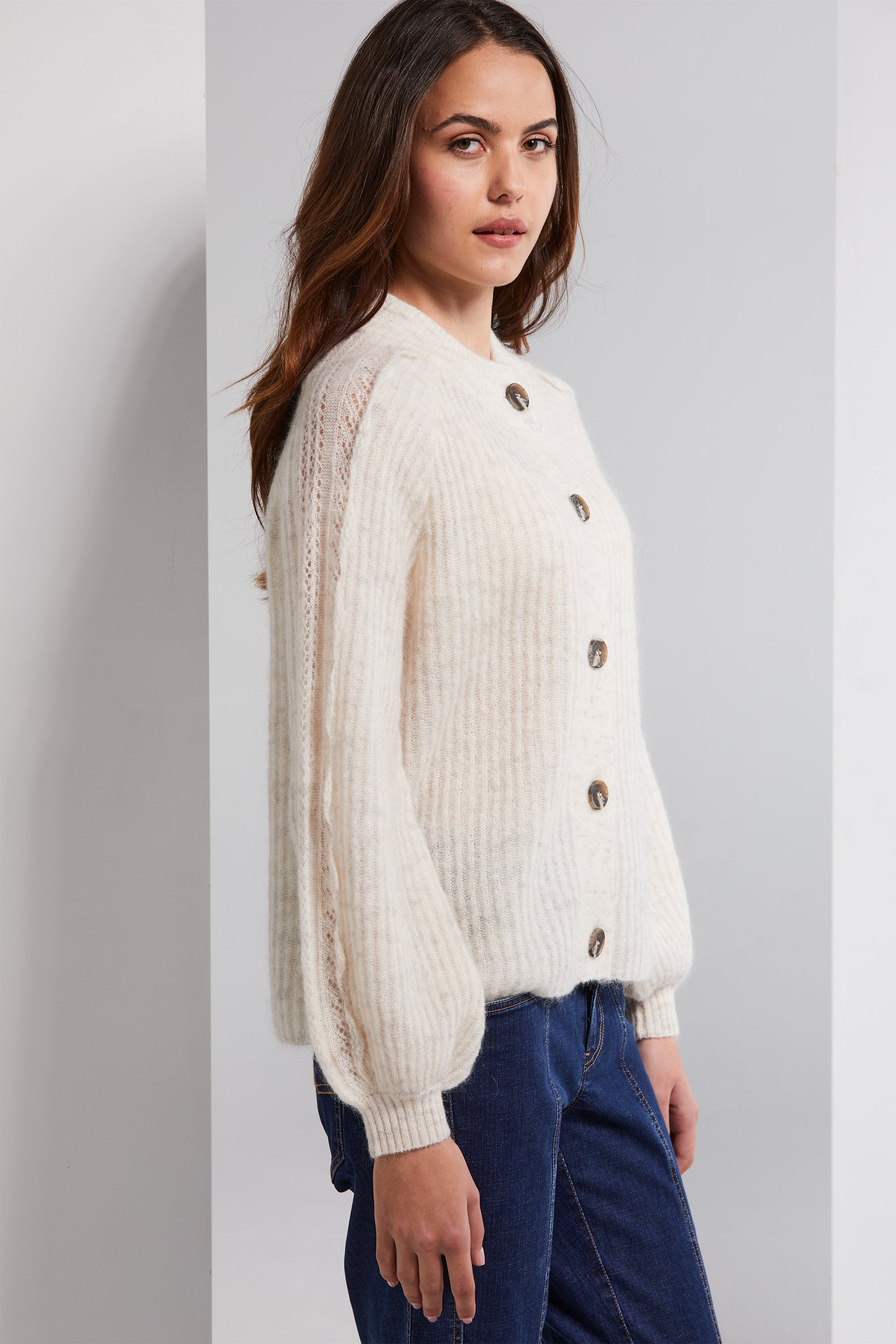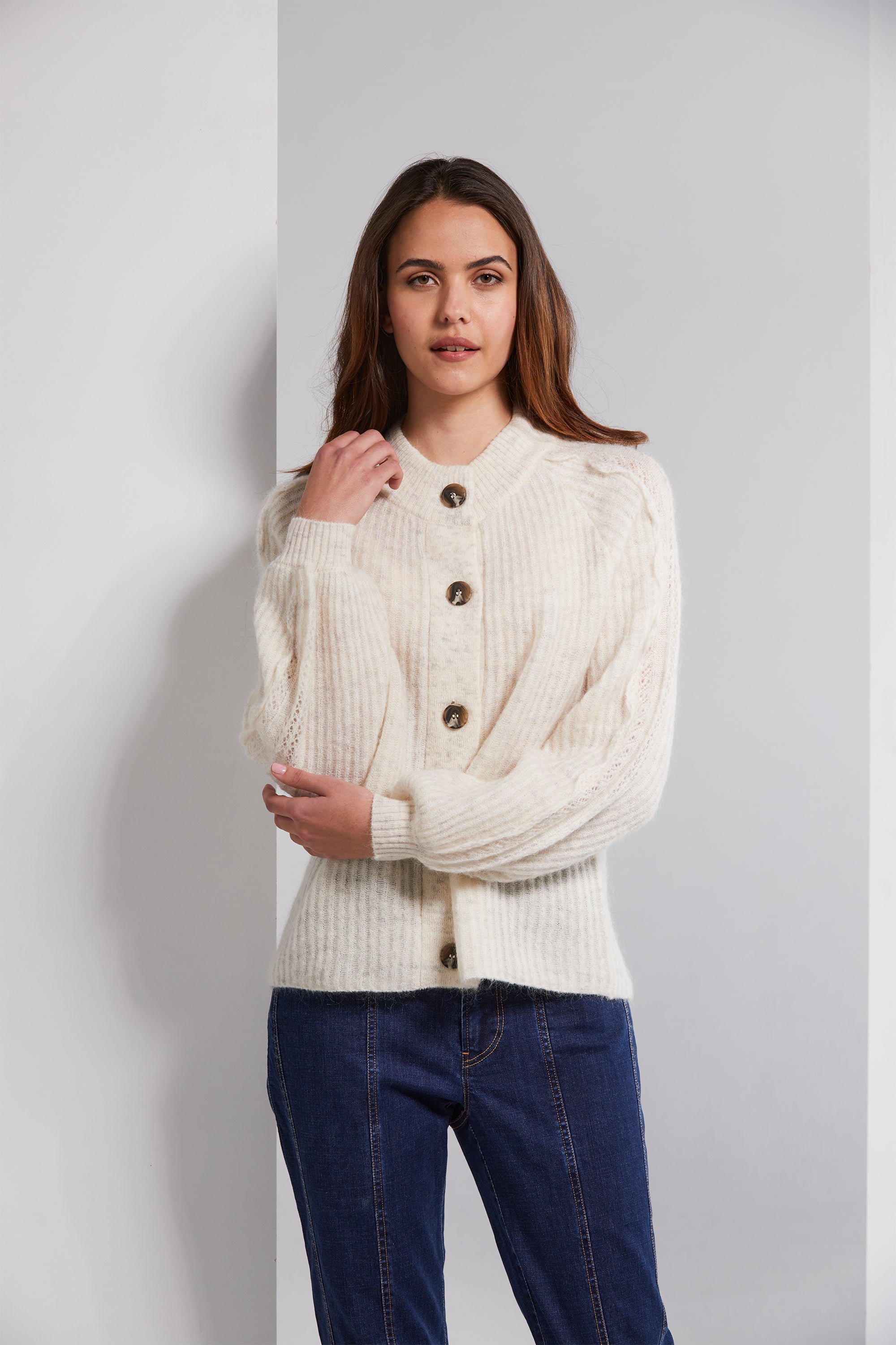 This super soft crew neck cardi with lace scallop detail along the sleeves will keep you warm this winter. The mohair wool blend knit in rich winter hues will add an opulent feel to your outfit. The Divine Cardi is an absolute must-have for winter.