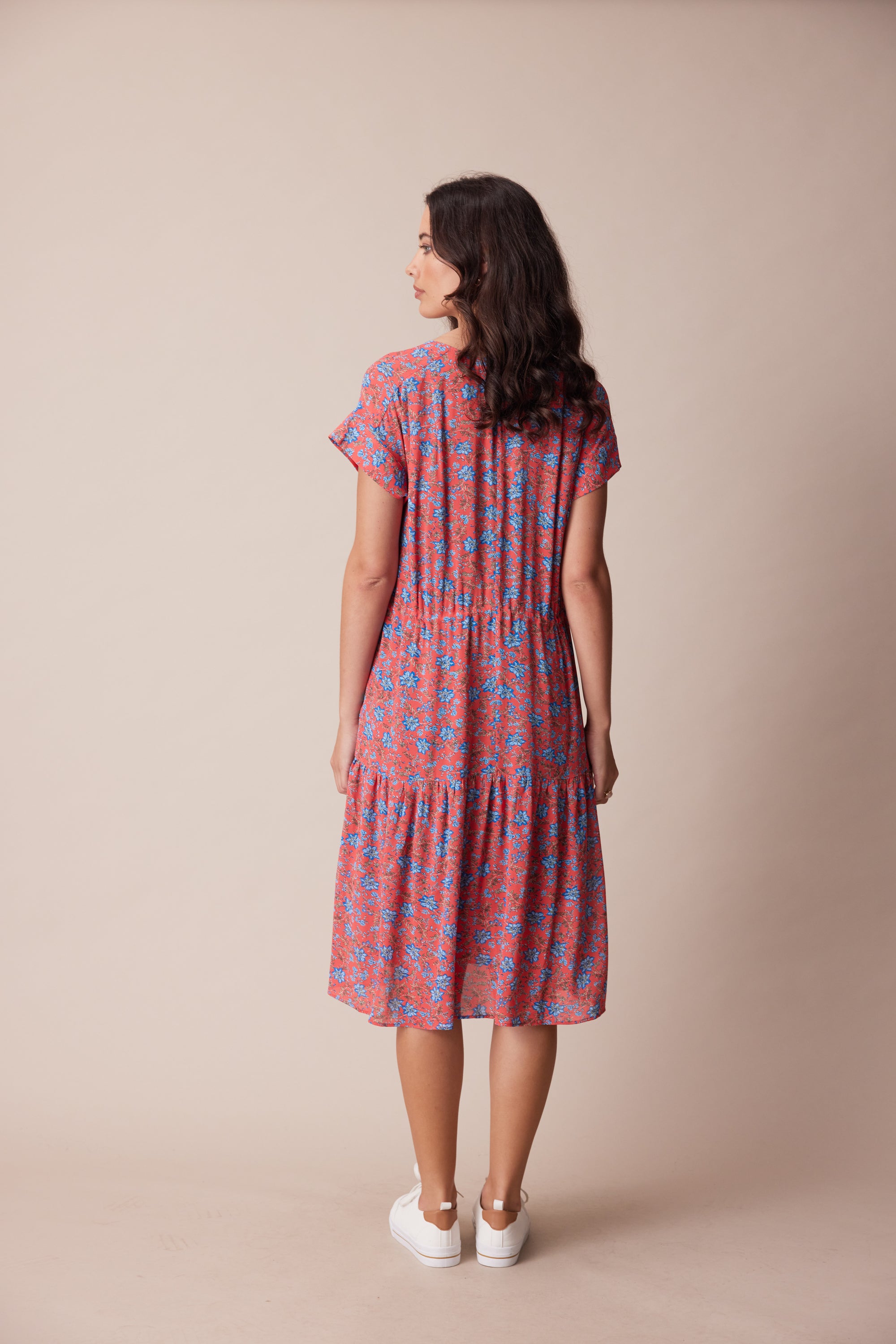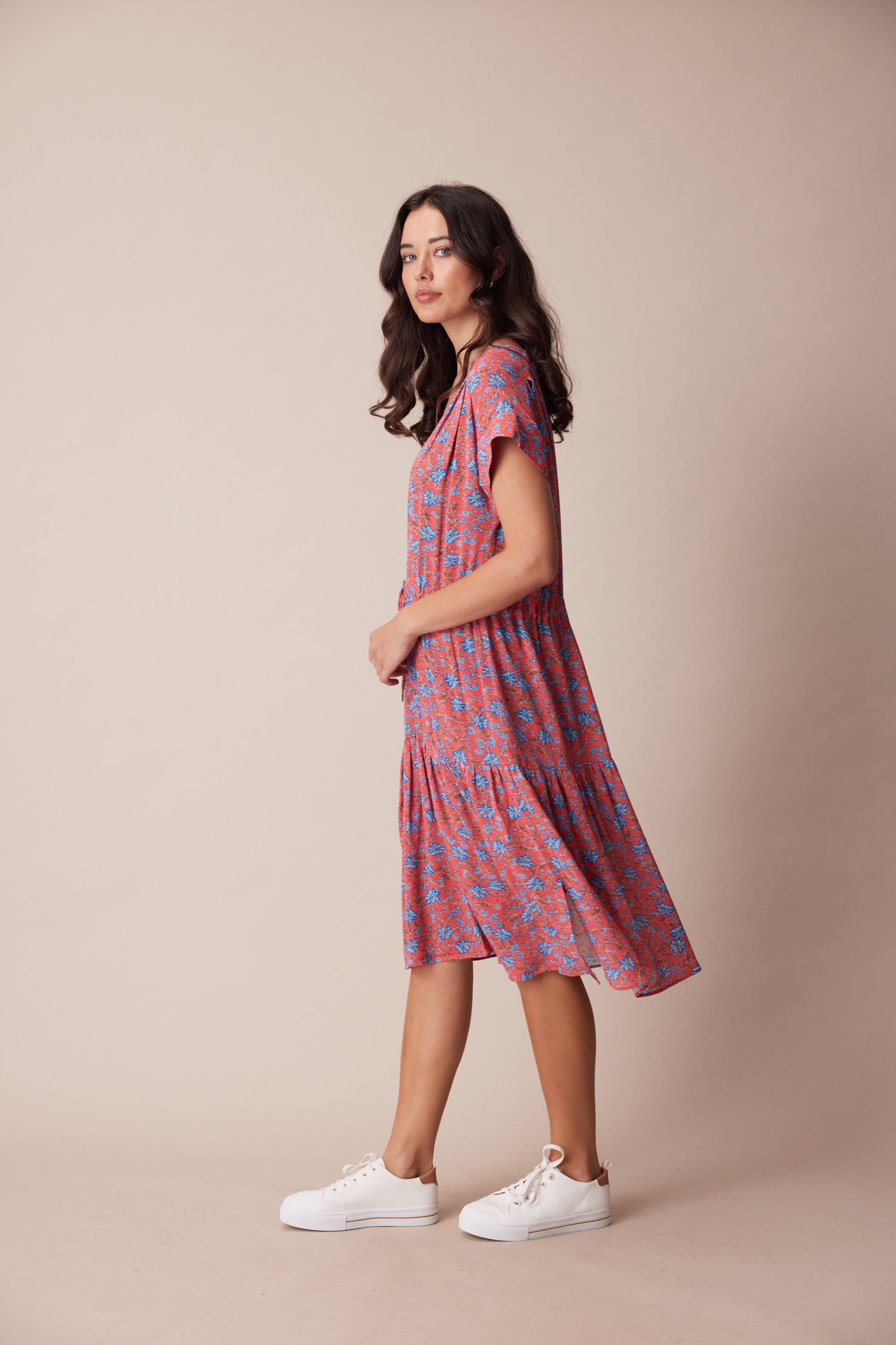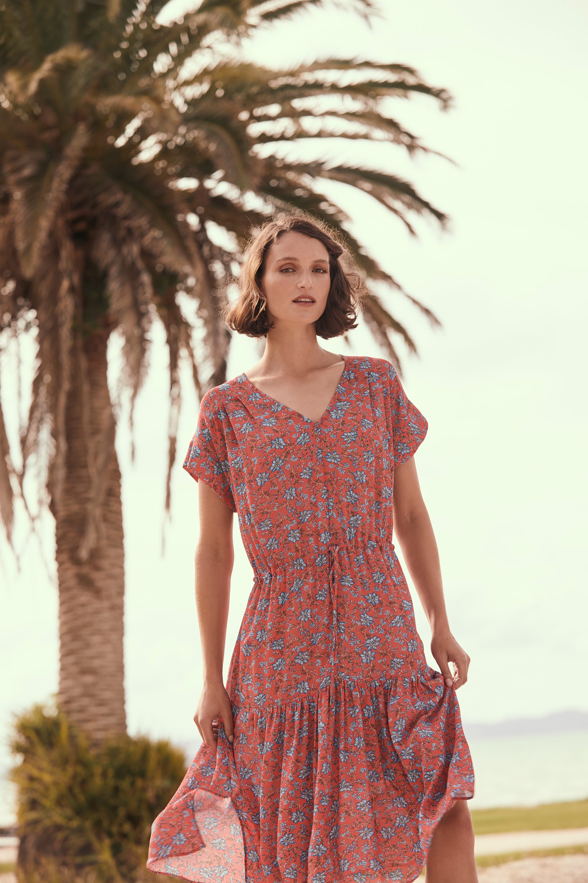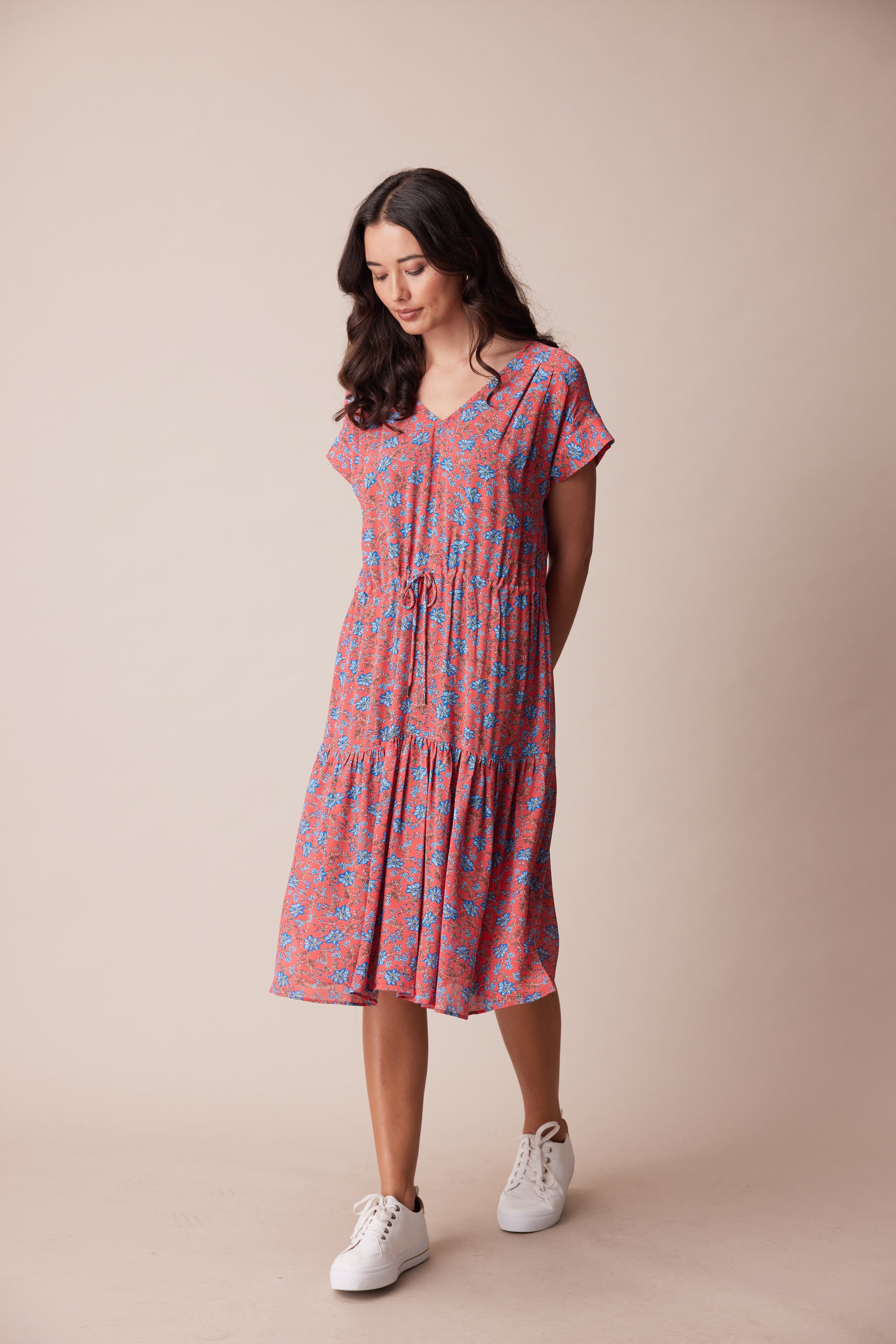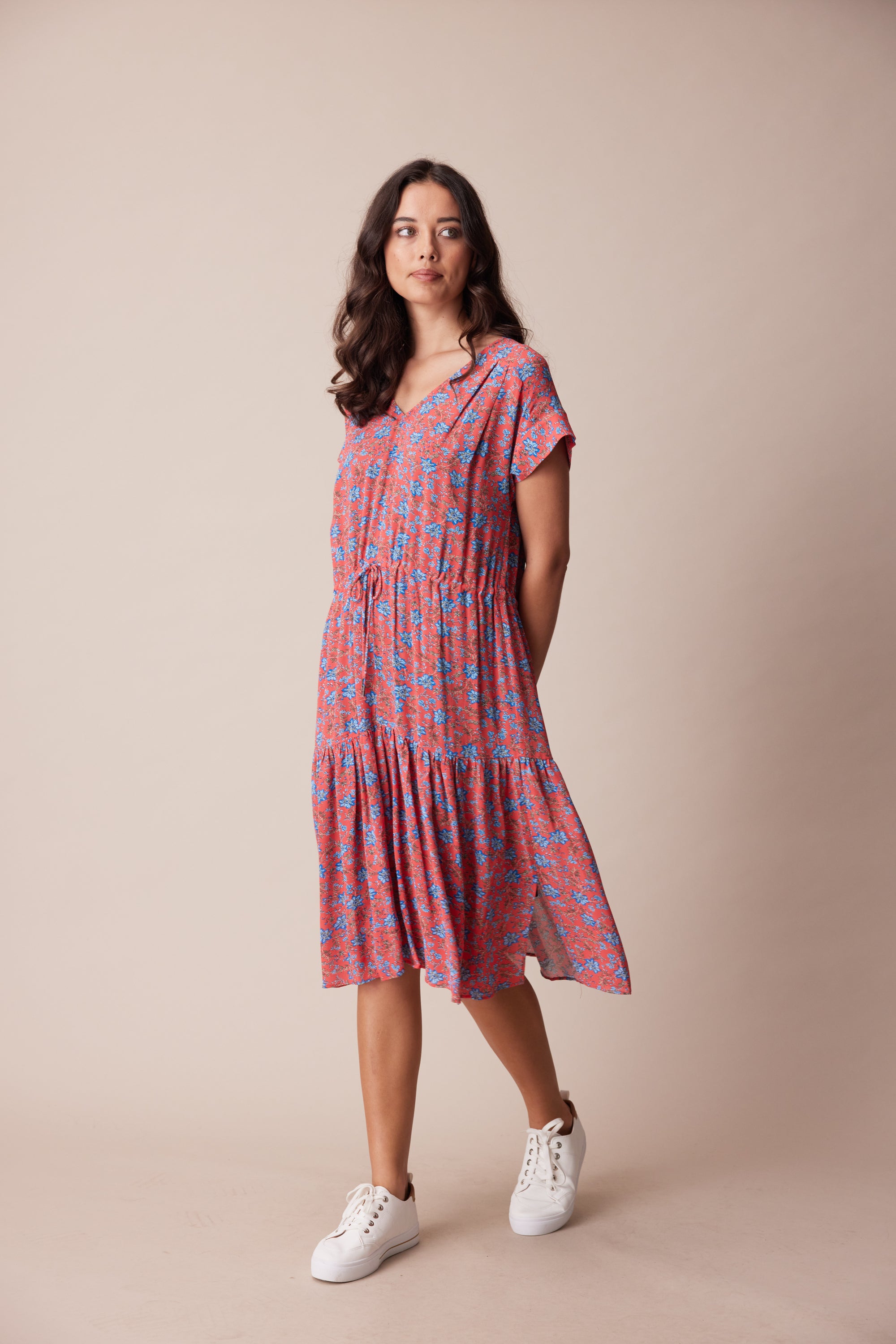 The delicate floral print in fluid georgette lends itself perfectly to the floaty, loose-fitting silhouette of the Dorset Dress. Bodice pleats and a lightly gathered skirt create a soft drape, whilst an adjustable waist tie lightly cinches the waist. A wide V-neck and soft cuff band add a modern touch to this ultra-feminine style.